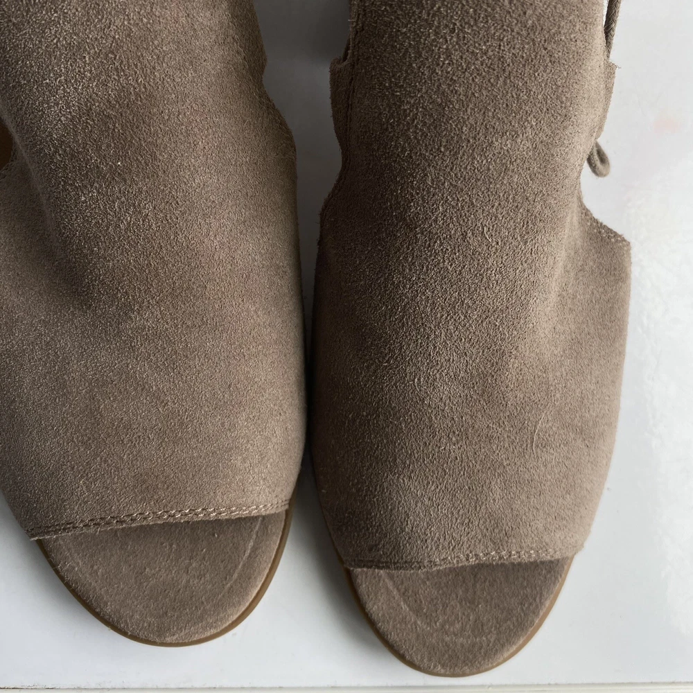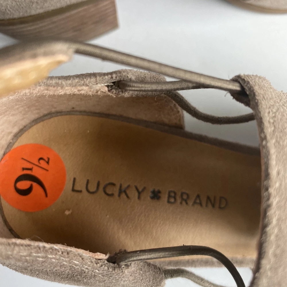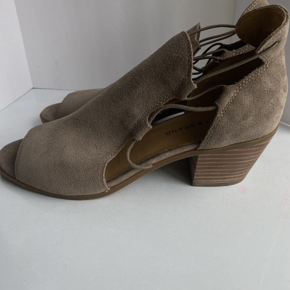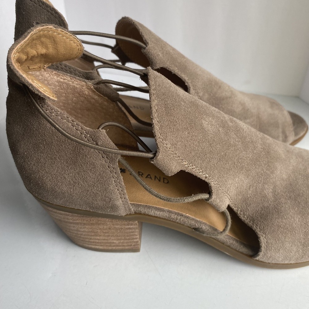 ******** please check all the pictures thoroughly thank you ****** Elevate your shoe game with these Lucky Brand peep toe booties. The slip on design with a chunky heel and cutout suede detailing make them perfect for any occasion - from casual to formal, workwear to party. The beige leather upper gives them a classic, versatile look that will go with any outfit. These booties are made for walking with their comfortable features, such as leather lining and insole. The studded accents add a fashionable touch, while the ankle-length shaft style shows off the peep toe design. Don't miss out on these must-have fashion and bohemian themed boots.