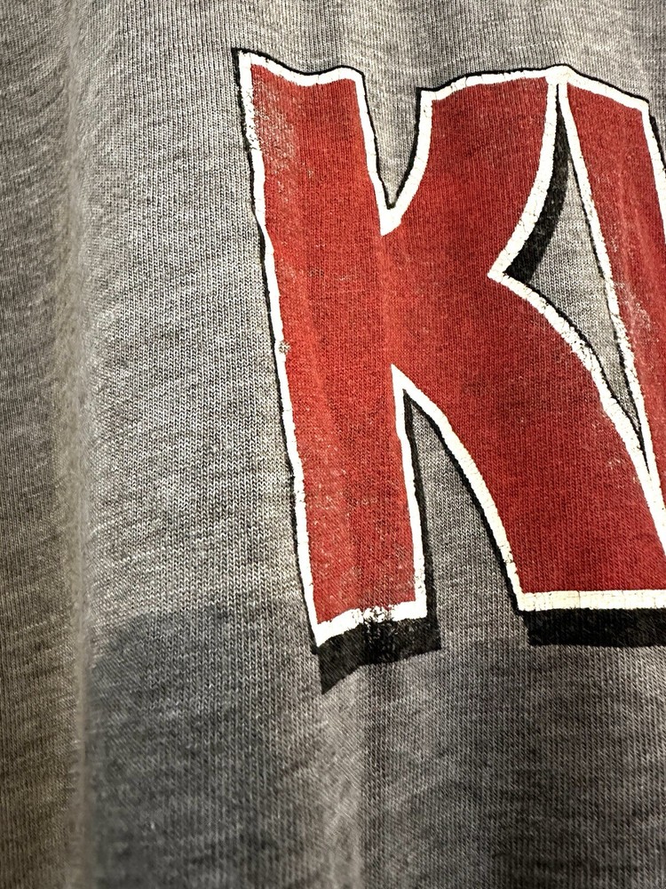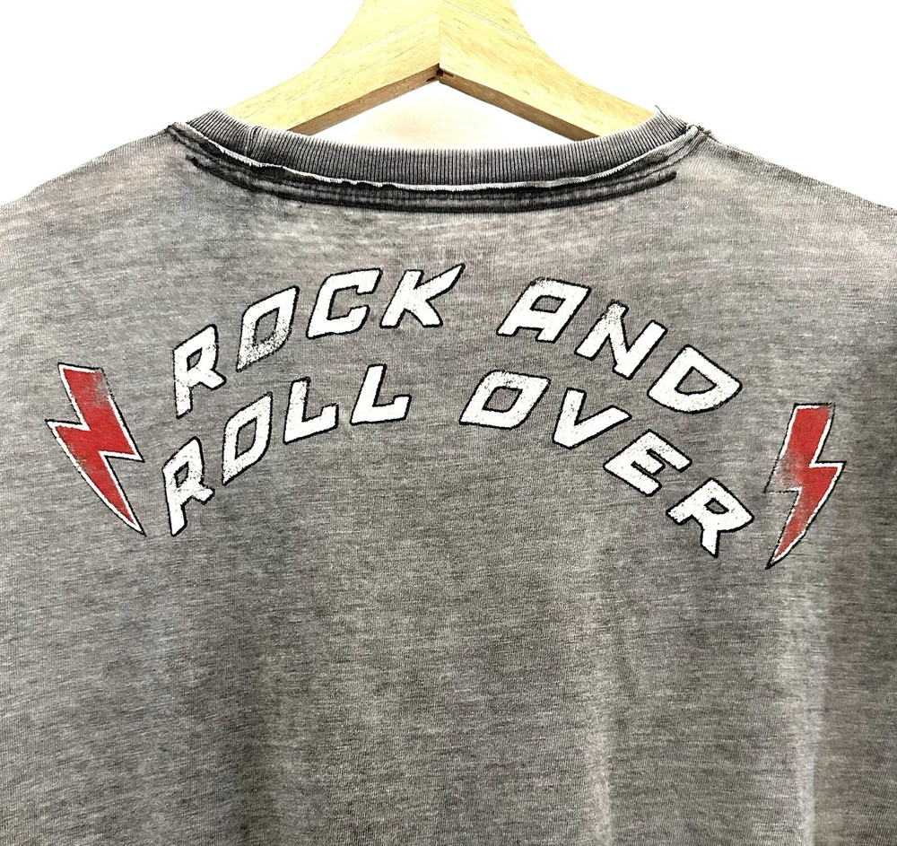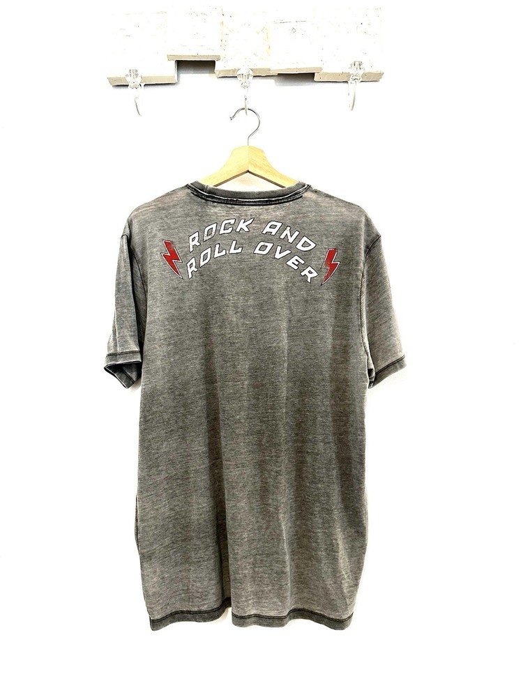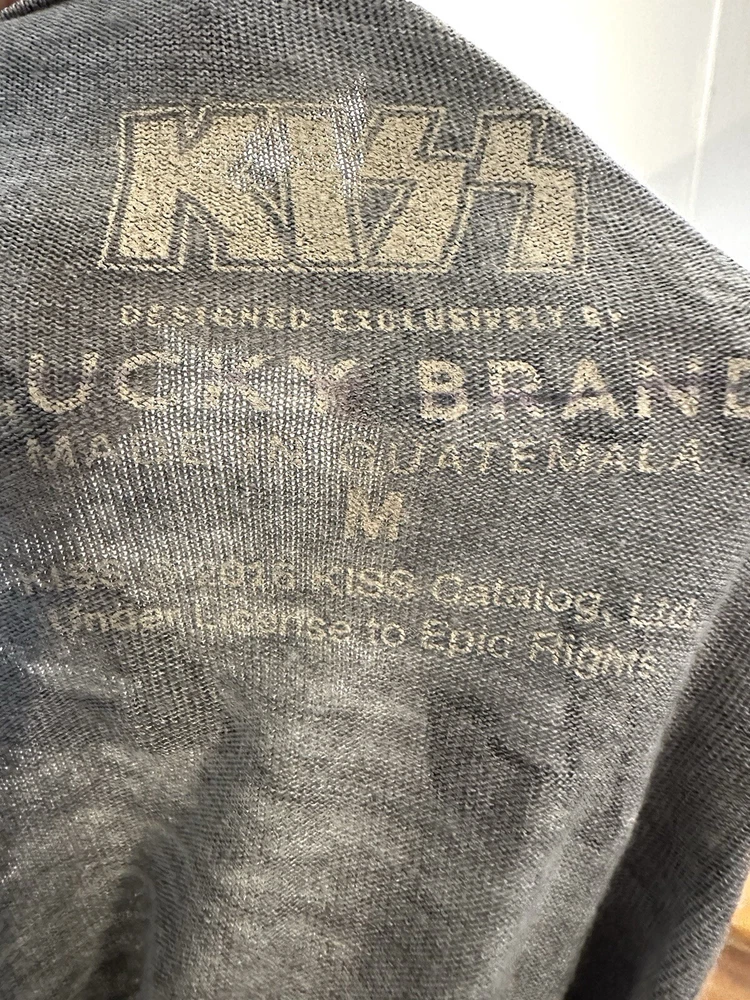 Show off your love for rock and roll with this colorful Lucky Brand Kiss graphic T-shirt. The shirt features a crew neckline and short sleeves, making it the perfect choice for any season. The double-sided shirt is made of comfortable cotton material and features a stylish logo accent. This T-shirt is perfect for any fan of the band or retro rock fashion. The shirt is available in size medium and has a regular fit. It's a great addition to any wardrobe and perfect for casual occasions. Get ready to turn heads with this eye-catching T-shirt.