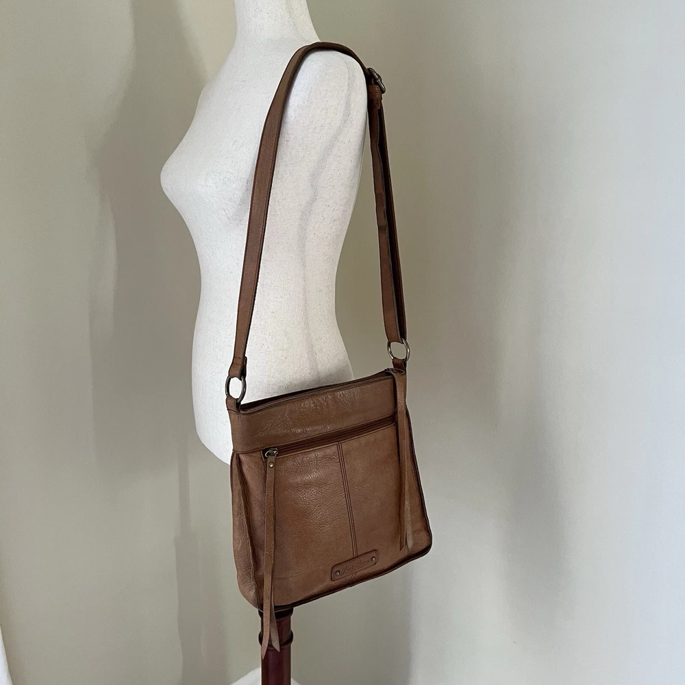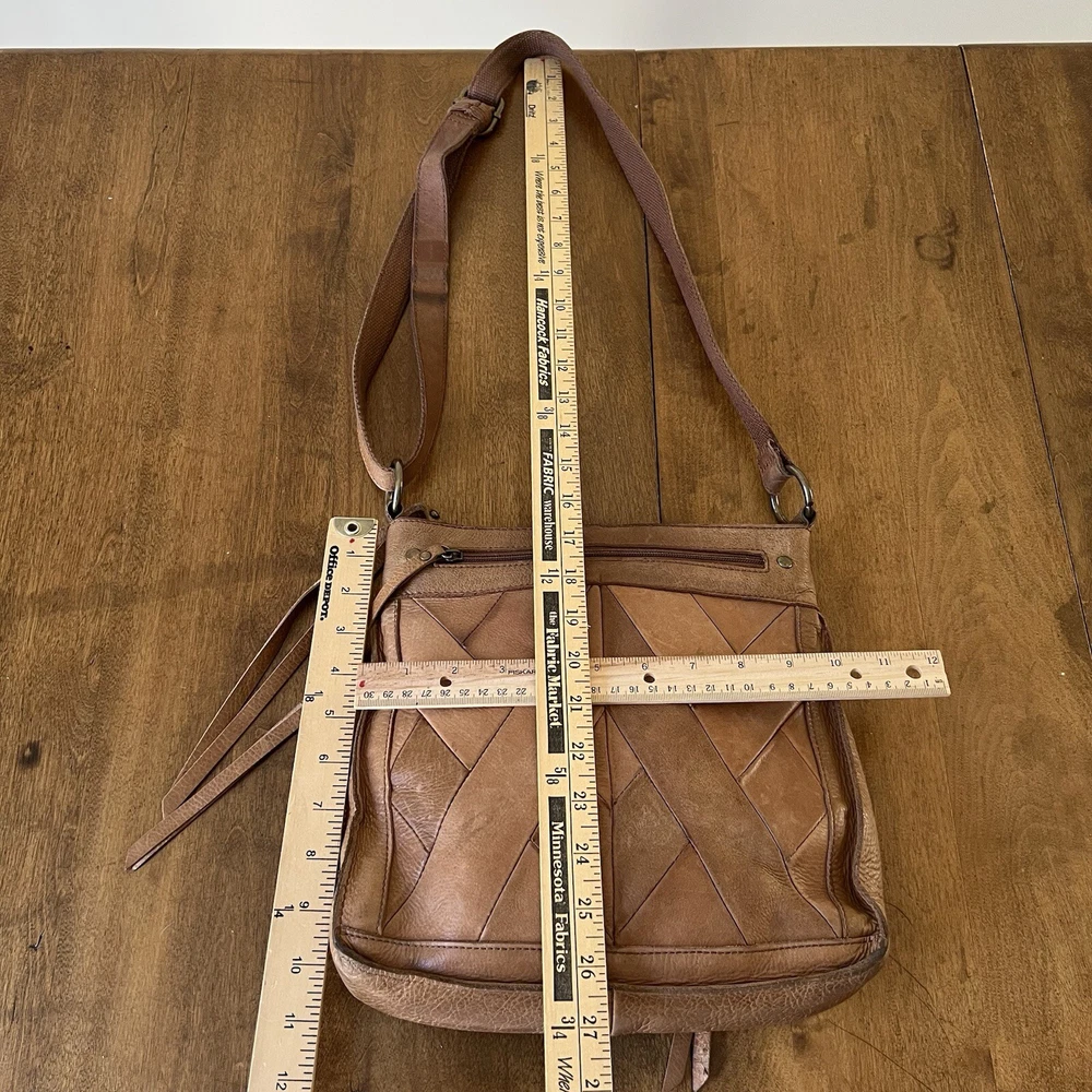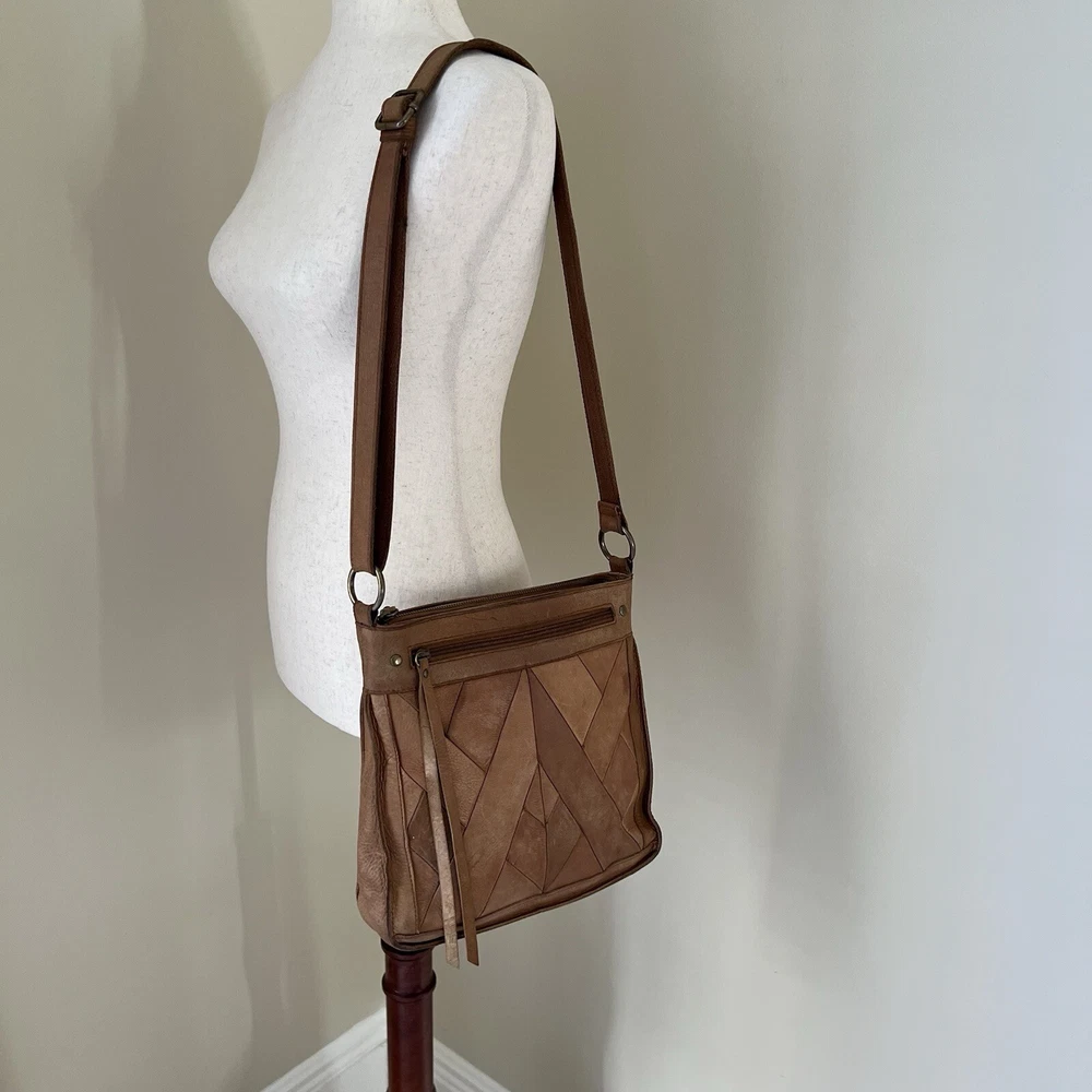 This Lucky Brand Rayla Crossbody Bag is a must-have for anyone who loves the bohemian style. The bag is made of high-quality brown leather and features a patchwork design that adds a unique touch to your outfit. It has a zip closure and an adjustable crossbody strap that allows you to carry it comfortably on your hip. The bag has a rectangular shape and measures 10.5 inches in height, 10 inches in width, and 3 inches in depth. It has brown tassels and a zipper for added security. The interior is lined with brown fabric and has inner pockets for easy organization. This bag is perfect for travel and casual occasions. Get your hands on this Lucky Brand Rayla Crossbody Bag today!