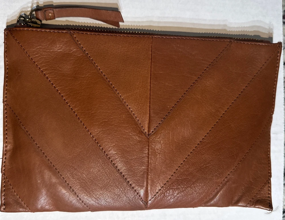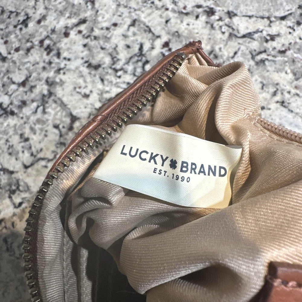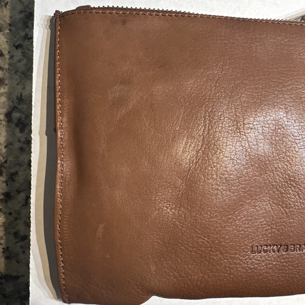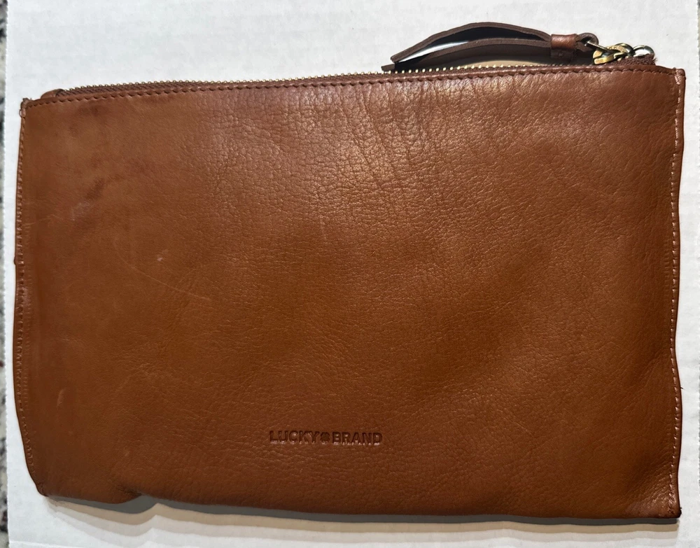 Some minor wear on leather still in good condition see photos The Lucky Brand Rayla Leather Clutch in Saddle Brown is a medium-sized women's handbag featuring a zip closure and antique brass hardware. Crafted from leather with polyester lining in a gold color, this stylish clutch includes a wristlet for added convenience. The exterior accents include a zipper, making it a fashionable accessory for any occasion.