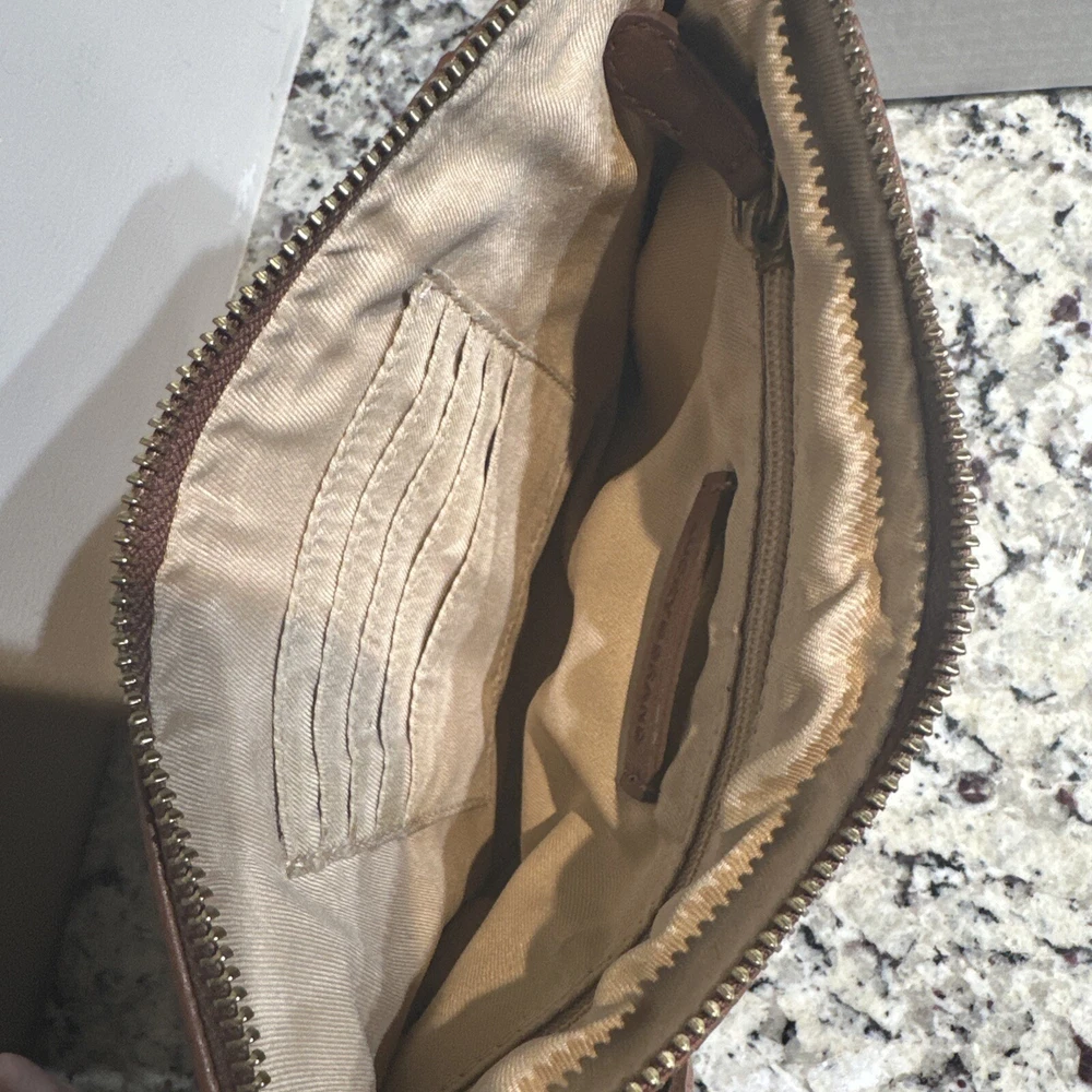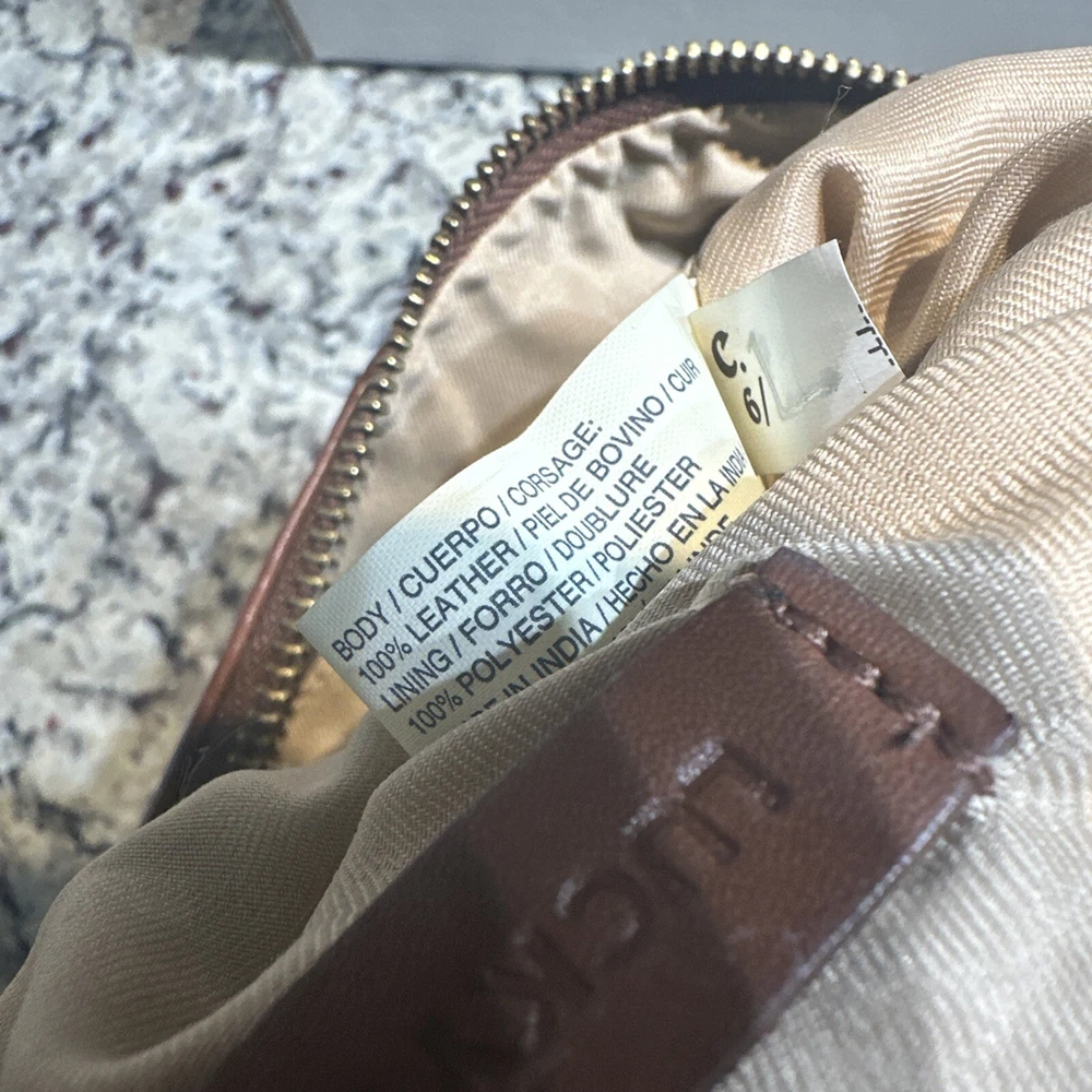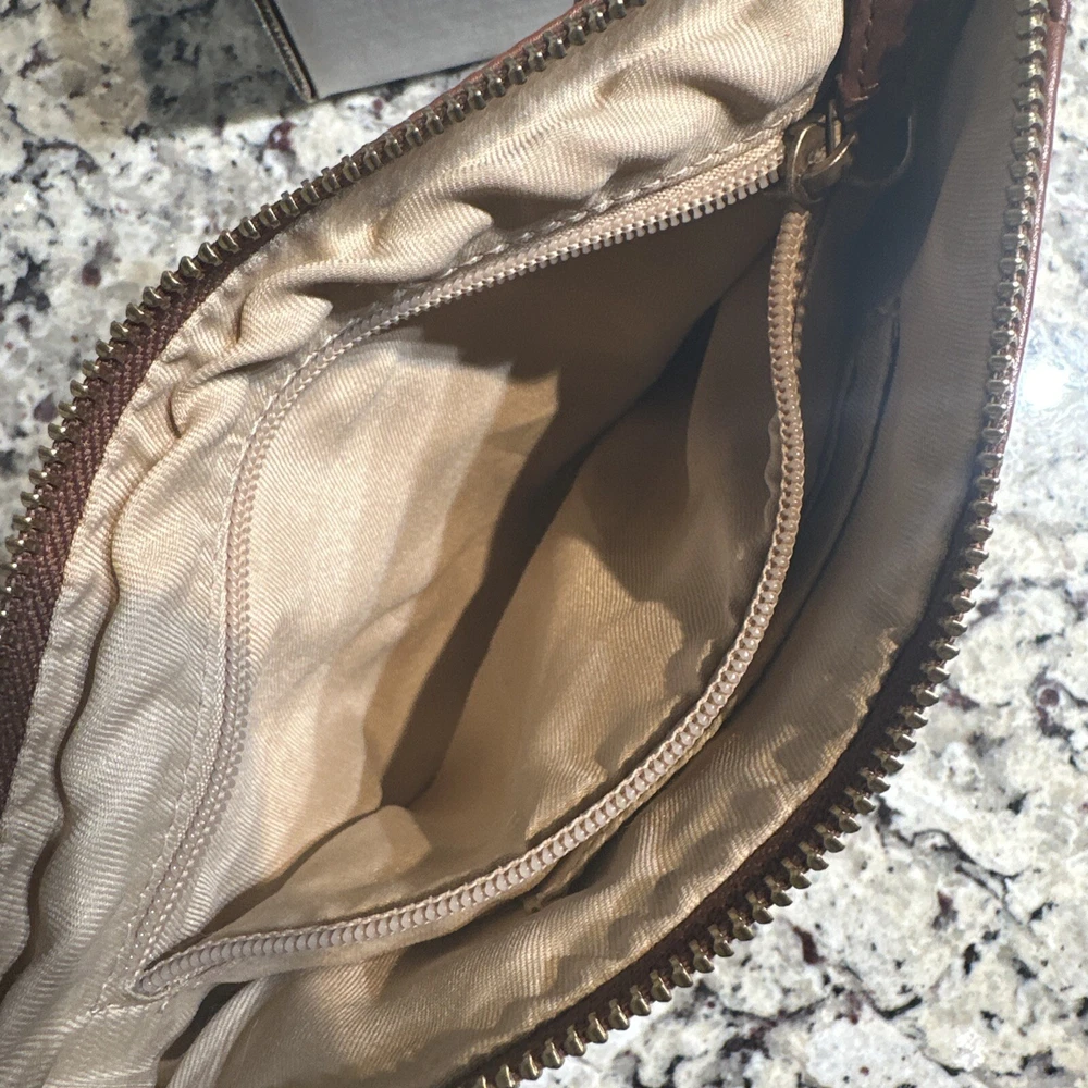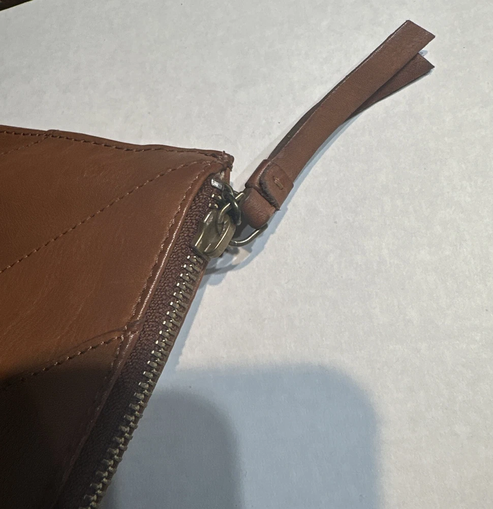 Some minor wear on leather still in good condition see photos The Lucky Brand Rayla Leather Clutch in Saddle Brown is a medium-sized women's handbag featuring a zip closure and antique brass hardware. Crafted from leather with polyester lining in a gold color, this stylish clutch includes a wristlet for added convenience. The exterior accents include a zipper, making it a fashionable accessory for any occasion.