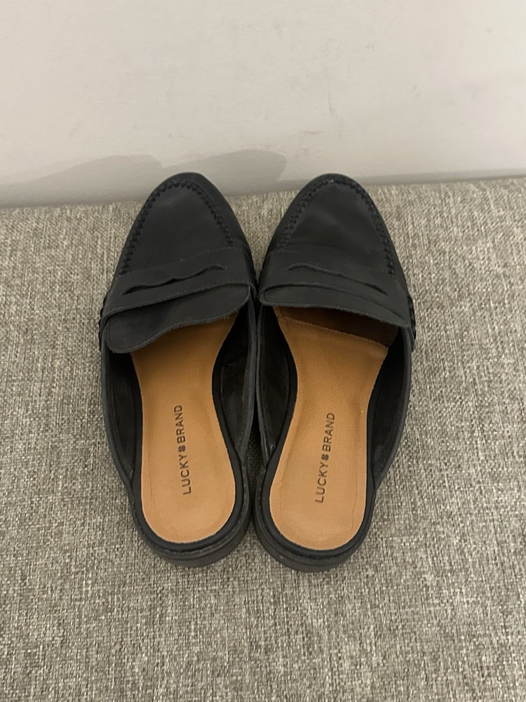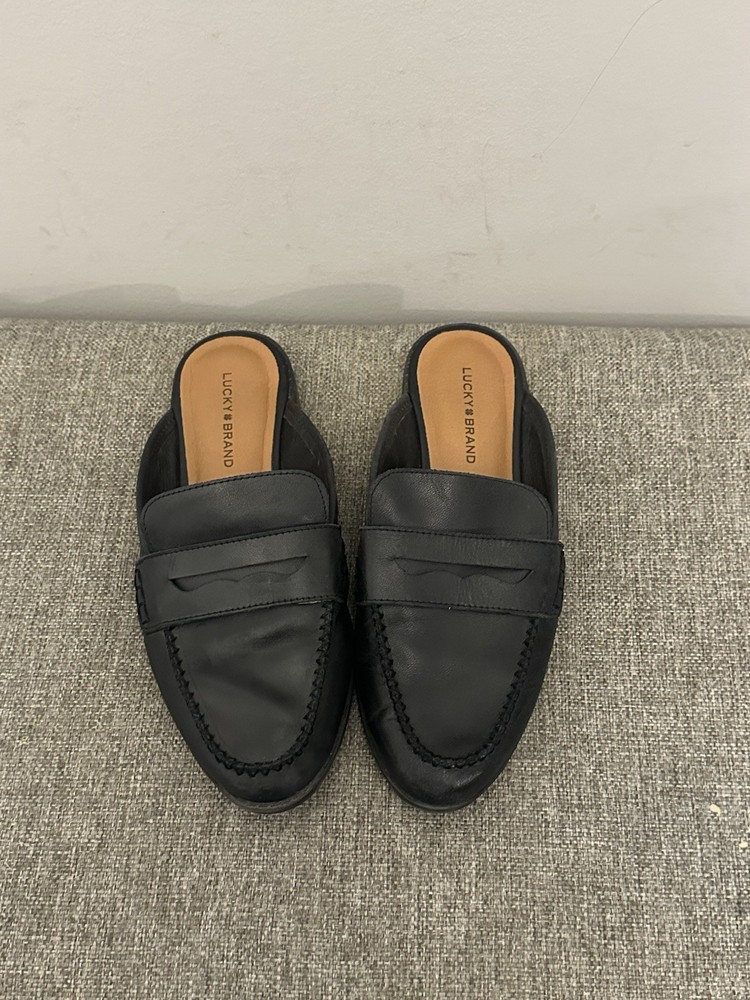 These Lucky Brand Women’s Black Leather Slip On Mule Penny Loafers in size 7.5 offer a stylish and comfortable option for casual or businesswear. The almond toe shape and slip-on style make them easy to wear, while the leather lining and insole provide a luxurious feel. With a rubber outsole for traction, these loafers are lightweight and designed for all-day comfort. The classic black color and preppy theme make them versatile for various occasions, making them a staple in any woman's wardrobe. Preowned Good Condition
