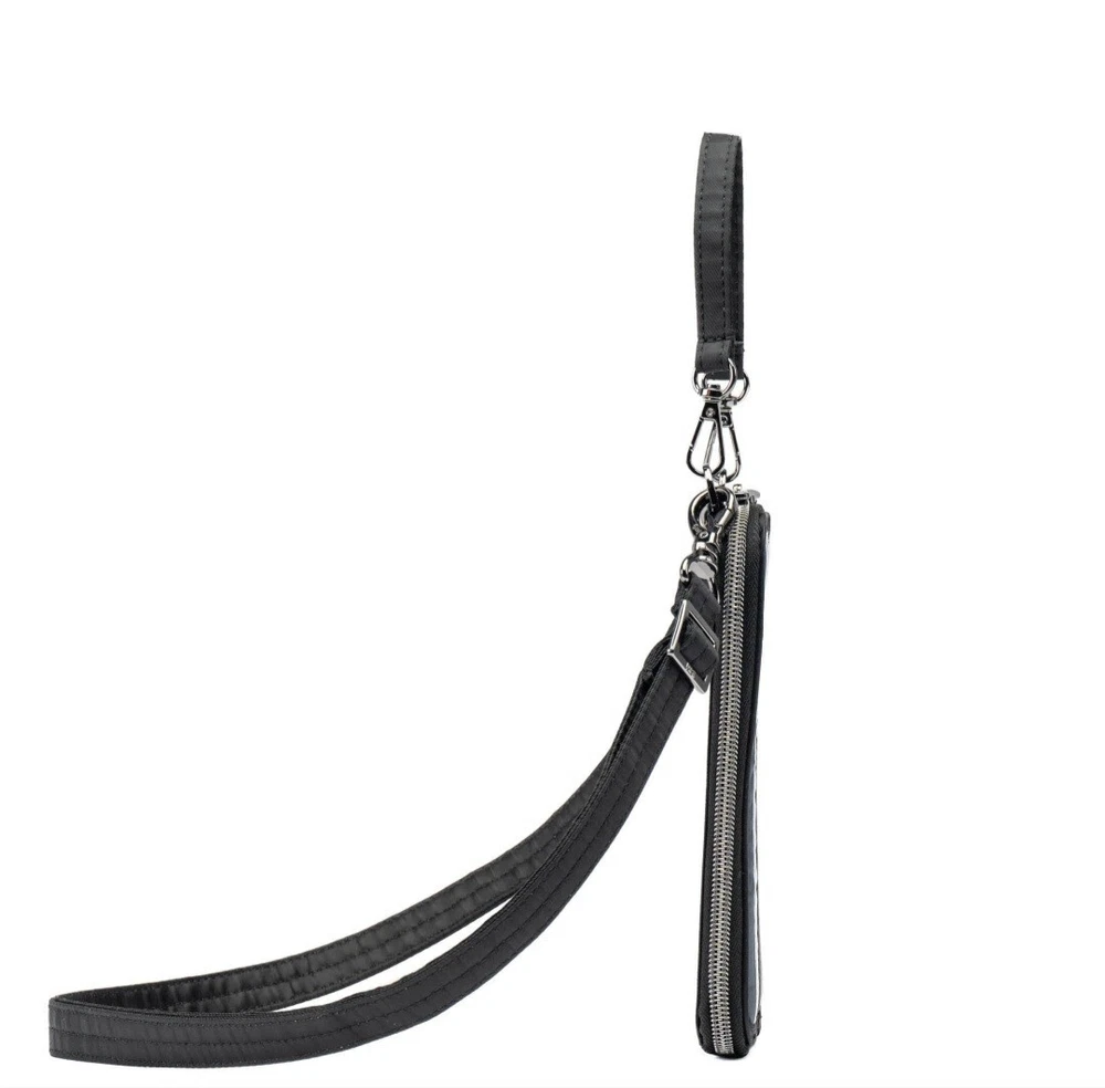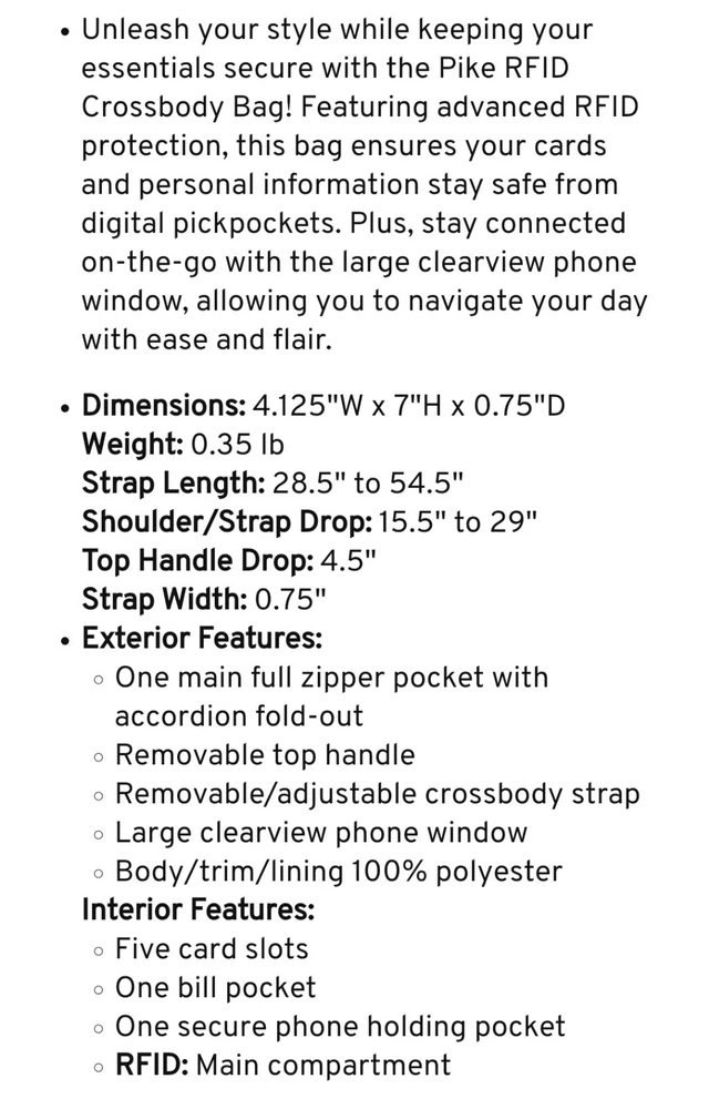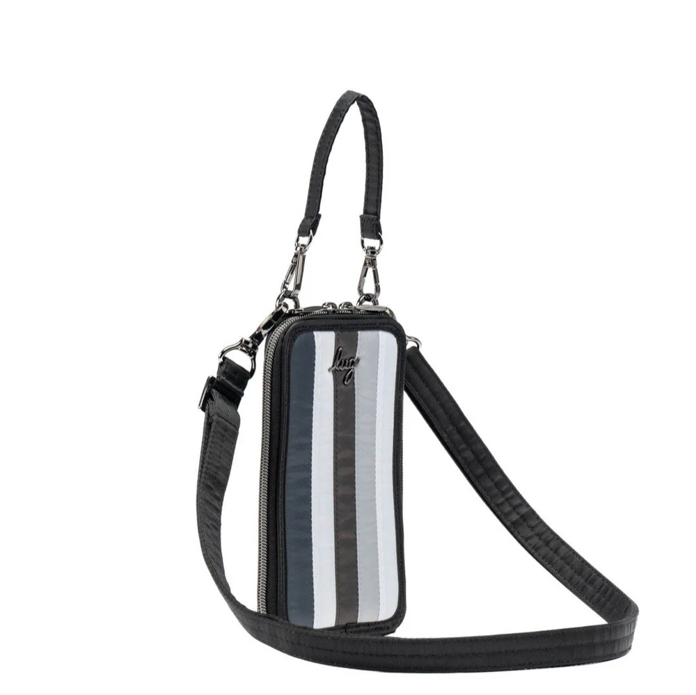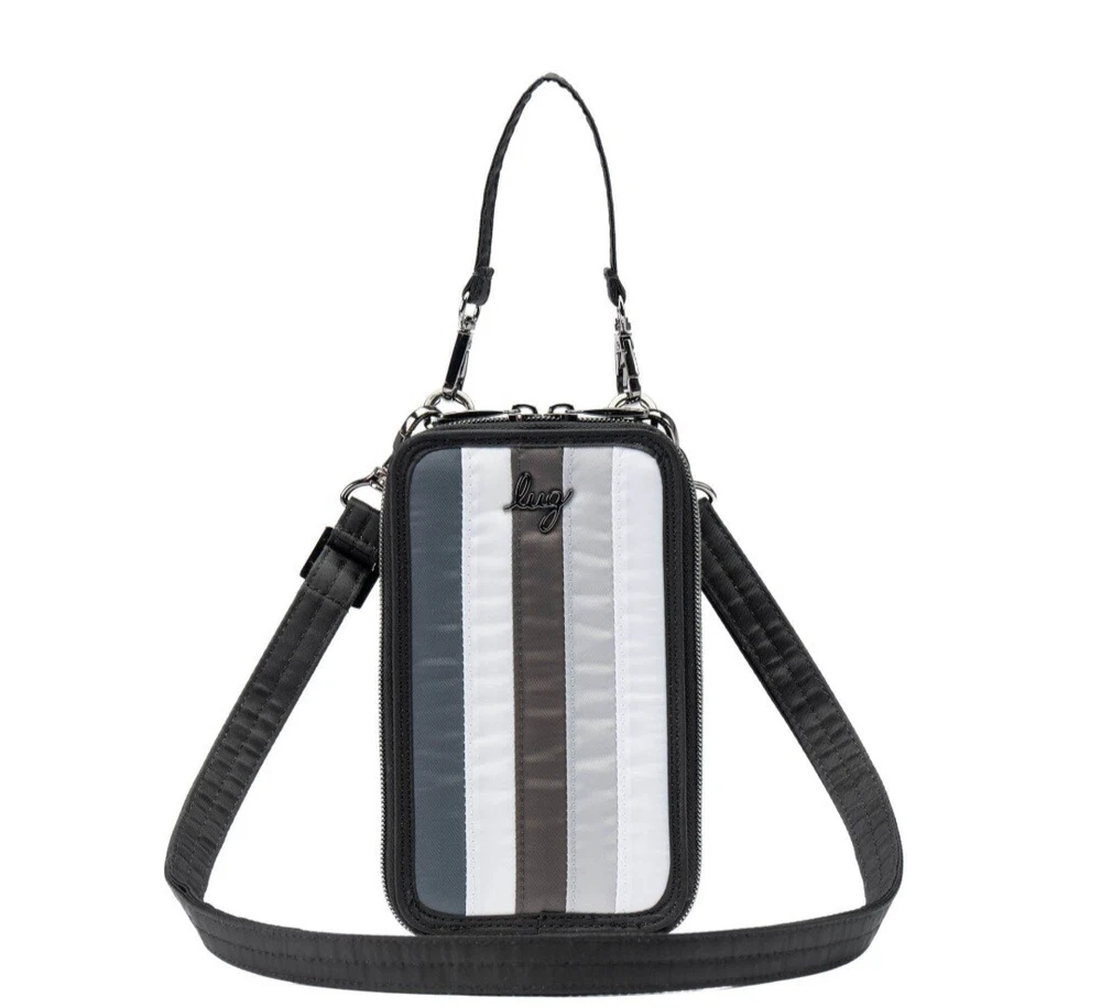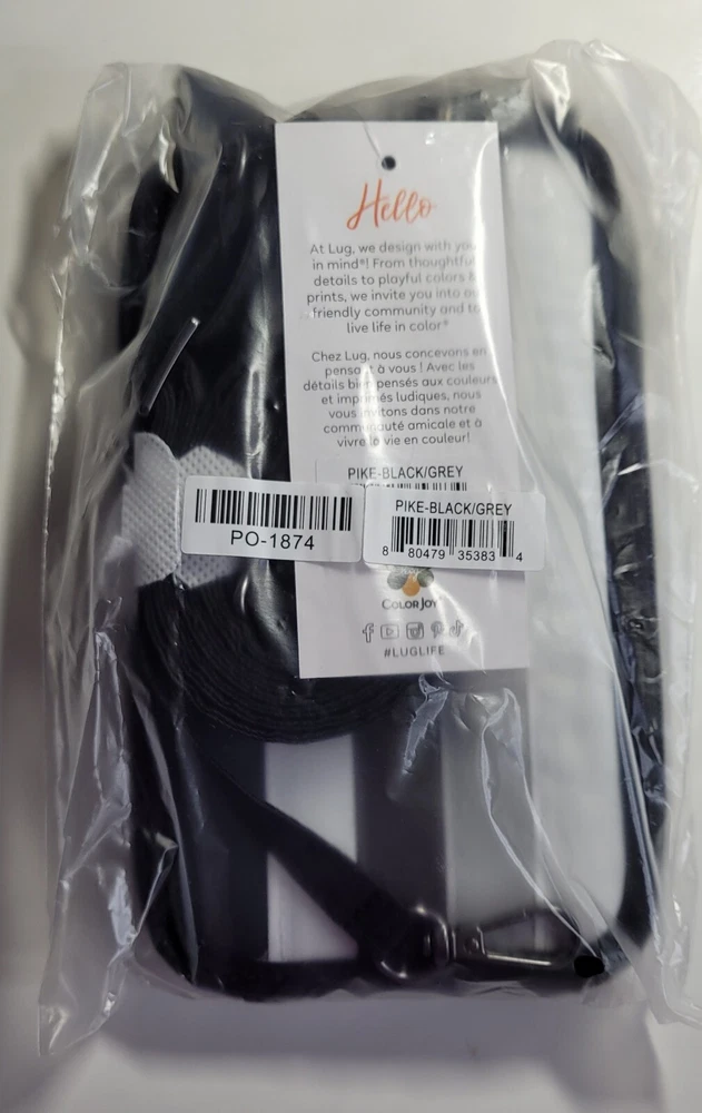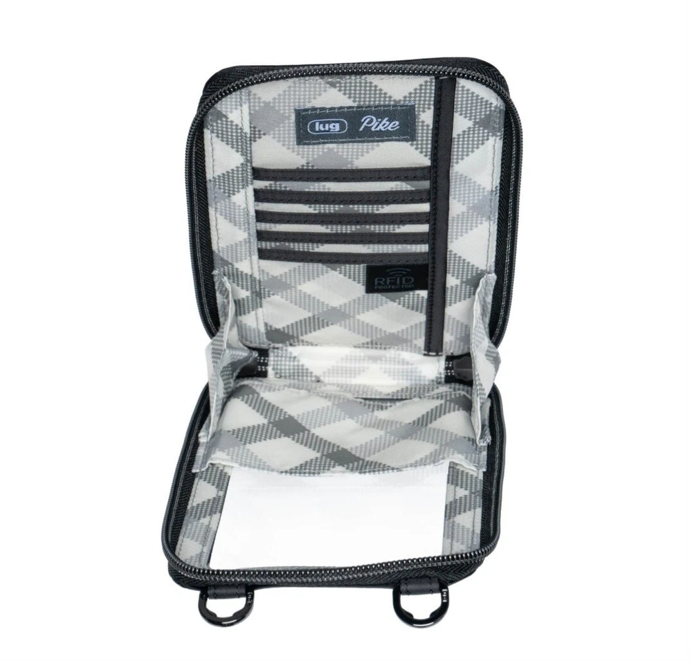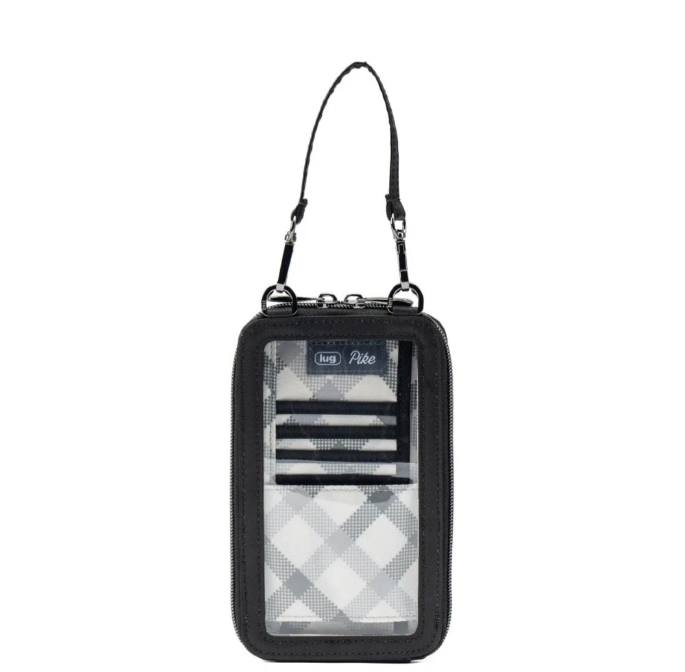 Introducing the Lug Pike crossbody bag, a versatile accessory suitable for various occasions. This bag features a black, grey, and white color scheme with a clear window for phone viewing. It has a rectangular shape with a zip closure and measures 4.125 inches in width, 7 inches in height, and 0.75 inches in depth. The bag has a crossbody strap and top handle with a handle drop of 4.5 inches and a strap drop ranging from 15.5 to 29 inches. It is made of polyester with a grey lining and gunmetal hardware. The bag has inner pockets, organizers, and dividers, making it an ideal choice for travel, weddings, parties, cocktail events, casual outings, formal events, workwear, and business. See pictures.
