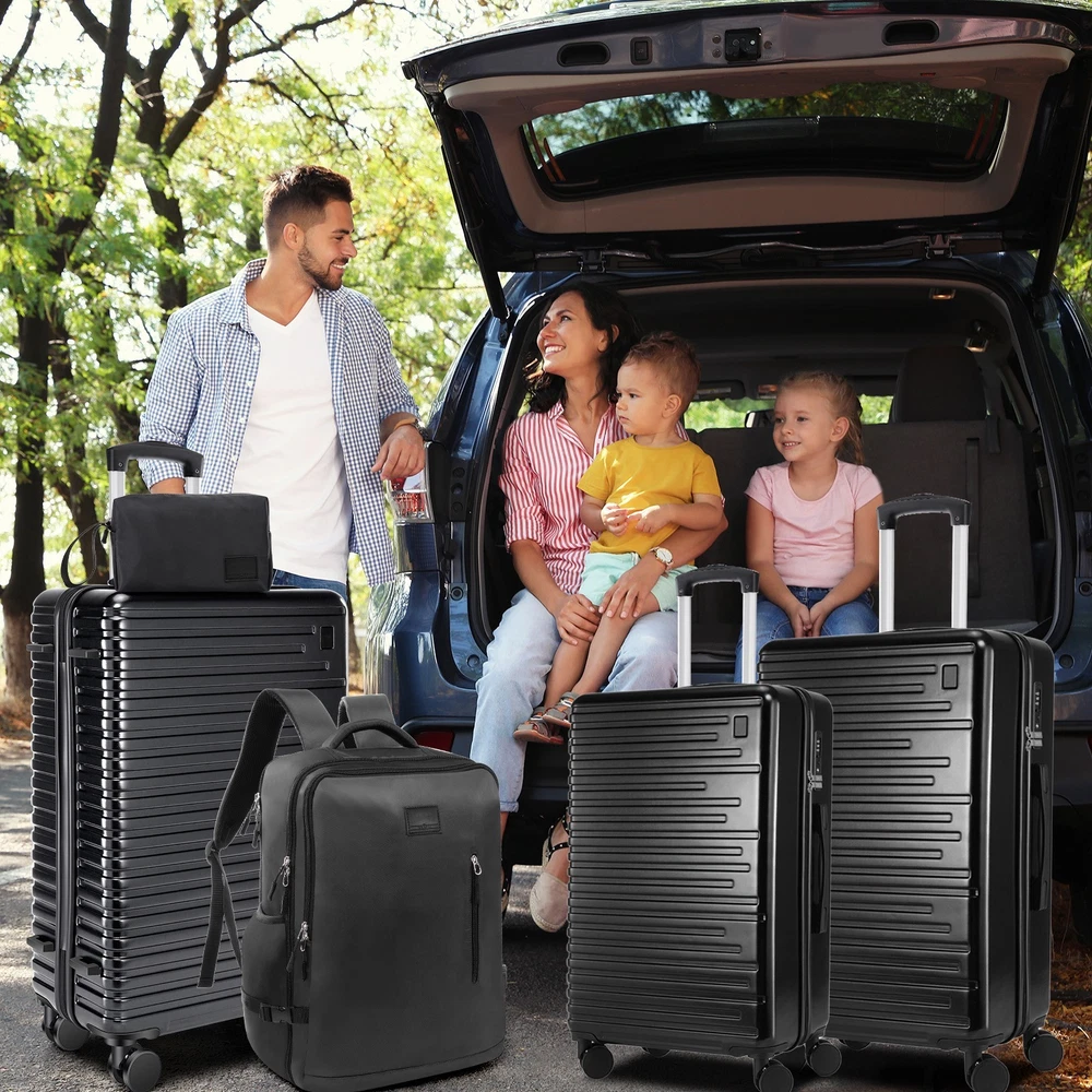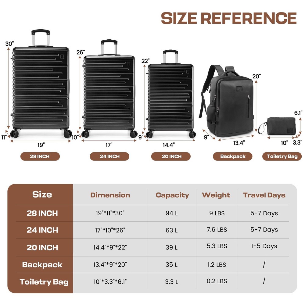 Description 5 Piece Luggage Sets, PC+ABS Hardshell Travel Suitcase with TSA Lock, 20/24/28 Inch Spinner Wheel Luggage Set Includes Backpack & Toiletry Bag Features: 【5 Piece Luggage Set】Your ultimate travel solution includes a 20-inch carry-on, a 24-inch checked suitcase, a 28-inch large cargo case, a handy lightweight backpack, and a compact toiletry bag, perfectly designed for both short getaways and extended voyages. 【High-Quality Materials】Built with a tough PC+ABS hardshell, this suitcase is both lightweight for easy carrying and highly resistant to impacts and scratches, ensuring your belongings are protected on any journey. 【TSA Lock & Zipper】The built-in TSA-accepted lock ensures security and peace of mind during inspections. Inside, compression straps and mesh pockets keep your clothes and essentials neatly secured and easy to access. 【8 Smooth Rolling Silent Wheels】Eight multi-directional spinner wheels on each suitcase provide smooth gliding and flexible turning in any direction, making travel through airports and city streets remarkably easy and quiet. 【4 Years of After-Sales Service】All parts, including suitcase handles, handles, wheels, and straps, can be replaced if damaged. If you have any questions or concerns about our products, please feel free to contact us Payment 1 . We accept PayPal only. 2 . Payment should be completed within 4 (Four) days of auction closing. Or unpaid dispute will be filed for closing auction. 3 . Sales Tax of 9% will be applied for orders shipped within the state of California 4 . We will leave a positive feedback immediately after payment is received. We appreciate a positive feedback as much as you do. If for some reason there is any issue with the purchase, please contact us prior to leaving feedback, and we will be glad to work with you to have it resolved. Shipping 1 . We Ship to United States ONLY. 2 . Ship from two warehouses and only to eBay ADDRESS. Package handling only takes 1 business day at our warehouse, so please make sure entering correct payment and shipping information before checking out. Once your payment is completed, pls leave ebay note if the changes are needed before we send the product. 3 . Truck company: 3-8 business days. | USPS: 2-6 business days. | UPS/FEDEX: 3-5 business days. 4 . Lccal pick up is available. Warranty and Guarantee 1 . All of our items come with a 30-day return policy. We ensure all our items are new and in excellent condition prior to shipping. In the event that you receive the item that is not to the standards above, please contact us via e-Bay messages. All returns must be in new original condition as received and should be shipped with delivery confirmation 2 . We ONLY accept the return for original package. Please make sure that item has NO man-made sabotage. Used items will not be accepted for return. 3 . We reserve the right to refuse any returns for objective reasons. 4 . All NON-seller mistake returns for refund are subject to 20% re-stocking fee and buyer should pay for the round-trip shipping fee. (E.g. you bought wrong model or wrong color). Feadback 1 .Any problem after receiving our goods,please contact us before leaving Neutral/Negative feedback.We promise to help you solve it asap,and make you feel satisfactory absolutely. 2 . Please DO NOT leave negative feedback without asking for help. Please do not leave negative or neutral feedback if you haven't received item in 30 days, because we have mentioned the shipping time repeatedly.