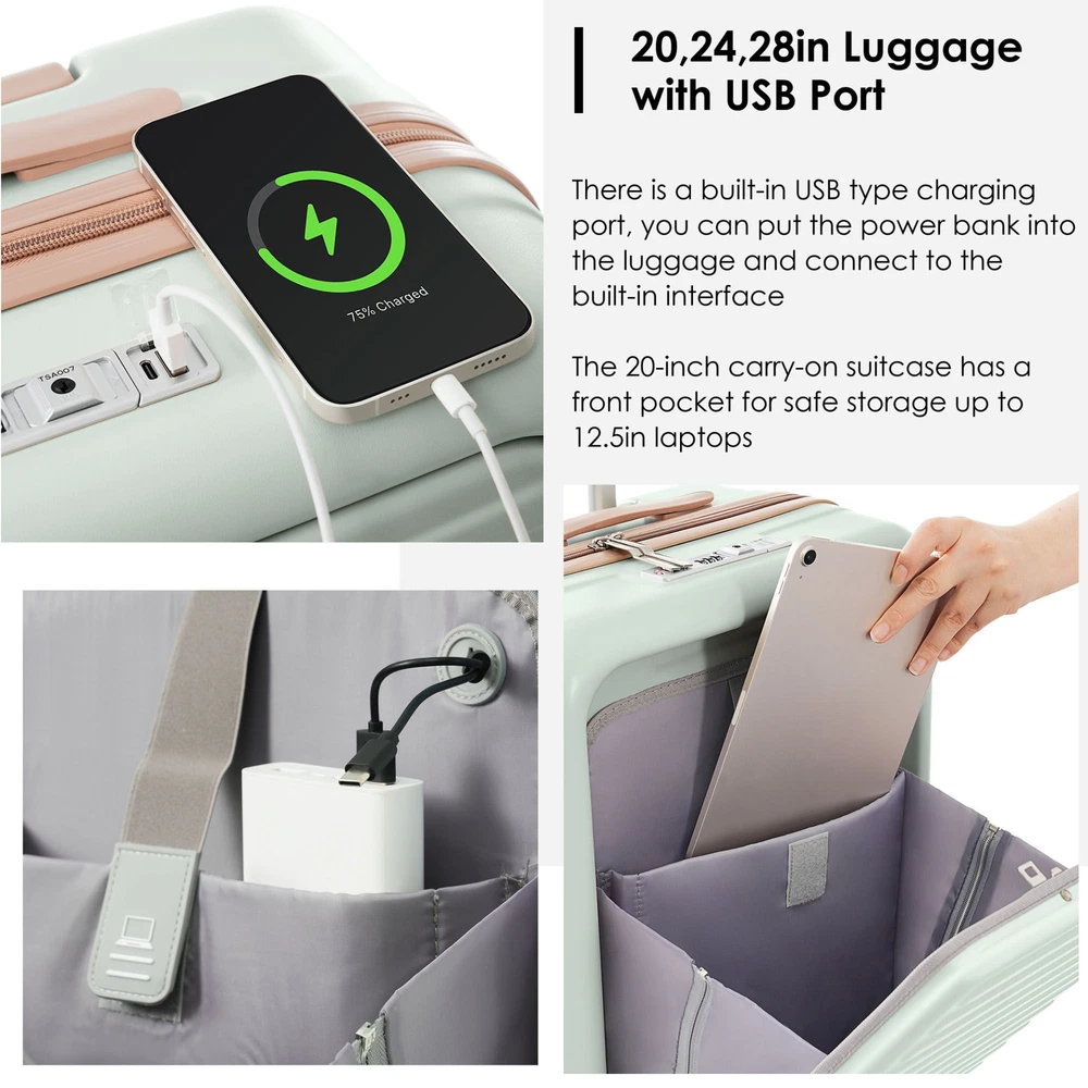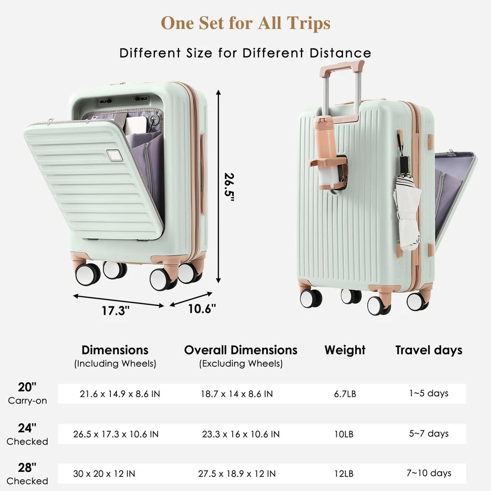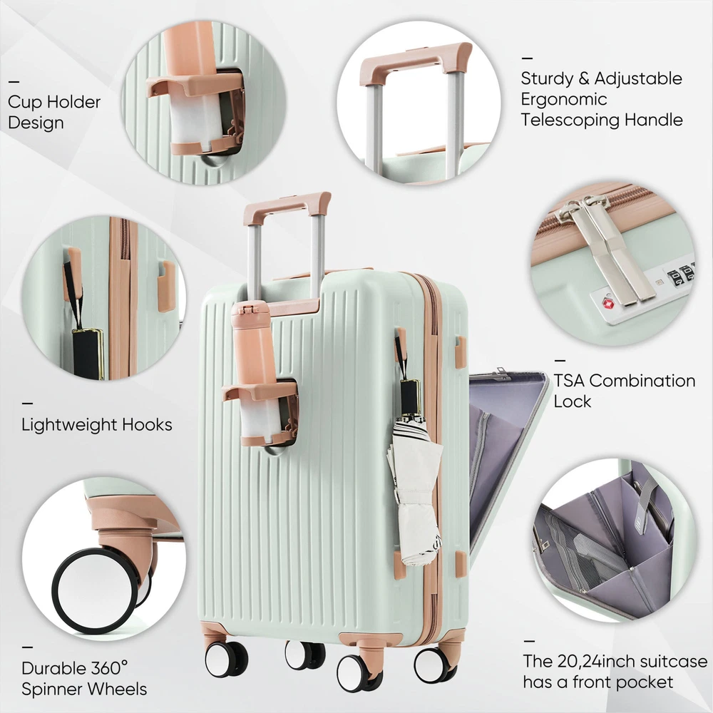 Luggage Set of 3, 20, 24, 28inch with USB Port, 20, 24inch with front opening design Airline Certified Carry on Luggage with Cup Holder, ABS Hard Shell Luggage with Spinner Wheels, grey green Specifications Place of Origin #originPlace# Main Color Light Green Main Material ABS Dangerous Goods #dangerFlag# Dimensions & Weights Assembled Length (in.) 20.00 Assembled Width (in.) 12.00 Assembled Height (in.) 30.00 Weight (lbs) 27.70 Product Features Effortless Travel: Say goodbye to travel hassles with our 3-piece suitcase set featuring sizes of 20, 24, and 28 inches. The 20 and 24-inch cases open from the front for easy access to your belongings, making packing an