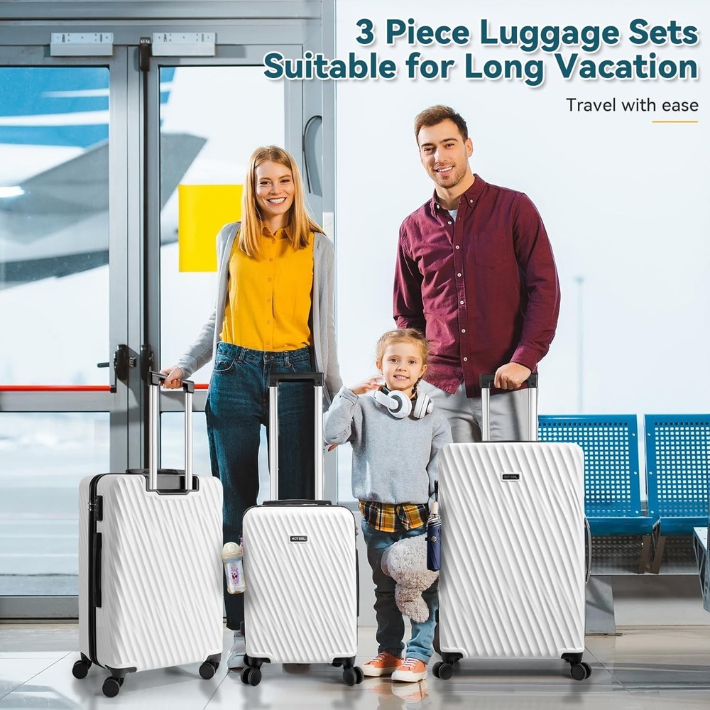 Product information Durable & Lightweight: 3-piece luggage set features thickened ABS material, perfectly balancing durability and lightweight. Reinforced hardshell ensures superior impact protection, while scratch-resistant texture maintains appearance through countless trips. Luggage available in three sizes (20"/24"/28") for all your travel needs. Wet & Dry Separation: Luggage features a book-style opening design with full zipper compartment and cross straps to effectively prevent items from shifting. Contains waterproof storage pockets and mesh pockets for wet and dry separation, making it easy to organize clothes, accessories and travel essentials. 3-Stage Handle & Hook Feet: Luggage set is equipped with an adjustable and durable ergonomic handle that is corrosion-resistant and rust-resistant, and retracts smoothly without shaking. Luggage top and side handles are thickly padded for a comfortable lifting and carrying experience. Suitcase set hook-style feet on the side of the suitcase protect the case, provide stable support, and can also hang accessories. Smooth & Silent Mobility: Luggage set is equipped with durable 360° silent spinner wheels, which can achieve smooth, stable and easy movement on any surface. Suitcases with wheels upright rolling design eliminates arm strain, making it perfect for business trips and extended travel. TSA Lock & Security Zippers: Luggage equipped with TSA-approved 3-digit combination lock ensures your belongings are secure while allowing TSA agents to inspect when necessary without damaging the lock. Luggage sets high-quality explosion-proof zippers provide lasting security and complete protection for your valuables, giving you peace of mind throughout your journey.