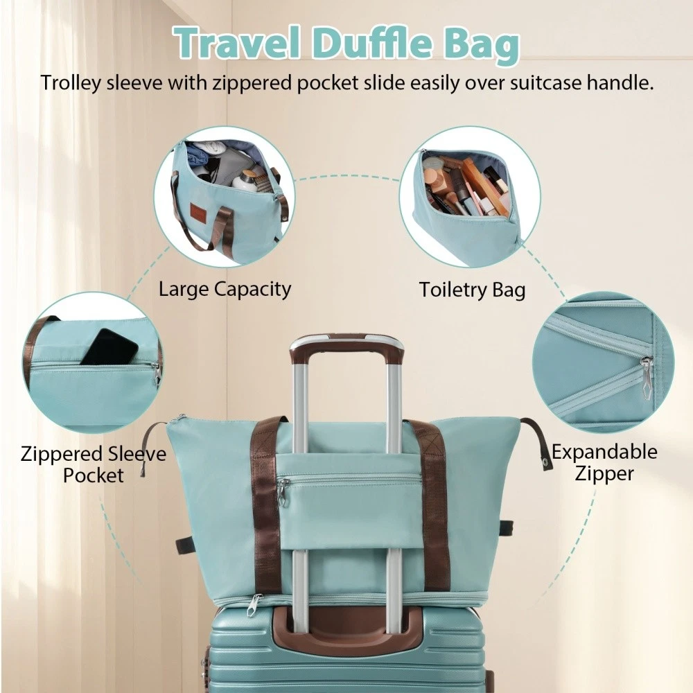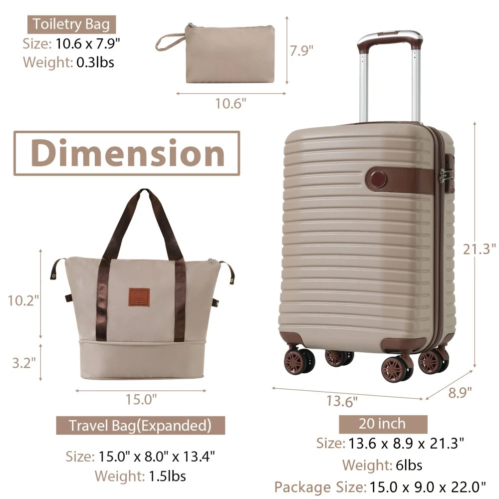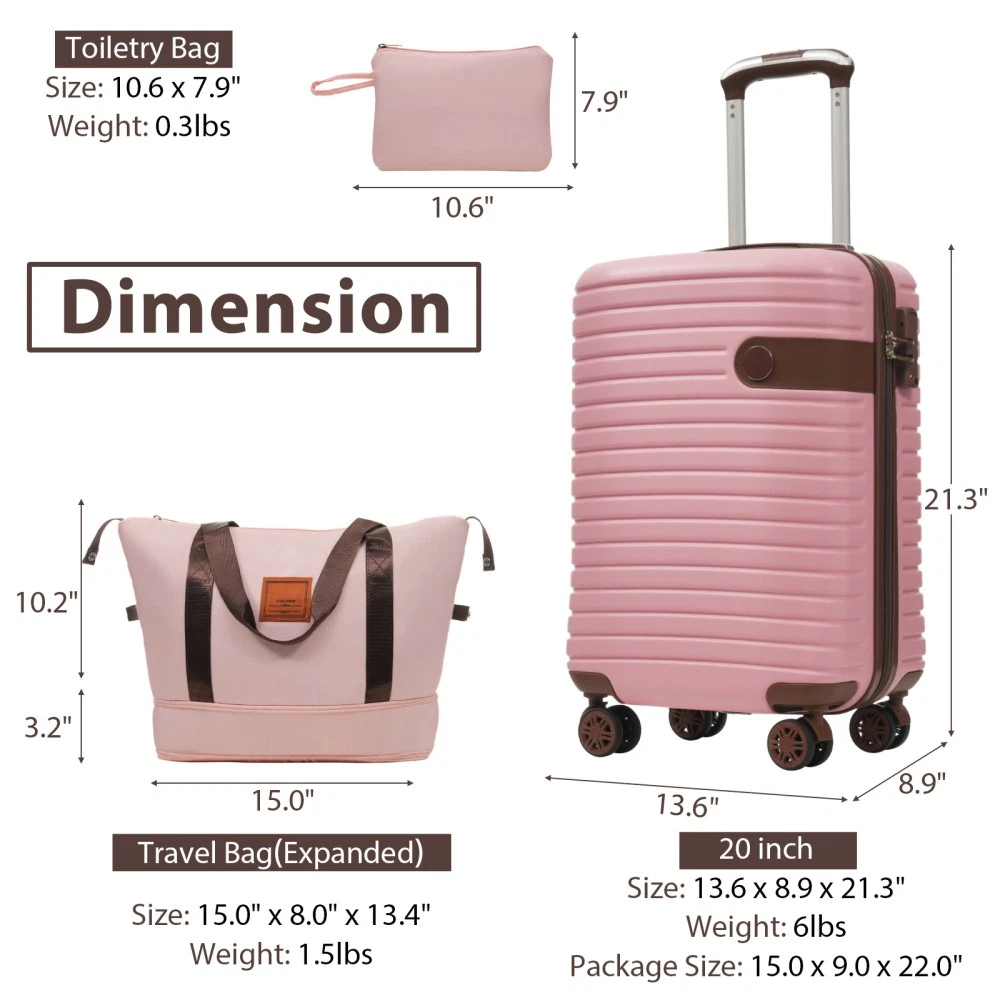 3 piece set offers a 20" luggage, a weekender travel bag and a toiletry bag. The 20-inch carry-on luggage meets the size requirements of most airlines - 22x14x9, allowing you to travel worry-free. Perfect for weekend getaways and short trips. 20-inch size:13.6"x 8.9"x 21.3". 20-inch suitcase is made of lightweight, durable and impact-resistant high-quality ABS material, and the travel duffel bag and toiletry bag are made of waterproof and scratch-resistant Oxford cloth, providing comprehensive security for all your belongings. Superior quality, silent-running, multi-directional silent spinner wheels assure smooth maneuverability. 360° double wheels are more durable and adaptable to various road conditions. Bring comfort to your journey. Upgraded zipper bites tightly and pulls smoothly, effectively preventing the chain heads from falling off and zippers from tearing. Paired with a 3-dial TSA lock, it provides security and convenience for travel. Expandable duffel bag: The duffel bag comes with a trolley sleeve with zippered pocket, and you can conveniently attach it to the adjustable handle. HOW TO RESET THE TSA COMBINATION LOCK 1. The lock is set to 0-0-0 at the factory. 2. Make sure the dials are rotated at 0-0-0 or any other code you've set before resetting it. 3. Use a pen or something pointed to press the reset hole adjacent to the dials. 4. Enter your new code by rotating the dials 5. Push the key button once and your code is now set. 6. Scramble the dials and test your new code to be sure the correct one is set.