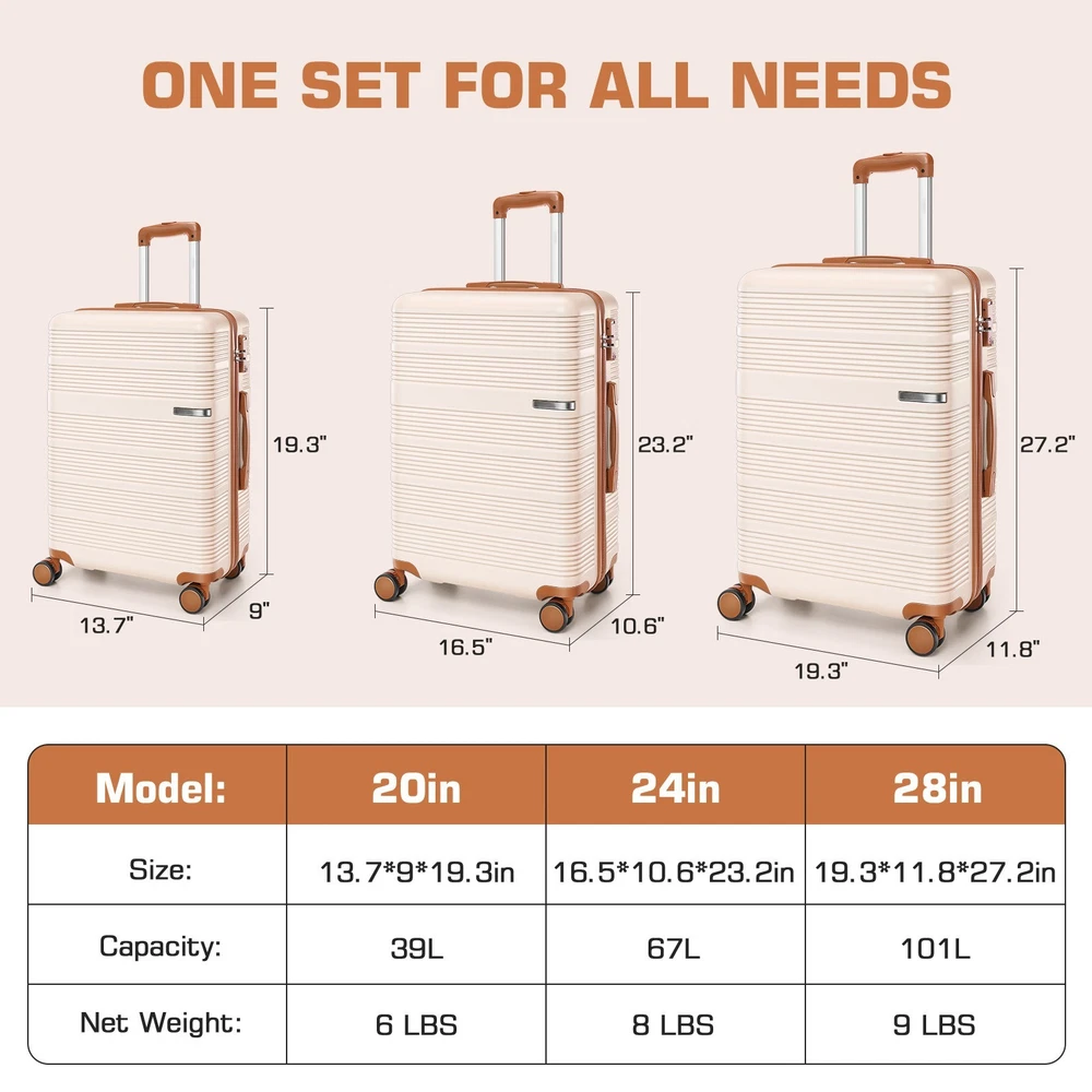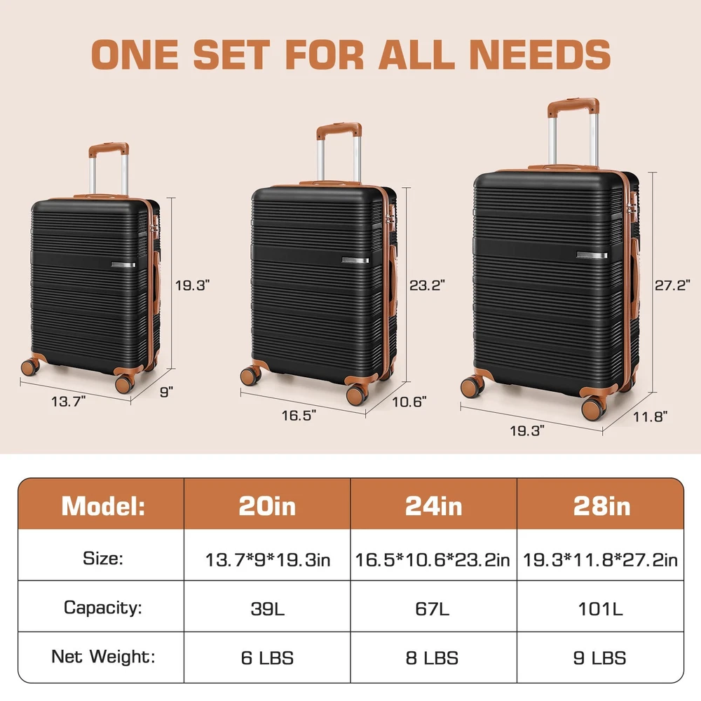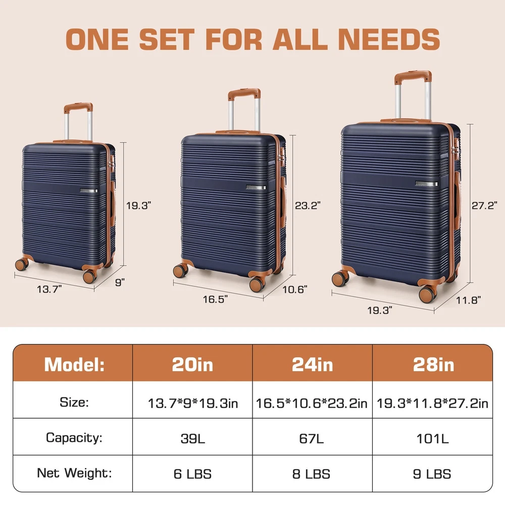 Description Luggage Sets 3 Piece Suitcases With Wheels,20" Carry On Luggage With TSA Lock, ABS+PC Durable Lightweight Hard Shell Luggage Sets For Travel,Business Trip, Large Suitcase 20 24 28 Inch 🎁 Features 【3-Piece Luggage Set】Includes 20-inch carry-on luggage, 24-inch and 28-inch checked suitcases. Perfect for travel, vacations, and business trips, also makes an ideal gift for family and friends. The luggage sets 3 piece can be nested for space-saving and convenient storage. 【Smooth, Silent 360° Spinner Wheels & Sturdy Telescoping Handle】The dual-wheel design has passed the Walking Test, ensuring smooth movement on complex surfaces like cobblestones with noise levels ≤30dB under normal conditions. Paired with a retractable rust-resistant reinforced handle, the carry-on luggage allows for effortless navigation, helping you catch your flight with ease. 【TSA Lock & Tear-resistant Zippers】 Built-in TSA lock ensures smooth security checks while keeping personal belongings secure. Paired with custom tear-resistant zippers, it offers silky-smooth usage and enhanced durability. 【Ideal Interior Space】 The suitcase features straps to secure clothes, a zippered divider for dirty laundry, and a mesh pocket for documents or toiletries. The suitcase set ensures that your packing is organized and everything has its place. Global Travel Business trip Back to School Relocation Payment 1 . We accept PayPal only. 2 . Payment should be completed within 4 (Four) days of auction closing. Or unpaid dispute will be filed for closing auction. 3 . Sales Tax of 9% will be applied for orders shipped within the state of California 4 . We will leave a positive feedback immediately after payment is received. We appreciate a positive feedback as much as you do. If for some reason there is any issue with the purchase, please contact us prior to leaving feedback, and we will be glad to work with you to have it resolved. Shipping 1 . We Ship to United States ONLY. 2 . Ship from two warehouses and only to eBay ADDRESS. Package handling only takes 1 business day at our warehouse, so please make sure entering correct payment and shipping information before checking out. Once your payment is completed, pls leave ebay note if the changes are needed before we send the product. 3 . Truck company: 3-8 business days. | USPS: 2-6 business days. | UPS/FEDEX: 3-5 business days. 4 . Lccal pick up is available. Warranty and Guarantee 1 . All of our items come with a 30-day return policy. We ensure all our items are new and in excellent condition prior to shipping. In the event that you receive the item that is not to the standards above, please contact us via e-Bay messages. All returns must be in new original condition as received and should be shipped with delivery confirmation 2 . We ONLY accept the return for original package. Please make sure that item has NO man-made sabotage. Used items will not be accepted for return. 3 . We reserve the right to refuse any returns for objective reasons. 4 . All NON-seller mistake returns for refund are subject to 20% re-stocking fee and buyer should pay for the round-trip shipping fee. (E.g. you bought wrong model or wrong color). Feadback 1 .Any problem after receiving our goods,please contact us before leaving Neutral/Negative feedback.We promise to help you solve it asap,and make you feel satisfactory absolutely. 2 . Please DO NOT leave negative feedback without asking for help. Please do not leave negative or neutral feedback if you haven't received item in 30 days, because we have mentioned the shipping time repeatedly.