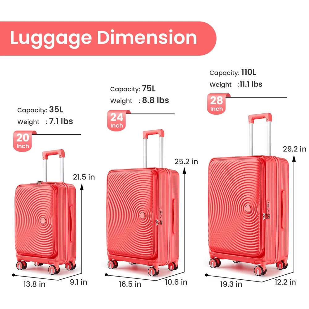 Luggage Sets 3 Piece(20/24/28), Expandable Carry On Luggage with TSA Lock Airline Approved, 100% PC Hard Shell and Lightweight Suitcase with Front Pocket and Spinner Wheels Specifications Place of Origin China Main Color Orange Main Material PC Dangerous Goods #dangerFlag# Dimensions & Weights Assembled Length (in.) Not Applicable Assembled Width (in.) Not Applicable Assembled Height (in.) Not Applicable Weight (lbs) Not Applicable Product Features FRONT LAPTOP COMPARTMENT to safely store and easily access electronics. Separate your electronics from clothing. Suggested laptop size 15.6 inches and under.