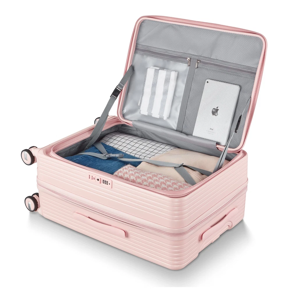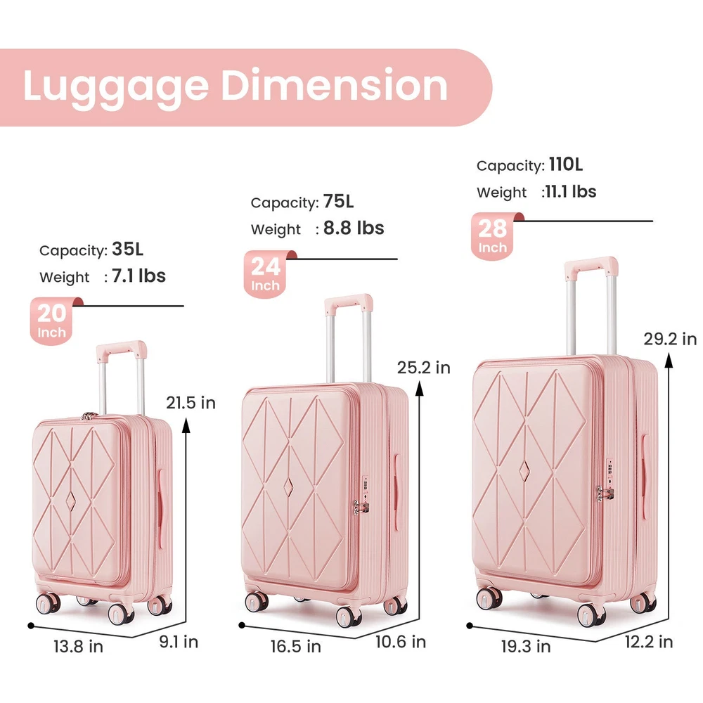 Luggage Sets 3 Piece(20/24/28), Expandable Carry On Luggage with TSA Lock Airline Approved, 100% PC Hard Shell and Lightweight Suitcase with Front Pocket and Spinner Wheels Specifications Place of Origin China Main Color Pink Main Material PC Dangerous Goods #dangerFlag# Dimensions & Weights Assembled Length (in.) Not Applicable Assembled Width (in.) Not Applicable Assembled Height (in.) Not Applicable Weight (lbs) Not Applicable Product Features FRONT LAPTOP COMPARTMENT to safely store and easily access electronics. Separate your electronics from clothing. Suggested laptop size 15.6 inches and under.