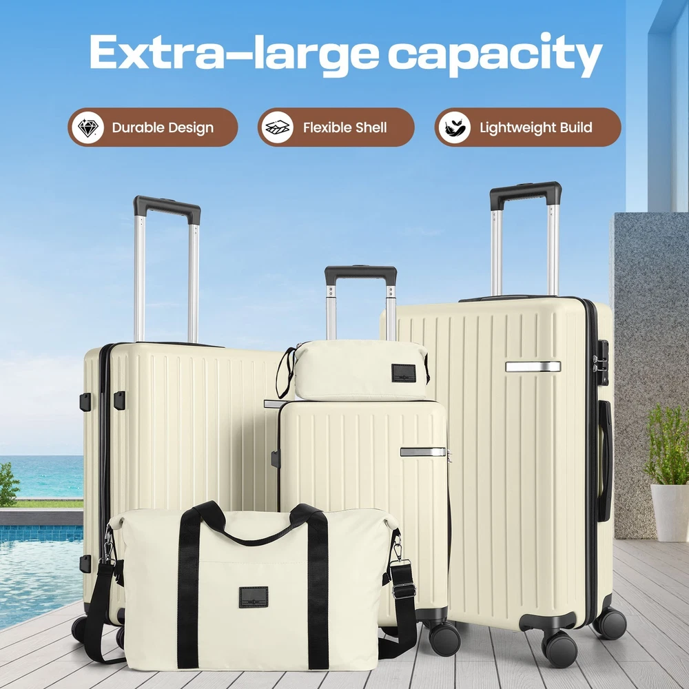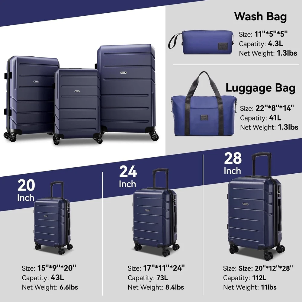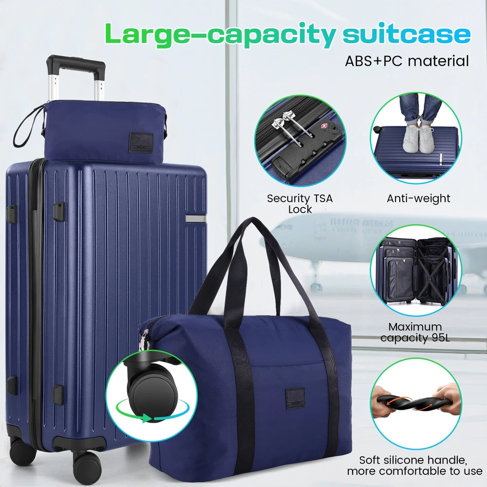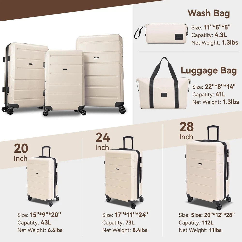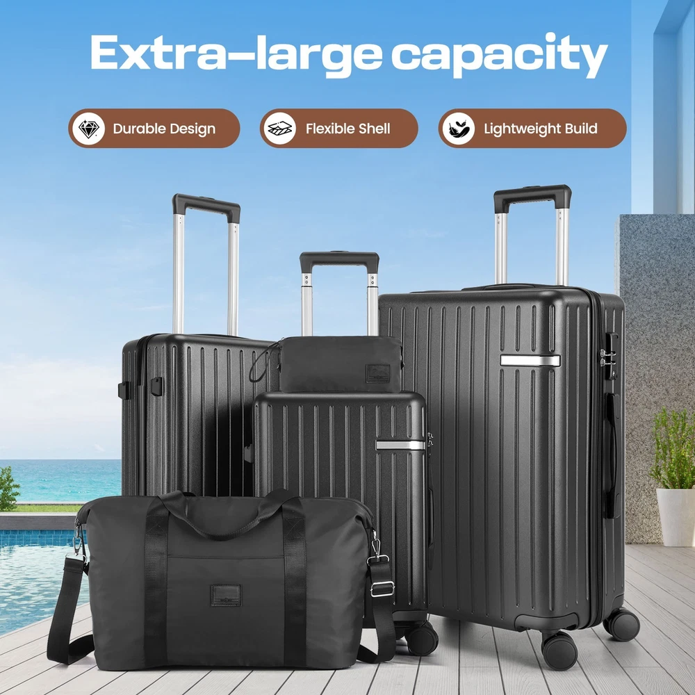 Product description Product Description [Multi-functional 5-Piece Travel Set] 5 piece luggage set features three expandable suitcases (20 inch carry-on, 24 inch and 28 inch checked luggage), each with 20% expansion capacity. Complete with a matching travel bag and toiletry bag, it's perfect for any journey. TSA-approved locks ensure secure travel and hassle-free security checks. [360° Spinner Wheels] Featuring multi-directional silent double wheels that rotate 360°, the spinner luggage set glides smoothly across various surfaces including slopes, cobblestones, and grass. The effortless maneuverability reduces physical strain, making it perfect for both business trips and leisure travel. [Adjustable Handle System] 3-step telescoping handle features a PC-reinforced grip for comfort and durability. Convenient handles on top and sides offer multiple carrying options, while four sturdy side feet keep thehard case suitcase stable when upright or sideways, protecting the shell from damage. The ergonomic design ensures easy handling throughout your journey. [Premium Materials] Crafted from durable ABS+PC material with a scratch-resistant textured surface, this hardcase luggage with spinner wheels maintains its elegant appearance over time. The spacious interior features partitions for efficient organization. Both the travel bag and toiletry bag are made of water-resistant, high-quality polyester fabric. [Quality Assurance] Our suitcase set has passed rigorous drop tests, ensuring excellent impact resistance. All components including the trolley handle, carrying handles, wheels, and straps are replaceable if damaged. Please don't hesitate to contact us with any questions or concerns about your product. Set Password Expandable Storage Capacity Luggage Case Details Easy-Carry Suitcase 20/24/28" Hard Shell Luggage Set Product Description 【Practical 5-in-1 Set】5 piece luggage set features a 20 inch carry on luggage, 24 inch/28 inch luggage, duffel bag and toiletry bag. Perfect for short trips, the carry-on meets airline requirements. The smooth-rolling dual wheels ensure quiet, effortless movement on various surfaces, making your journey more comfortable. TSA-approved locks ensure secure travel and hassle-free security checks. 【Hard Shell Carry On Luggage】Upgraded with premium ABS+PC hard shell material, the suitcase set 5 piece offers superior impact resistance and has passed rigorous drop tests. The textured surface prevents scratches, maintaining its sleek appearance. Inside, mesh compartments and cross straps keep your belongings organized and secure. 【3-stage Telescopic Handle】The handle can be adjusted according to your height. Ergonomic rubber handles on top and sides ensure comfortable grip and hand protection during transport. Side feet ensure stability when luggage is placed sideways, while integrated hooks let you hang shopping bags for added convenience during travel. 【Large Capacity Bag】This spacious duffel bag accommodates 2-3 days of clothing and features waterproof compartments for toiletries and liquids. The complementary toiletry bag helps organize personal care items for efficient travel. 【Replaceable parts】Components of hard luggage sets including telescopic handles, carry handles, wheels, and duffel bag straps are replaceable. Please contact us if any parts need replacement or if you have questions. Double Handle Design Handles on the top and sides of the suitcase make it easy to lift both horizontally and vertically. Comfort Puller Tie rod reinforced non-slip, give you a better experience. Side Support Silicone It serves to protect the luggage shell when security checks etc. require the case to be placed on its side. Spinner Wheels The double-wheel structure is more stable, making it less likely to tip over when pushed upright.