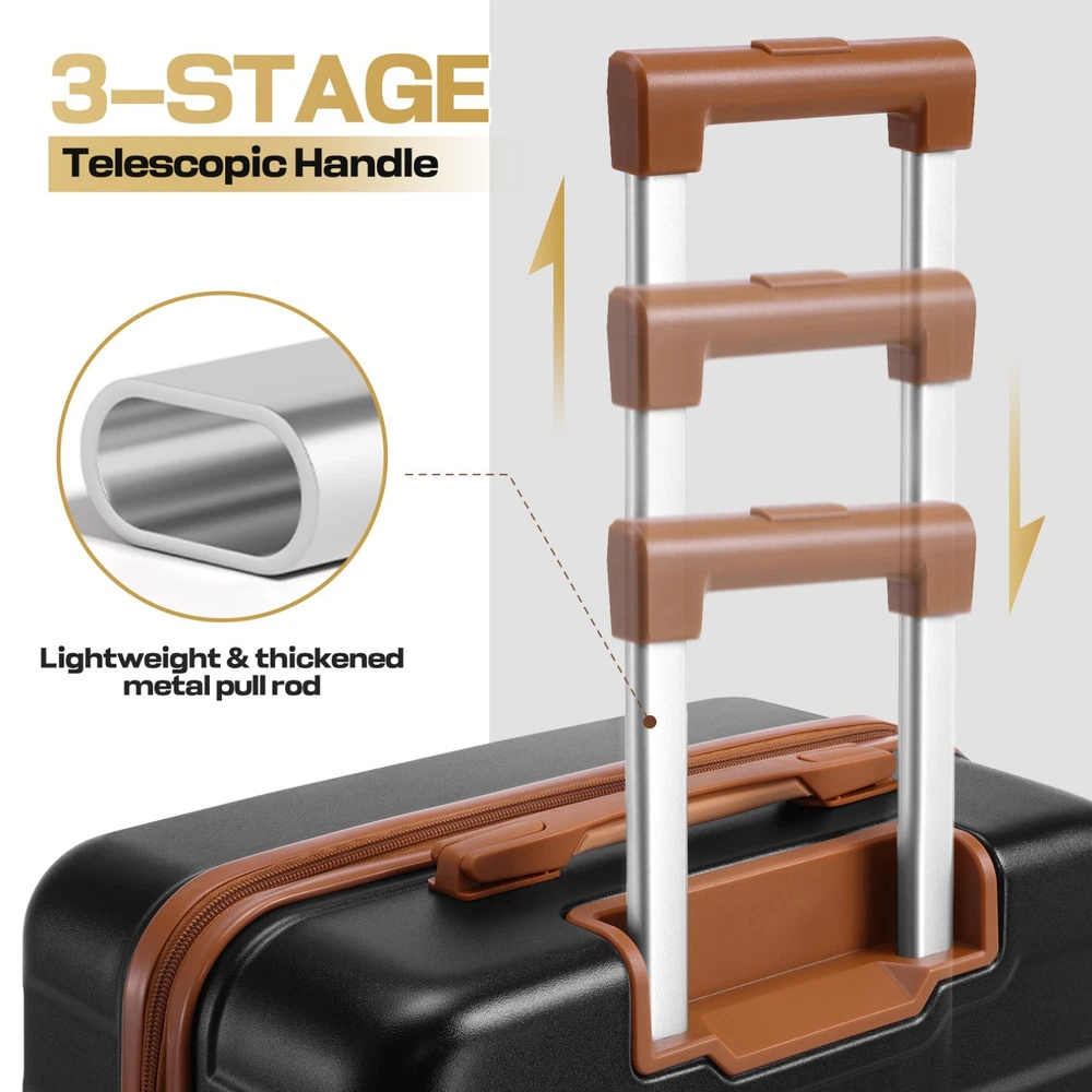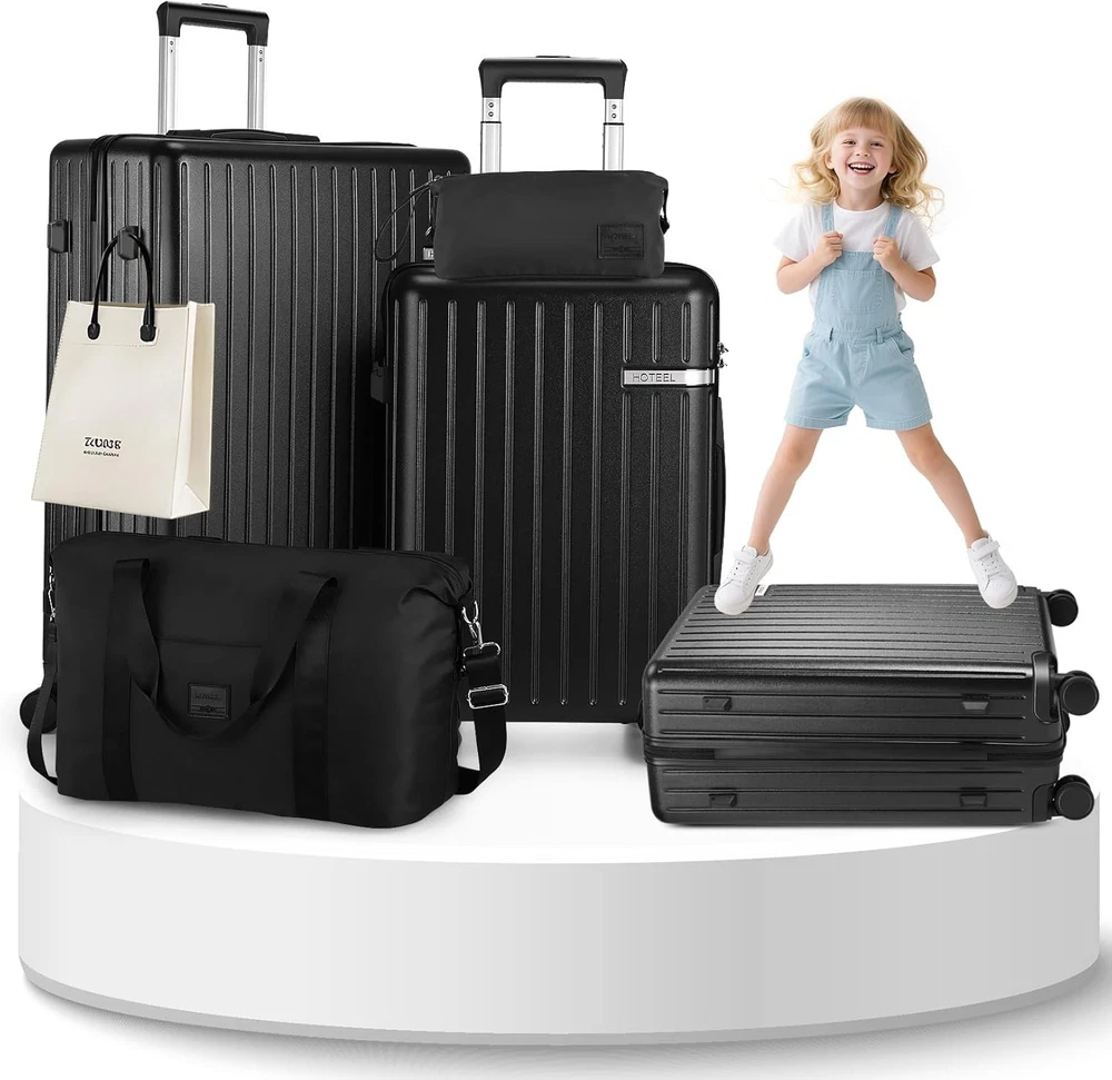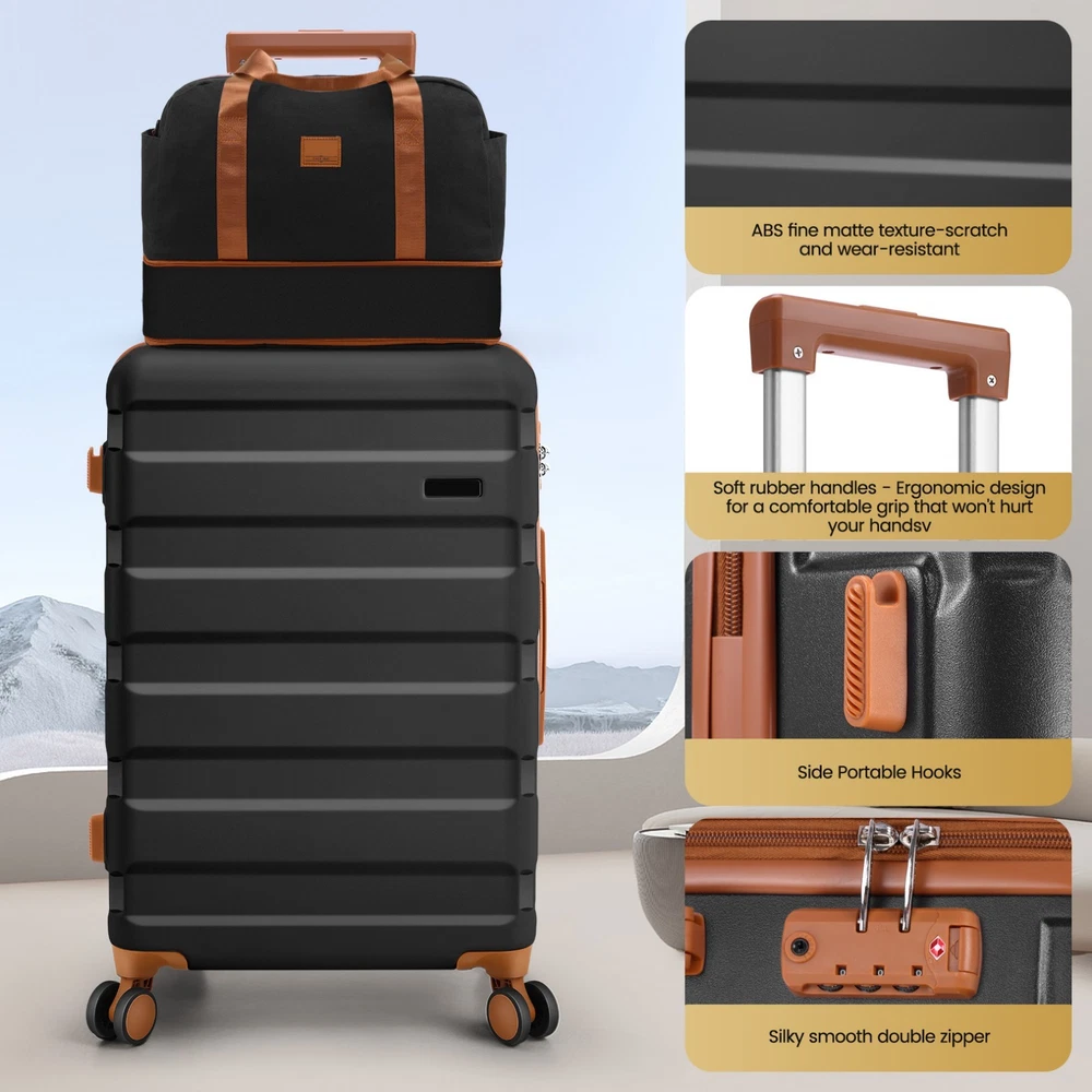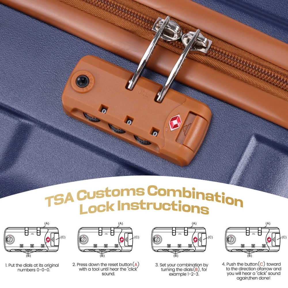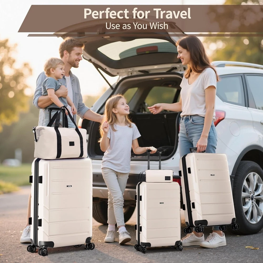 Product description Product Description [Multi-functional 5-Piece Travel Set] 5 piece luggage set features three expandable suitcases (20 inch carry-on, 24 inch and 28 inch checked luggage), each with 20% expansion capacity. Complete with a matching travel bag and toiletry bag, it's perfect for any journey. TSA-approved locks ensure secure travel and hassle-free security checks. [360° Spinner Wheels] Featuring multi-directional silent double wheels that rotate 360°, the spinner luggage set glides smoothly across various surfaces including slopes, cobblestones, and grass. The effortless maneuverability reduces physical strain, making it perfect for both business trips and leisure travel. [Adjustable Handle System] 3-step telescoping handle features a PC-reinforced grip for comfort and durability. Convenient handles on top and sides offer multiple carrying options, while four sturdy side feet keep thehard case suitcase stable when upright or sideways, protecting the shell from damage. The ergonomic design ensures easy handling throughout your journey. [Premium Materials] Crafted from durable ABS+PC material with a scratch-resistant textured surface, this hardcase luggage with spinner wheels maintains its elegant appearance over time. The spacious interior features partitions for efficient organization. Both the travel bag and toiletry bag are made of water-resistant, high-quality polyester fabric. [Quality Assurance] Our suitcase set has passed rigorous drop tests, ensuring excellent impact resistance. All components including the trolley handle, carrying handles, wheels, and straps are replaceable if damaged. Please don't hesitate to contact us with any questions or concerns about your product. Set Password Expandable Storage Capacity Luggage Case Details Easy-Carry Suitcase 20/24/28" Hard Shell Luggage Set Product Description 【Practical 5-in-1 Set】5 piece luggage set features a 20 inch carry on luggage, 24 inch/28 inch luggage, duffel bag and toiletry bag. Perfect for short trips, the carry-on meets airline requirements. The smooth-rolling dual wheels ensure quiet, effortless movement on various surfaces, making your journey more comfortable. TSA-approved locks ensure secure travel and hassle-free security checks. 【Hard Shell Carry On Luggage】Upgraded with premium ABS+PC hard shell material, the suitcase set 5 piece offers superior impact resistance and has passed rigorous drop tests. The textured surface prevents scratches, maintaining its sleek appearance. Inside, mesh compartments and cross straps keep your belongings organized and secure. 【3-stage Telescopic Handle】The handle can be adjusted according to your height. Ergonomic rubber handles on top and sides ensure comfortable grip and hand protection during transport. Side feet ensure stability when luggage is placed sideways, while integrated hooks let you hang shopping bags for added convenience during travel. 【Large Capacity Bag】This spacious duffel bag accommodates 2-3 days of clothing and features waterproof compartments for toiletries and liquids. The complementary toiletry bag helps organize personal care items for efficient travel. 【Replaceable parts】Components of hard luggage sets including telescopic handles, carry handles, wheels, and duffel bag straps are replaceable. Please contact us if any parts need replacement or if you have questions. Double Handle Design Handles on the top and sides of the suitcase make it easy to lift both horizontally and vertically. Comfort Puller Tie rod reinforced non-slip, give you a better experience. Side Support Silicone It serves to protect the luggage shell when security checks etc. require the case to be placed on its side. Spinner Wheels The double-wheel structure is more stable, making it less likely to tip over when pushed upright.