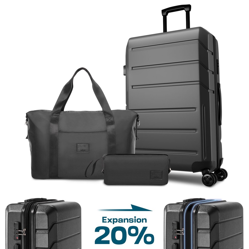Product description Product Description [Multi-functional 5-Piece Travel Set] 5 piece luggage set features three expandable suitcases (20 inch carry-on, 24 inch and 28 inch checked luggage), each with 20% expansion capacity. Complete with a matching travel bag and toiletry bag, it's perfect for any journey. TSA-approved locks ensure secure travel and hassle-free security checks. [360° Spinner Wheels] Featuring multi-directional silent double wheels that rotate 360°, the spinner luggage set glides smoothly across various surfaces including slopes, cobblestones, and grass. The effortless maneuverability reduces physical strain, making it perfect for both business trips and leisure travel. [Adjustable Handle System] 3-step telescoping handle features a PC-reinforced grip for comfort and durability. Convenient handles on top and sides offer multiple carrying options, while four sturdy side feet keep thehard case suitcase stable when upright or sideways, protecting the shell from damage. The ergonomic design ensures easy handling throughout your journey. [Premium Materials] Crafted from durable ABS+PC material with a scratch-resistant textured surface, this hardcase luggage with spinner wheels maintains its elegant appearance over time. The spacious interior features partitions for efficient organization. Both the travel bag and toiletry bag are made of water-resistant, high-quality polyester fabric. [Quality Assurance] Our suitcase set has passed rigorous drop tests, ensuring excellent impact resistance. All components including the trolley handle, carrying handles, wheels, and straps are replaceable if damaged. Please don't hesitate to contact us with any questions or concerns about your product. Set Password Expandable Storage Capacity Luggage Case Details Easy-Carry Suitcase 20/24/28" Hard Shell Luggage Set Product Description 【Practical 5-in-1 Set】5 piece luggage set features a 20 inch carry on luggage, 24 inch/28 inch luggage, duffel bag and toiletry bag. Perfect for short trips, the carry-on meets airline requirements. The smooth-rolling dual wheels ensure quiet, effortless movement on various surfaces, making your journey more comfortable. TSA-approved locks ensure secure travel and hassle-free security checks. 【Hard Shell Carry On Luggage】Upgraded with premium ABS+PC hard shell material, the suitcase set 5 piece offers superior impact resistance and has passed rigorous drop tests. The textured surface prevents scratches, maintaining its sleek appearance. Inside, mesh compartments and cross straps keep your belongings organized and secure. 【3-stage Telescopic Handle】The handle can be adjusted according to your height. Ergonomic rubber handles on top and sides ensure comfortable grip and hand protection during transport. Side feet ensure stability when luggage is placed sideways, while integrated hooks let you hang shopping bags for added convenience during travel. 【Large Capacity Bag】This spacious duffel bag accommodates 2-3 days of clothing and features waterproof compartments for toiletries and liquids. The complementary toiletry bag helps organize personal care items for efficient travel. 【Replaceable parts】Components of hard luggage sets including telescopic handles, carry handles, wheels, and duffel bag straps are replaceable. Please contact us if any parts need replacement or if you have questions. Double Handle Design Handles on the top and sides of the suitcase make it easy to lift both horizontally and vertically. Comfort Puller Tie rod reinforced non-slip, give you a better experience. Side Support Silicone It serves to protect the luggage shell when security checks etc. require the case to be placed on its side. Spinner Wheels The double-wheel structure is more stable, making it less likely to tip over when pushed upright.