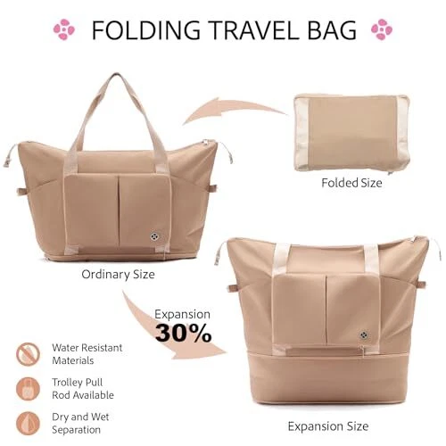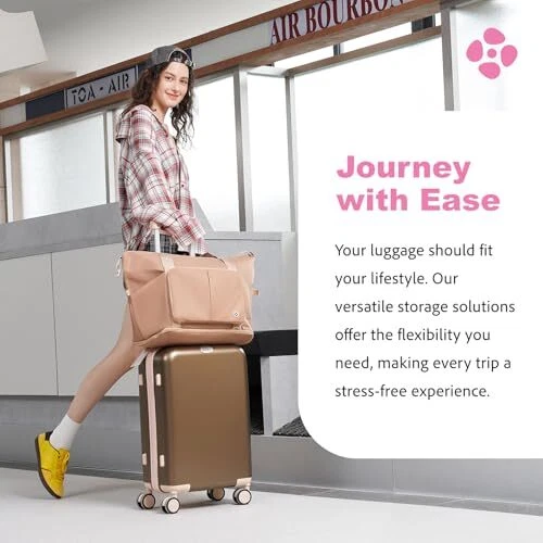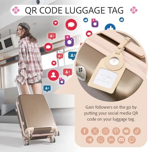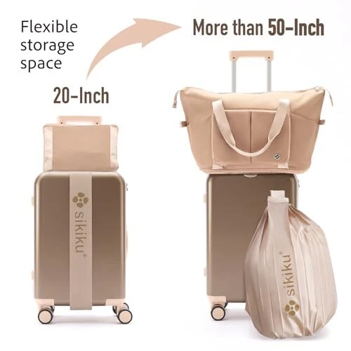 4 piece luggage sets: Offers a 20-inch carry on suitcase, a luggage tag, a foldable travel duffel bag, and a luggage strap; Enabling women to travel light with a suitcase and return with a full 50-inch one Organized & Secure: The interior compartments can easily classify your beauty products and other small items, ideal for female travelers; TSA lock for secure inspection without damaging Practical & Durable: Made from ABS+PC, this scratch-resistant, lightweight luggage glides smoothly with a retractable handle and 360-degree spinner wheels; Waterproof strap and bag, suitable for all-weather travel Multi-purpose Strap: The luggage strap offers protection when attached to your suitcase and doubles as storage when reversed; It can also convert into a crossbody bag for various travel needs during your journey Expandable & Foldable Duffel Bag: The duffel bag provides additional packing space with a bottom zipper for instant capacity increase; The rear sleeve design easily attaches to your luggage handle or folds into a small square for storage Unique Social Tag: Leather luggage tag with an exclusive Apple slot to prevent loss; Transparent card holder for personal QR code, such as IG profile QR code perfect for attracting followers while on the go