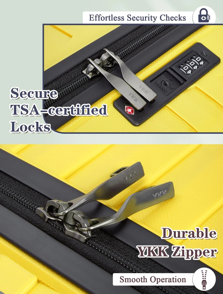 Description Luggage Sets 4 Piece, Suitcases with Wheels, PP Hard Case Luggage with Upgraded Shock-absorbing Spinner Wheel&TSA Lock, Carry On Luggage Set 【4 Piece Luggage Set】Luggage sets include a 24-inch large suitcase, 20-inch carry on luggage, extended duffel bag, and a toiletry bag. The duffel bag features a back sleeve so you can conveniently attach it to the retractable luggage handle. 【High-quality PP Material】PP luggage sets feature high-quality PP material, known for its recyclability and environmental friendliness compared to ABS. The PP luggage boasts superior resistance to extreme temperatures, increased impact resistance, and a reduced risk of cracking, making it a durable and sustainable choice for travelers. 【TSA Lock & YKK Zipper 】luggage sets are equipped with premium features, including a mounted TSA-approved lock for enhanced security and a fully-lined interior divider with organization pockets to keep belongings neat. The reinforced and upgraded YKK zippers effectively prevent splitting, ensuring reliable and secure travel for your valuables. 【Upgraded Shock-absorbing Wheel】 Enjoy silent and smooth mobility with our luggage's 360° double spinner wheels. Equipped with 8 high-quality, shock-absorbing wheels, this design ensures quiet and smooth travel. The double wheel configuration enhances durability and provides superior directional control for effortless maneuverability in any direction. 【Full Aluminum Telescopic Handle】Hard shell suitcases feature an ergonomic 3-stage retractable trolley with TPU handles on the top and sides, making it effective for a variety of occasions