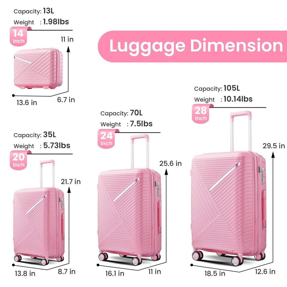 Luggage Sets 4 Piece(14/20/24/28), Expandable Lightweight Suitcase with 4 Double 360 Degrees Mute Spinner Wheels PP Materials Durable TSA Lock Travel Luggage Specifications Place of Origin China Main Color Pink Main Material Polypropylene Dangerous Goods #dangerFlag# Dimensions & Weights Assembled Length (in.) 18.30 Assembled Width (in.) 10.80 Assembled Height (in.) 29.00 Weight (lbs) 24.00 Product Features Lightweight & Durable: This family luggage is made of strong waterproof PP exterior and black lined interior, which is easy to clean and long-term use. In addition, it is light in weight and easy to carry. Four molded side feet keep the luggage upri