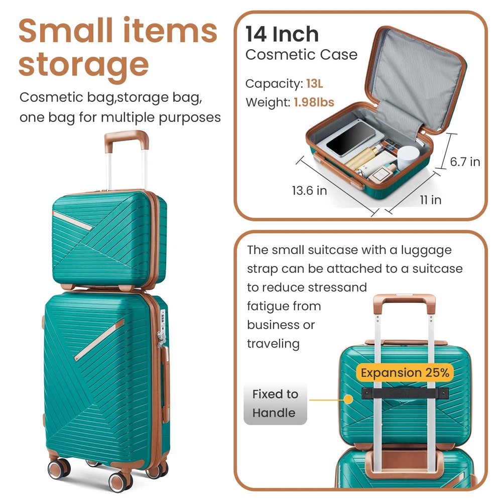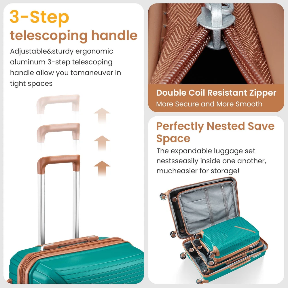 Luggage Sets 4 Piece(14/20/24/28), Expandable Lightweight Suitcase with 4 Double 360 Degrees Mute Spinner Wheels PP Materials Durable TSA Lock Travel Luggage Specifications Place of Origin China Main Color Coral+Green Main Material Polypropylene Dangerous Goods #dangerFlag# Dimensions & Weights Assembled Length (in.) Not Applicable Assembled Width (in.) Not Applicable Assembled Height (in.) Not Applicable Weight (lbs) Not Applicable Product Features Lightweight & Durable: This family luggage is made of strong waterproof PP exterior and black lined interior, which is easy to clean and long-term use. In addition, it is light in weight and easy to carry.