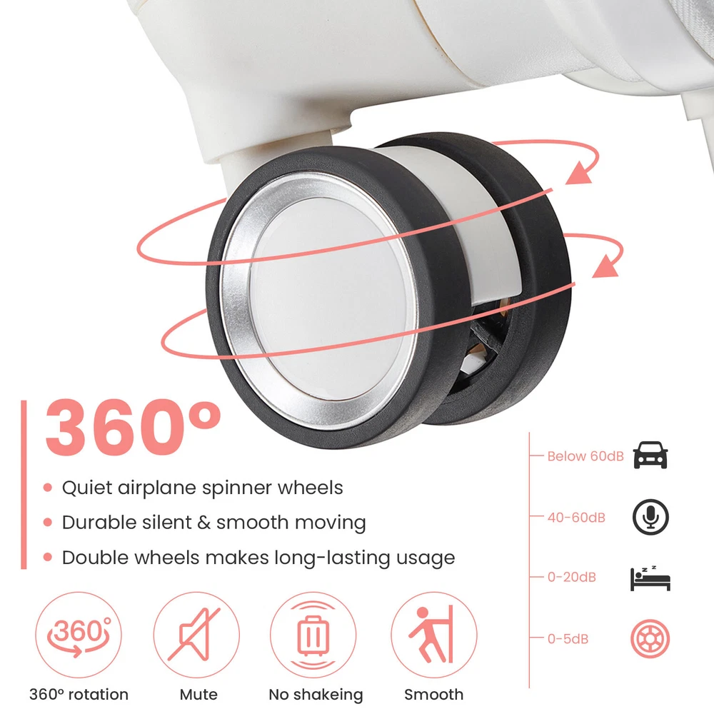 Specification Product Information Item Code:W2098126459 Product Type:General Item Product Name:Luggage Sets 4 Piece(14/20/24/28) PP Lightweight & Durable Expandable suitcase Place of Origin:China Main Color:White Main Material:Polypropylene Product Dimensions Assembled Length (in.):18.30 Assembled Width (in.):10.80 Assembled Height (in.):29.00 Weight (lbs.):24.00 Package Size Length (in.):19.30 Width (in.):11.80 Height (in.):30.00 Weight (lbs.):26.50 Product Features Top quality luggage sets, PC material for hardshell, which makes the luggage more durable, lighter and impact-resistant. 21in is best for carry on, 29in expands 20% for more spaces. Organized and Spacious Interior. The fully lined luggage includes a handy divider and an interior organizer with zippered pocket for smaller items. Organized and Spacious Interior. The fully lined luggage includes a handy divider and an interior organizer with zippered pocket for smaller items. Side-mounted TSA LOCK with smooth YKK zipper act to deter theft, ensuring that only you or a TSA agent have easy access to your belongings when traveling, added security and convenience. Multi-directional spinner wheels to provide 360° effortless mobility and ease on traveler's wrist, re-engineered lightweight. Adjustable 3-level aluminum telescoping handle allows you to quickly maneuver in tight spaces and it's sturdier than most of the telescoping handle on the market. The top/side soft reinforced grip handles for easy carrying when in a hurry, or it can be really handy when lifting the suitcase with heavy weight. Description
