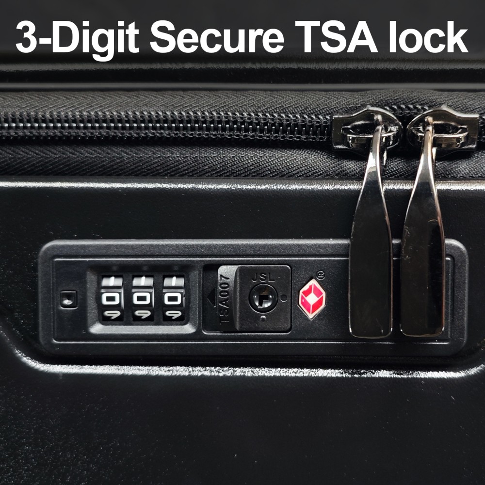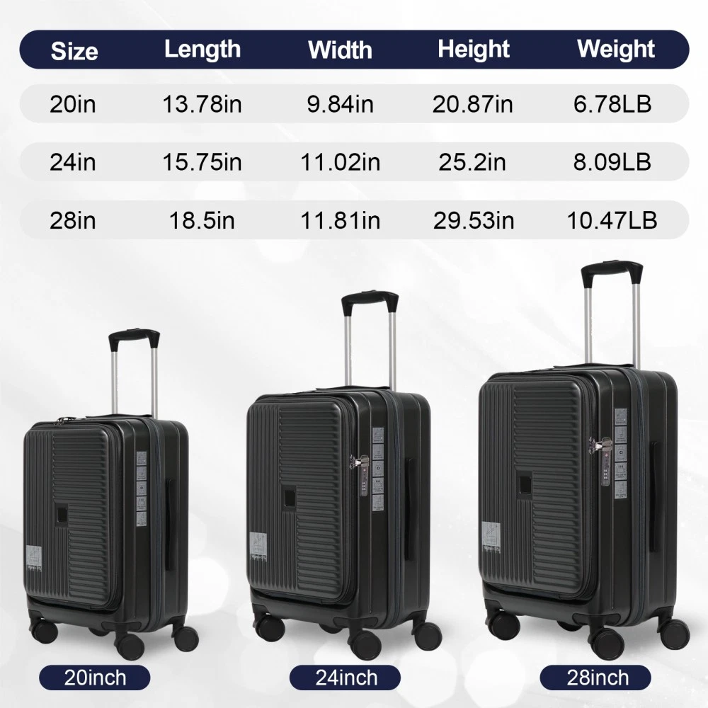 3-Piece Hard Shell Luggage Set ( 20", 24", 28" ): Versatile Sizes: The 20" carry-on includes a front lid with a laptop compartment and mesh pockets for easy access. The 24" and 28" suitcases offer larger capacities with front-opening lids. All sizes expand by 20% for extra storage. Ergonomic Handle: Adjustable 3-step aluminum telescopic handle fits different heights. Secure Design: Features explosion-proof zippers and a TSA combination lock for added security and smooth customs inspections.