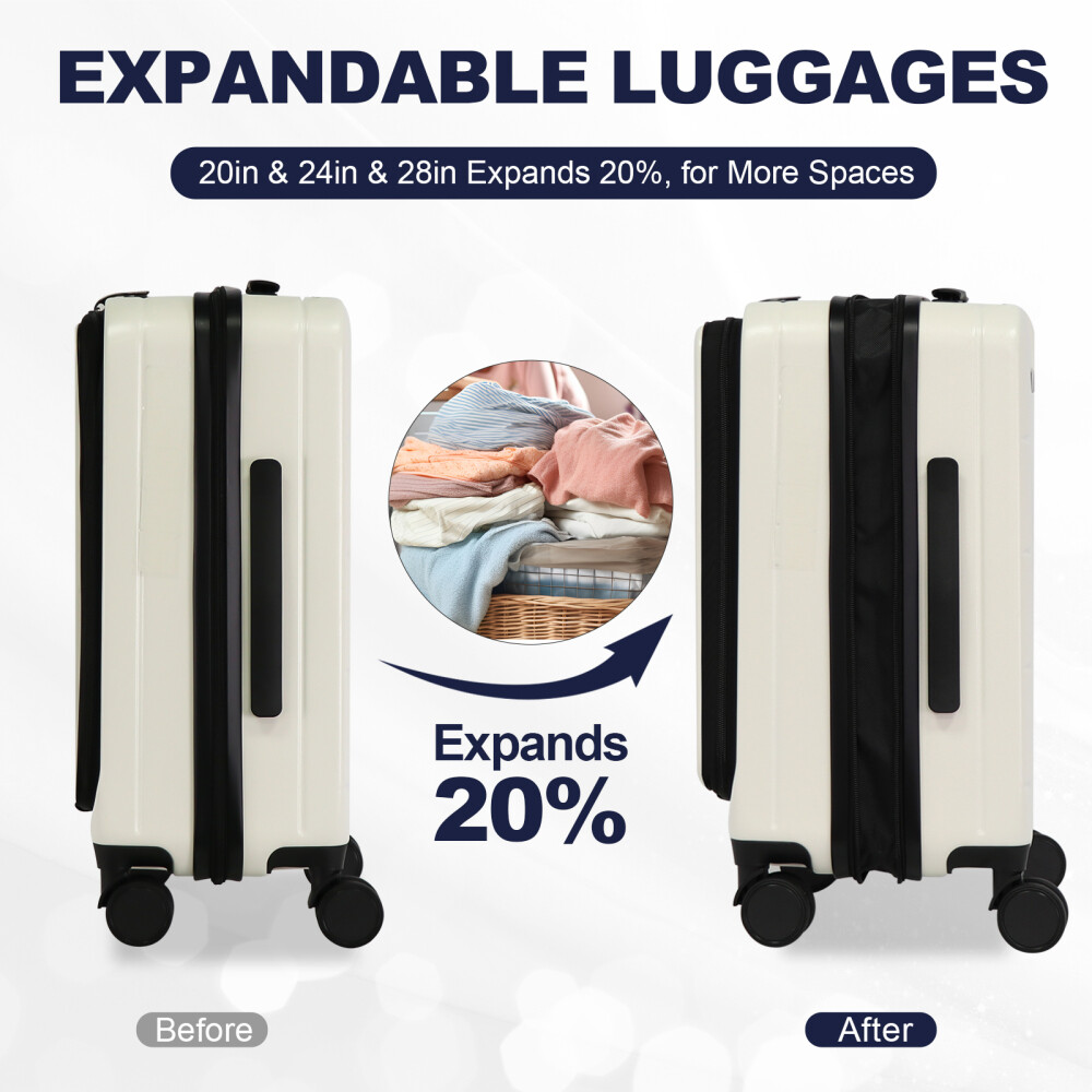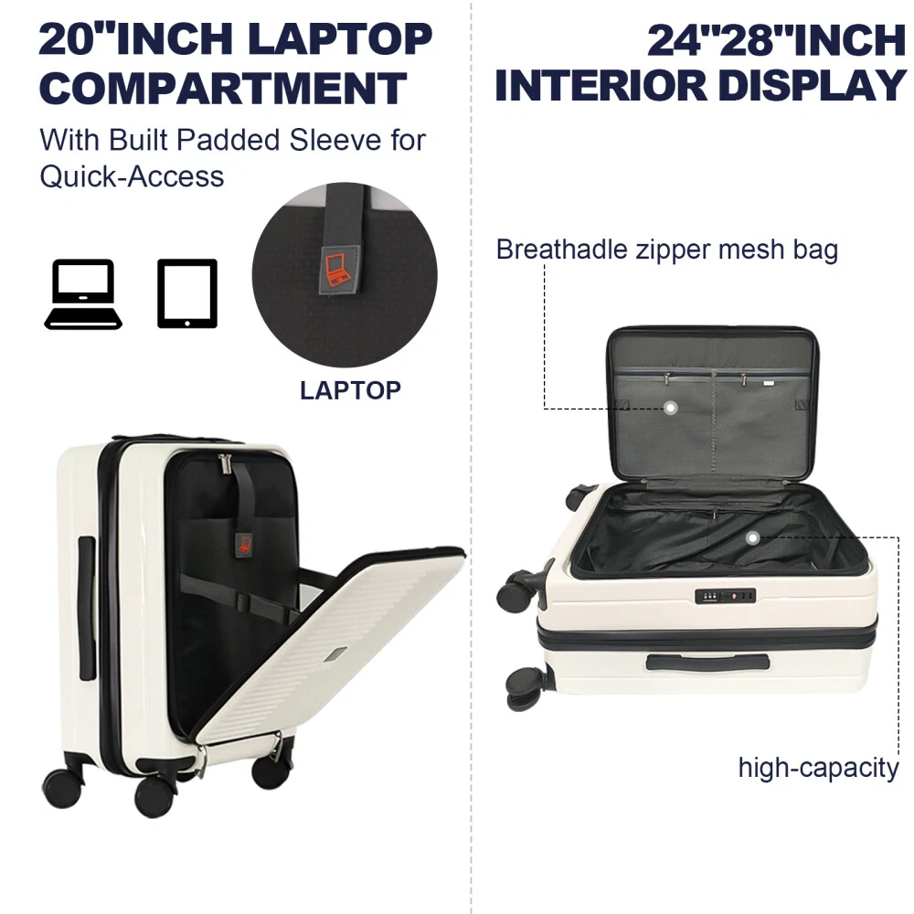 3-Piece Hard Shell Luggage Set (20", 24", 28"): Versatile Sizes: The 20" carry-on includes a front lid with a laptop compartment and mesh pockets for easy access. The 24" and 28" suitcases offer larger capacities with front-opening lids. All sizes expand by 20% for extra storage. Durable Build: Made from lightweight, thick PC+ABS material with a scratch-resistant matte finish. Ergonomic Handle: Adjustable 3-step aluminum telescopic handle fits different heights. Silent, smooth dual spinner wheels rotate 360°, making it easy to maneuver on flat surfaces, uphill, and over rough terrain. Secure Design: Features explosion-proof zippers and a TSA combination lock for added security and smooth customs inspections. providing double protection for your personal belongings.