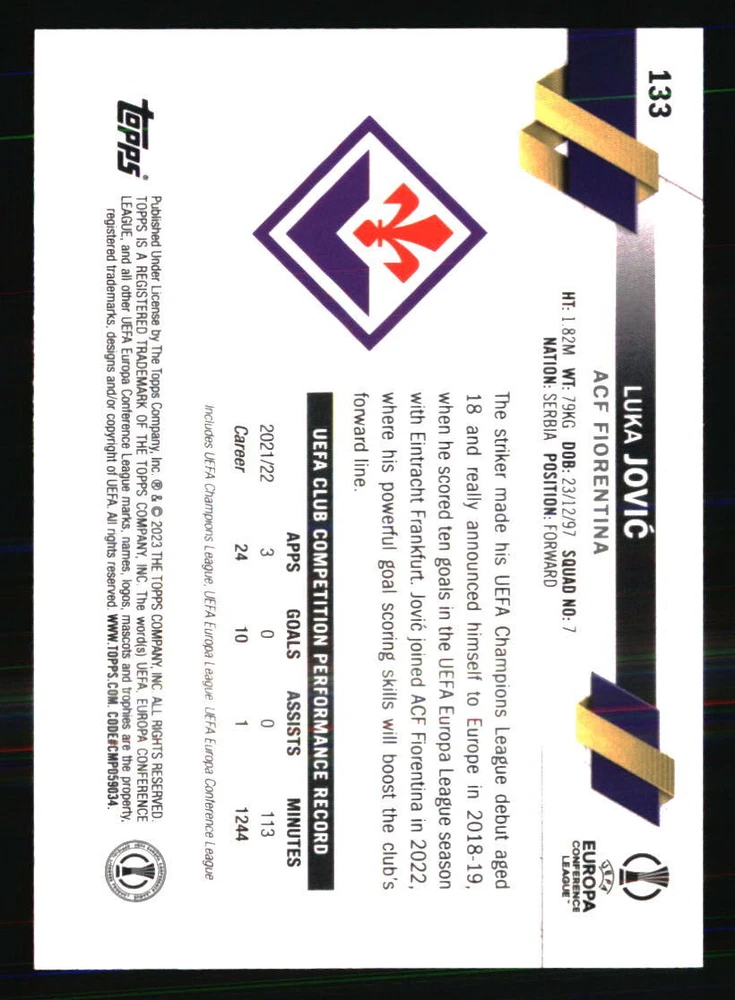 Team: ACF Fiorentina Season: 2022 Manufacturer: Topps Card Number: 133 Type: Sports Trading Card Set: 2022-23 Topps UEFA Club Competitions 1st Edition Graded: No Year Manufactured: 2022 Autographed: No Player|Athlete: Luka Jović Sport: SOCCER