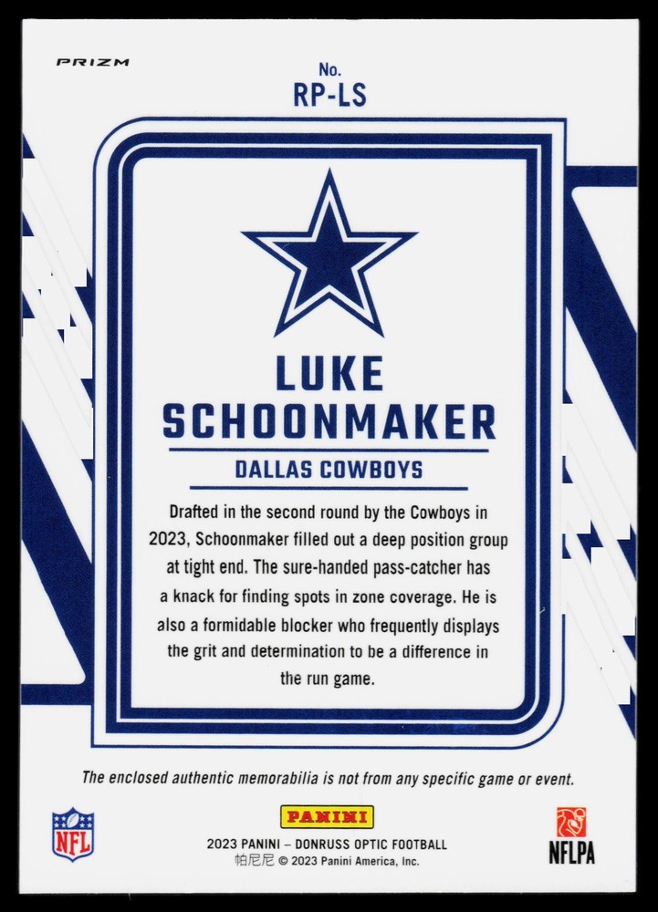 You will receive a Near Mint or Better, Luke Schoonmaker, 2023 Panini Donruss Optic, , Dallas Cowboys card PLEASE NOTE: SOME CARDS THAT GO THROUGH OUR SCANNER MAY APPEAR TO HAVE LINES THROUGH THEM. THEY ARE NOT ACTUAL SCRATCHES, SIMPLY FALSE IMAGE LINES. WE WILL NOT INTENTIALLY SELL, DAMAGED CARDS. NEW CARDS LISTED DAILY ORDERS SHIP NEXT DA Y (Weekends as mail service is available) VISIT OUR STORE FOR MORE DEALS! USE THE SEARCH ICON IN THE STORE TO FIND YOUR FAVORITE TEAMS & PLAYERS! Be sure to save us as sellers to be the first to be notified when new and exciting cards are posted! Please note, we are not professional graders, and the condition of the card you purchased is highly subjective. Please refer to the high quality scans of the card you are viewing, and determine the condition of the card for yourself. Feel free to reach out with questions! All cards are in EX-NM+ condition, unless stated otherwise Chrome cards from various brands might have minor light surface scratches, which is typical with these type of cards. Any major, deep scratches or major surface issues will be noted, if present. We take pride in the condition of all of our cards, including commons. Our promise to you, is that we will not sell a card we would not buy ourselves. Of course things slip by, however customer service is our #1 Priority, and we are always here for a message for ANY, and ALL issues. Thank you very much for stopping by, feel free to reach out! - Titan (Son) & Andy (Dad)