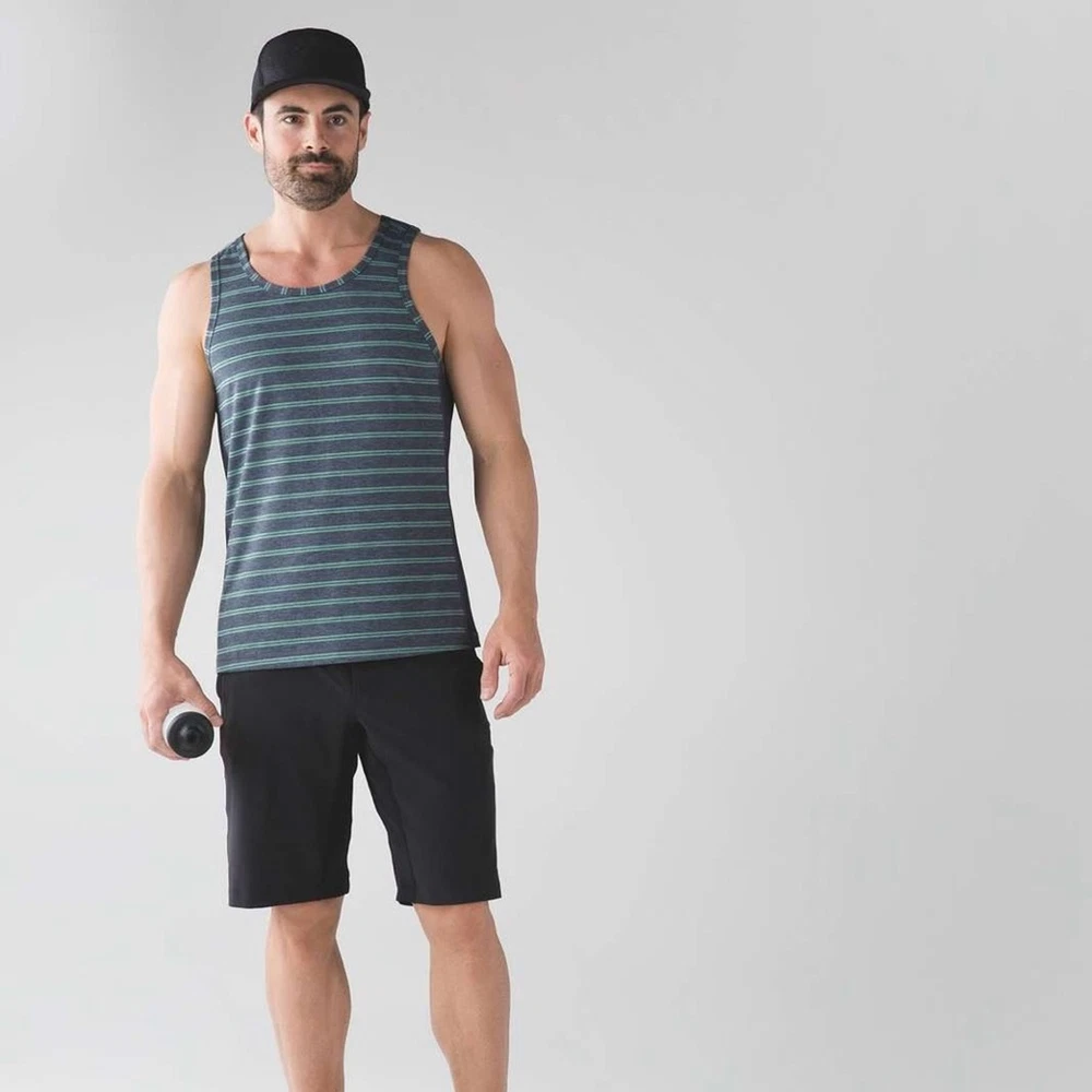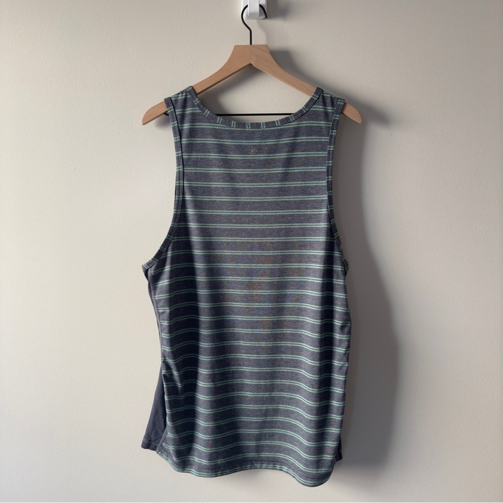 This tank top features a sleek design with alternating gray and green stripes, perfect for athletic activities. Made from lightweight fabric, it offers a comfortable fit and generous armholes for ease of movement. Ideal for workouts or casual wear, its cool color scheme adds a touch of style to any outfit. Condition: Good pre-owned condition. Logo shows wear. Comes from a smoke-free and pet-free home. **No size tag, but estimated to be about a size XL. Please see measurements below.** Approximate Measurements (Laying Flat): Length: 30 in Chest: 22.5 in Waist: 21 in For seller use: 8oz 2036