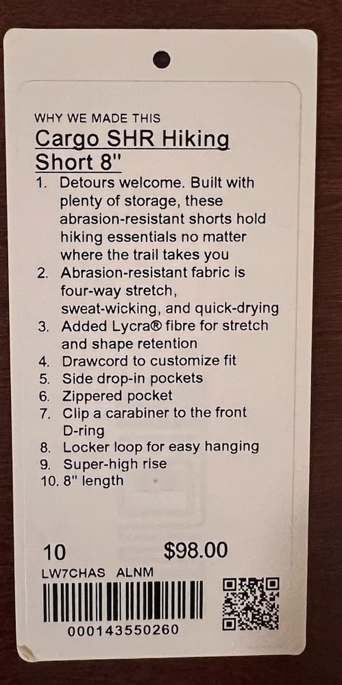 Compression Area: Waist Performance/Activity: Hiking, Outdoor Inseam: 8 in Handmade: No Personalize: No Product Line: Lululemon Fit: Athletic Theme: Sports Closure: Drawstring Color: Multicolor MPN: LW7CHAS Brand: Lululemon Model: Lululemon Cargo SHR Hiking Short 8" Size: 10 Character: lululemon, sports, hiking Fabric Type: Blended Fabric Features: Breathable, Drawstring, Pockets Waist Size: 28 in Style: Athletic Occasion: Activewear Pattern: Colorblock Garment Care: Machine Washable Material: Nylon, Spandex Size Type: Regular Country/Region of Manufacture: Unknown Department: Women Season: Fall, Spring, Summer, Winter