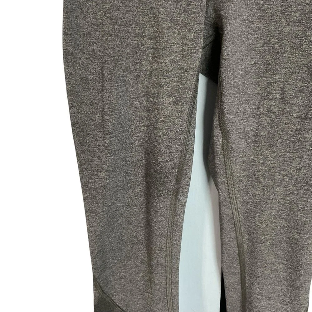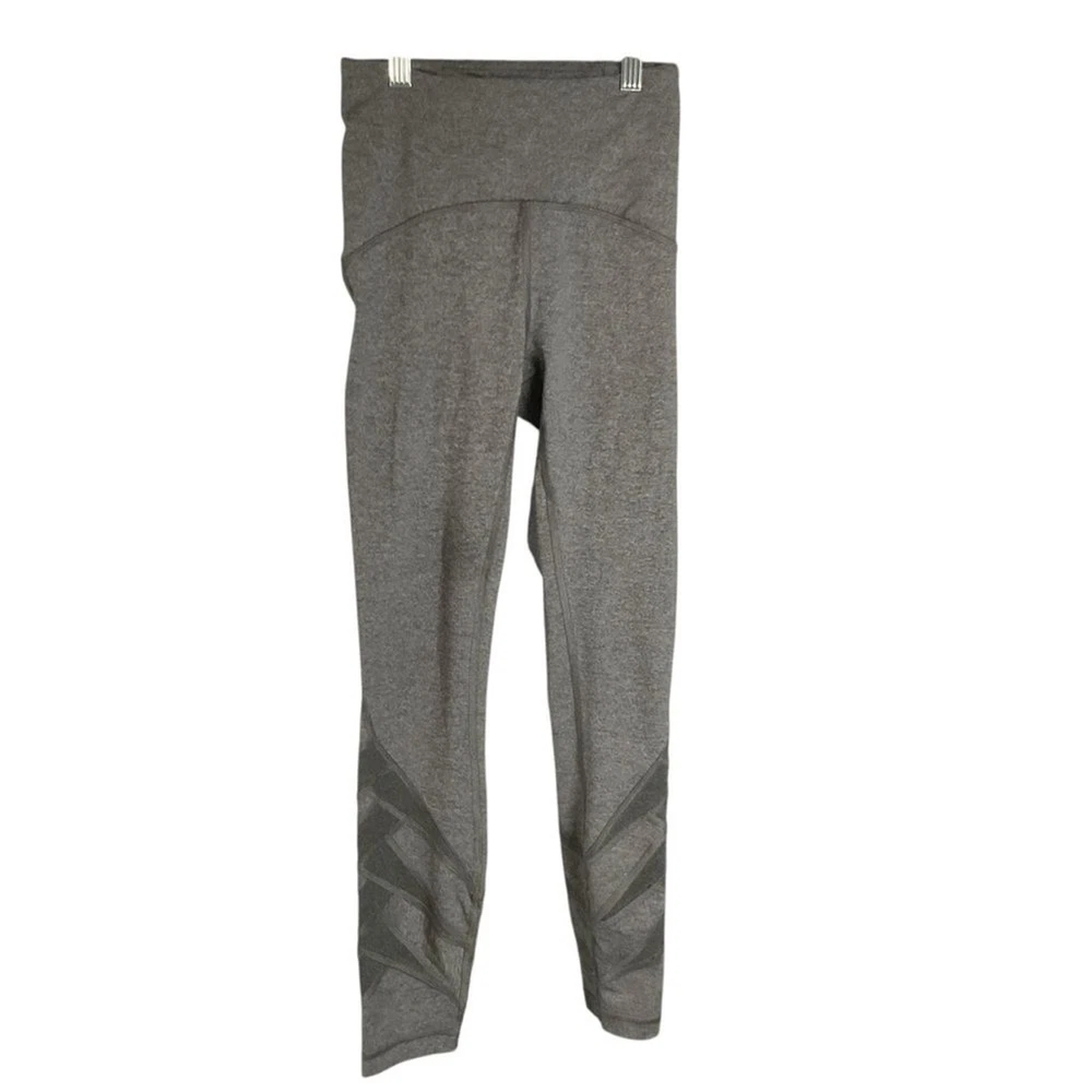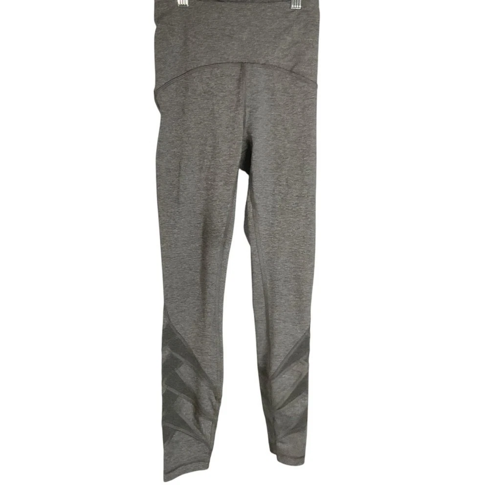 Lululemon Women's Gray Motionful 7/8 Leggings with Mesh Cut Outs Size 2 Features: 7/8 Ankle Length Mesh Cut Outs on Bottom of Legs. Inside Zippered Back Pocket Approx. Measurements flat: 11" waist 9" rise 24" inseam Good pre-owned condition: small stain on leg. See photos for condition details.