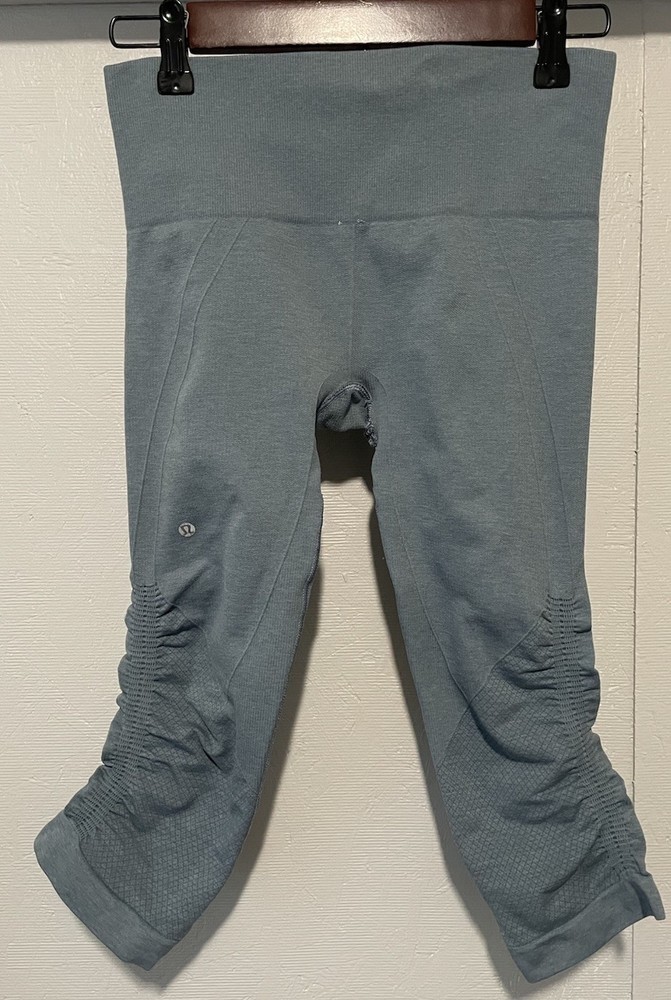 The Lululemon Ebb and Flow Crop Leggings in Heather Blue are designed for women who lead an active lifestyle, whether practicing yoga or jogging. These capri-style leggings in size 4 offer compression, elastic waist, comfort, stretch, and breathability. Made from nylon material, they are perfect for both casual wear and activewear occasions. The solid blue color and the brand's reputation for quality make these leggings a popular choice for women looking for stylish and functional bottoms for their workout routines.