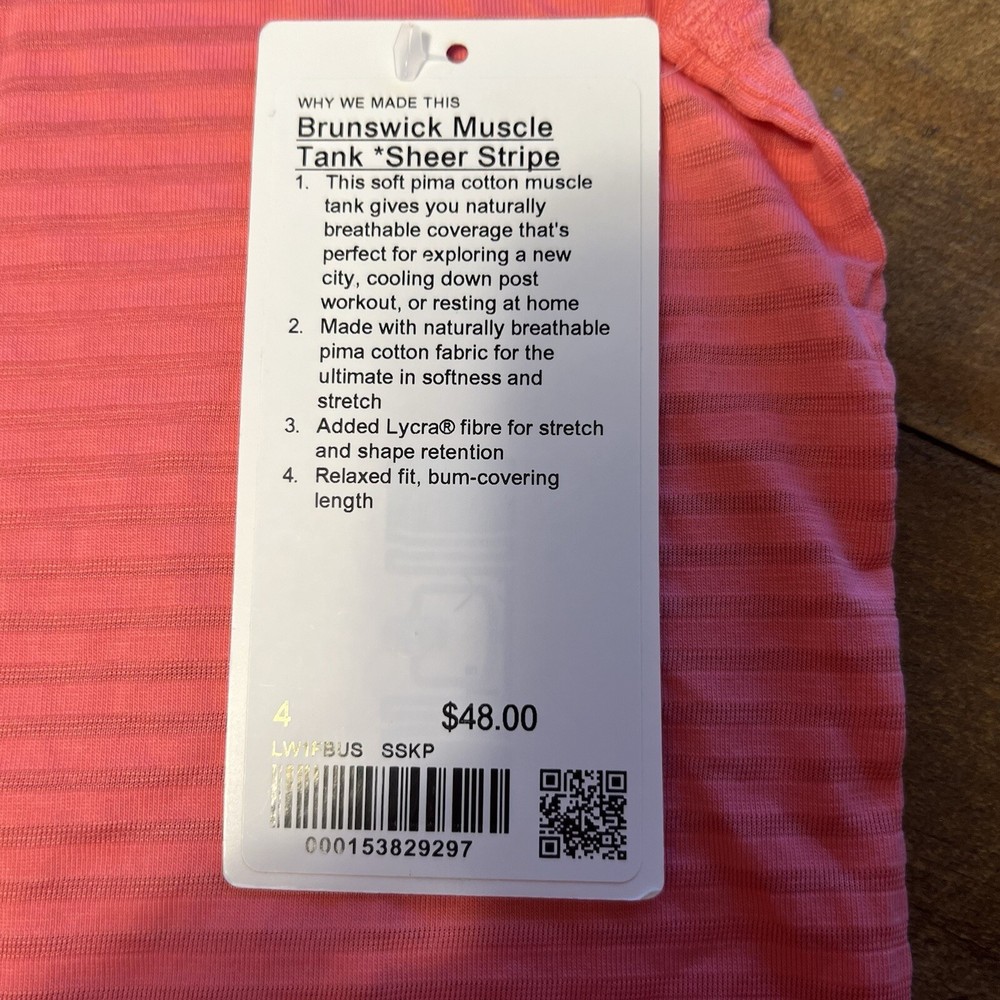 This Lululemon Brunswick Muscle Tank is a sleeveless activewear top in a pink color with sheer striped pattern. Made of a blend of polyester, Lycra, Lyocell, and cotton, it features a round neckline and a pullover closure for easy wearing. The tank is designed with an athletic fit and is suitable for various activities like tennis, cycling, yoga, and more. With its colorful and preppy style, this top is perfect for adding a touch of sporty flair to your workout wardrobe.