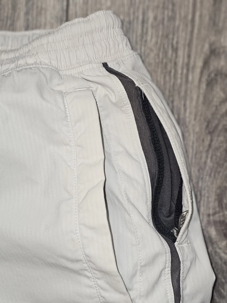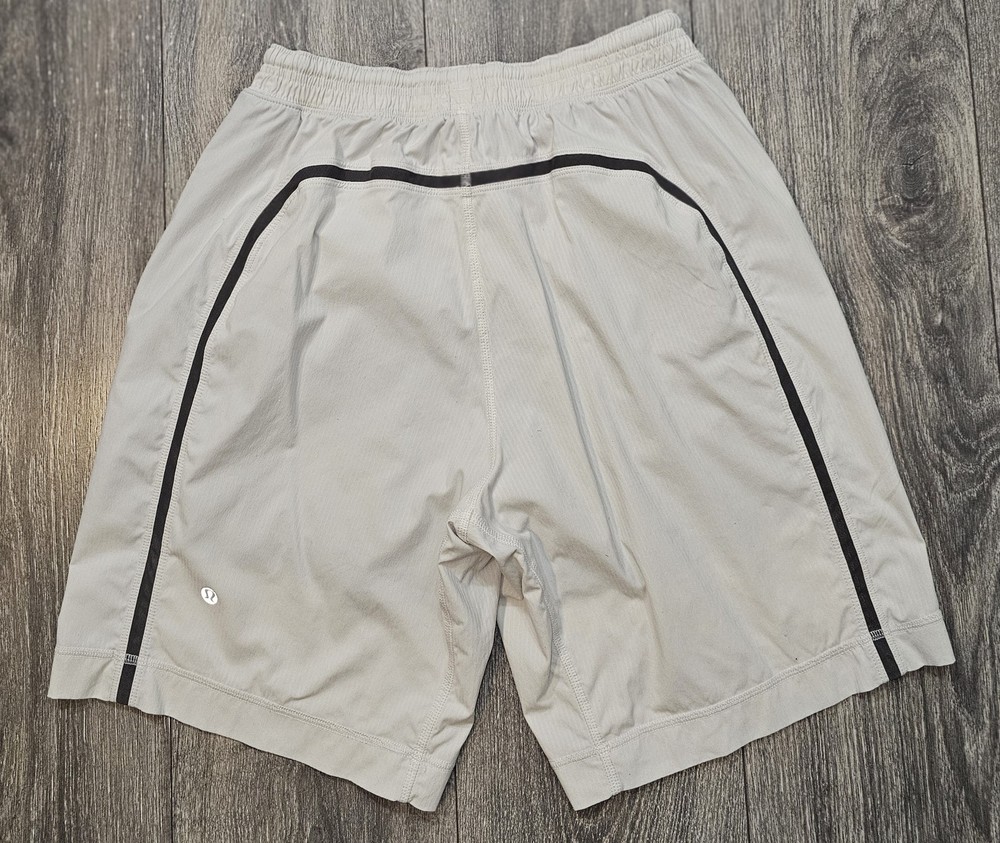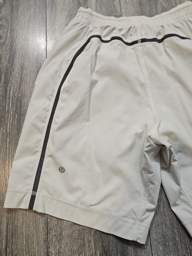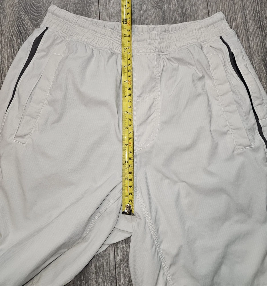 The product is a pair of Lululemon athletic running shorts in a size small, featuring an elastic drawstring closure, side zipper pocket, and a solid gray color. Made from a polyester blend fabric, these shorts have an 8-inch inseam and are designed for activities like gym training, cross-training, and running. The athletic style and fit make them suitable for outdoor, athleisure, preppy, and sports-themed occasions during the summer, fall, and spring seasons. The brand Lululemon is known for its high-quality activewear, catering to men who prioritize comfort and performance in their athletic outfits.