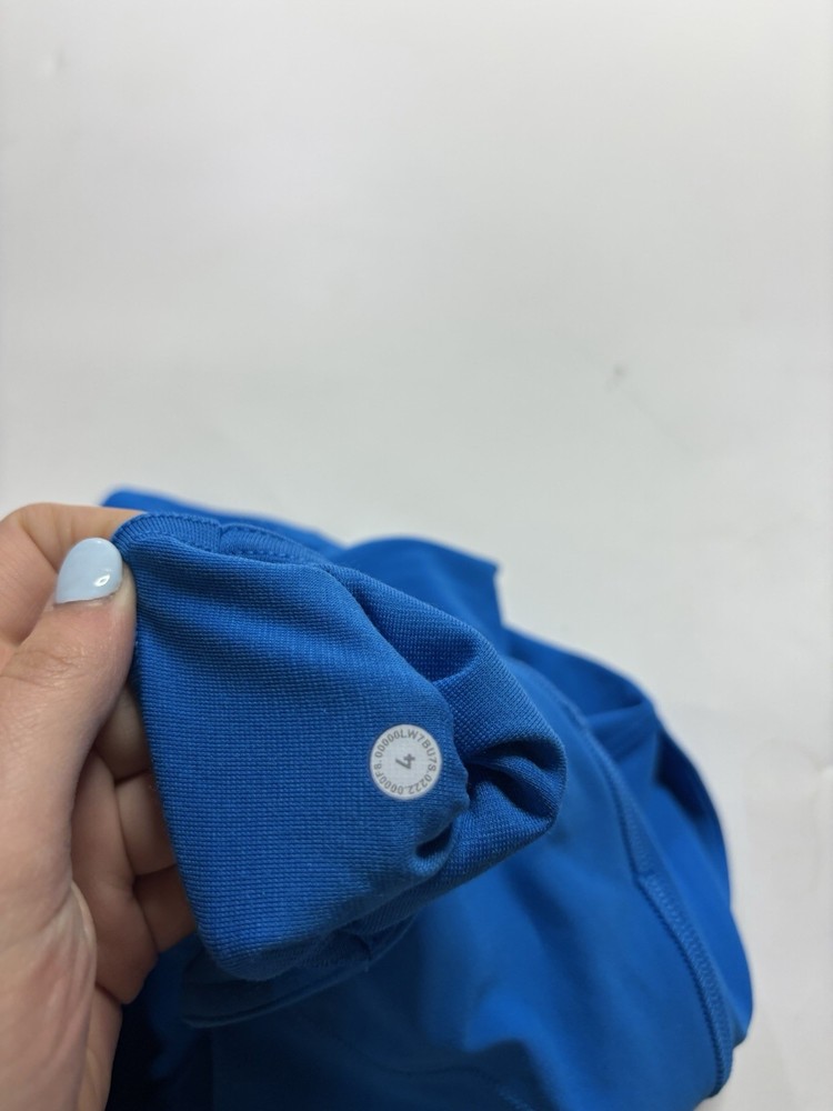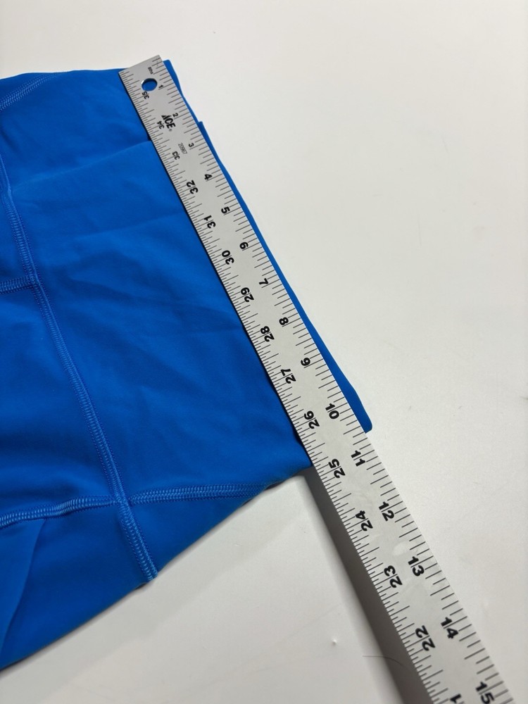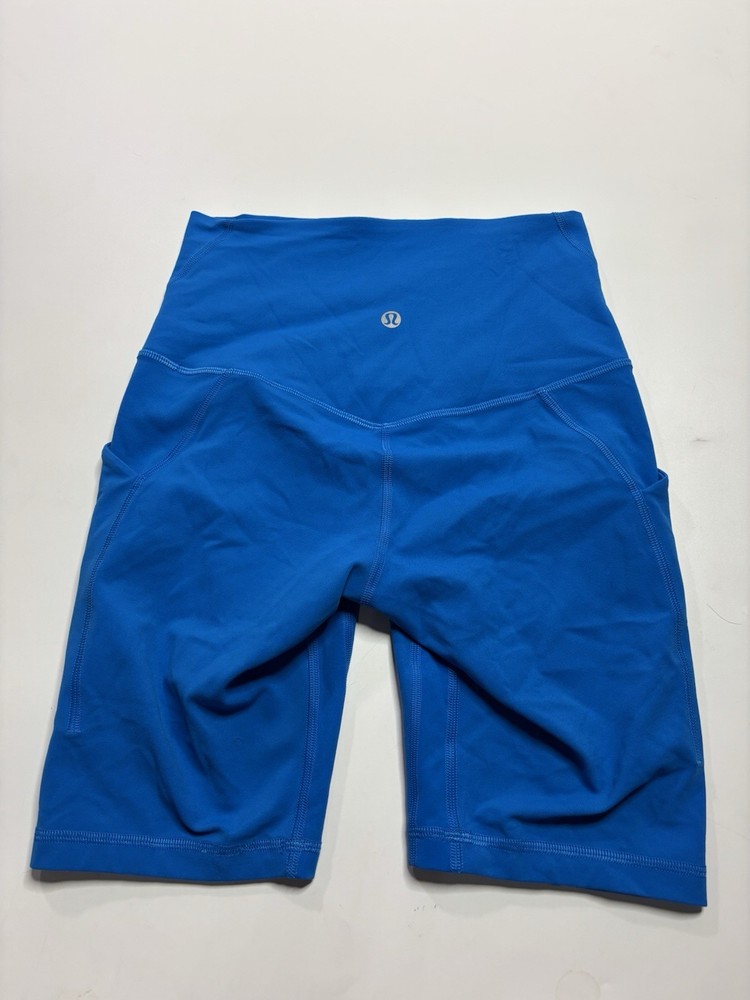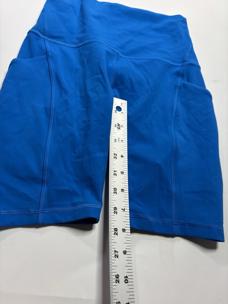 The Lululemon Blue Align Pockets Bike Shorts in size 4 feature a solid blue color and a comfortable 8-inch inseam, making them perfect for athletic activities and biker style. Made from nylon blended fabric, these shorts provide compression in the buttocks, thigh, and waist areas for support during workouts. The machine washable design ensures easy care, while the pockets add a functional touch to these versatile athleisure shorts from the trusted brand Lululemon.