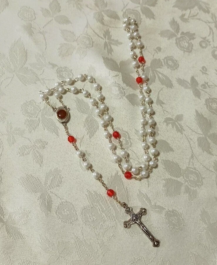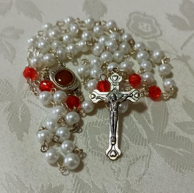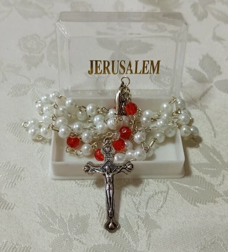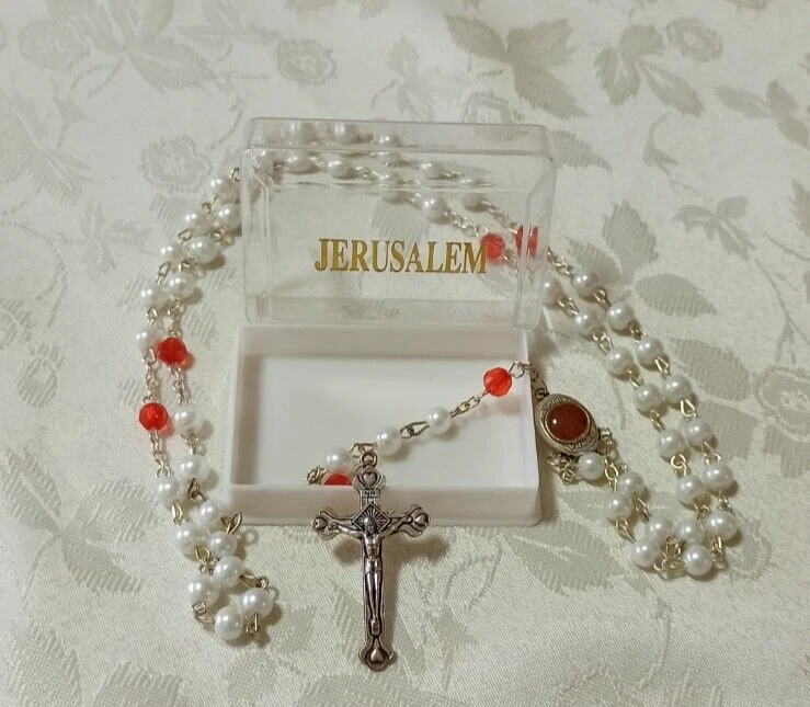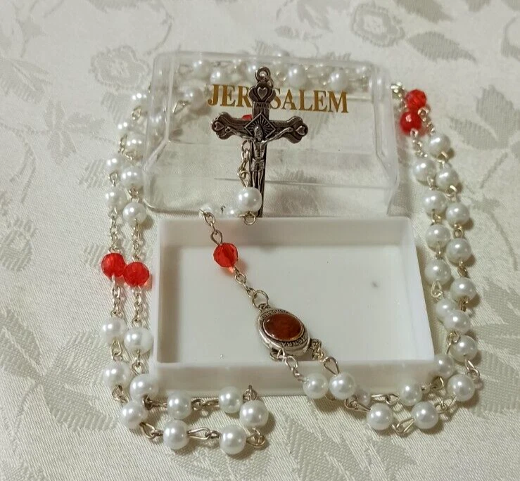This handmade Lulu Beads rosary is made of the best materials. This beautifully made deep red and white rosary contains Holy Soil from Jerusalem in the centerpiece that you can see in a small window. The words "Terra Jerusalem" are printed on the centerpiece around the Holy Soil window. The word "Jerusalem" is printed on the back of the crucifix. These deep purple rosary beads are faceted, meaning they will sparkle in the light from any angle. The rosary can be worn as a necklace and it is long enough to fit over most adult head sizes. Great attention to detail is evident in the craftsmanship of this pieces and it is simply beautiful. This I'd a rather rare piece and not many are found through any venue. It would make a wonderful addition to a collection. Thank you for looking and if you have further questions please feel free to contact me. Shipping I do ship worldwide by Registered mail with tracking number! Shipping time takes up to 21 business days. All additional payments such as tax, are the buyers responsibility. I ship only to the approved address that Registered in PayPal. handling time: 1 business day . return policy: I check myself each product and sell only the best quality products. In any case, if you are not satisfied with the product, first, please contact me and I will do everything to your satisfaction. In any case you have a 100% Guarantee and refund. I accepted within 14 days, In its original packaging and on condition the item is its original condition as received. buyer pay for shipping and all additional payments such as tax. Payment I accept PayPal only please. My customers are very important to Me! Please, In case of any problem or question, please feel free to contact me and I will do everything I can to make you be satisfied! feedback: I give immediate positive feedback for buyer as soon as payment is received for the purchase. In any case of problem contact me right away before leaving feedback so I will do my very best to resolve any problem, and to make you satisfied. Thank you for shopping