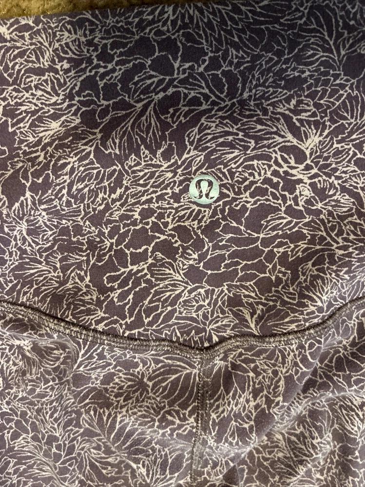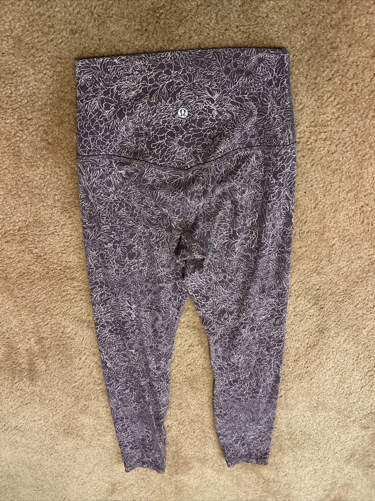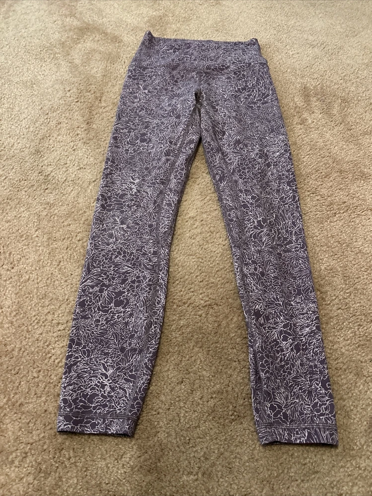 Elevate your activewear game with these designer Lululemon Align leggings. The floral pattern and purple color add a touch of style to your workout wardrobe. The leggings feature a pull-on closure, skinny leg style, and a 25-inch inseam, making them perfect for yoga and other athletic activities. Made with a blended fabric of Nulu material, these leggings are lightweight, breathable, and water-resistant. They also provide compression in the buttocks, waist, and legs, along with features like slimming, shaping, quick-dry, and moisture-wicking. These leggings are machine washable and easy to care for. Get ready to feel comfortable and stylish during your workout with these Lululemon Align leggings.