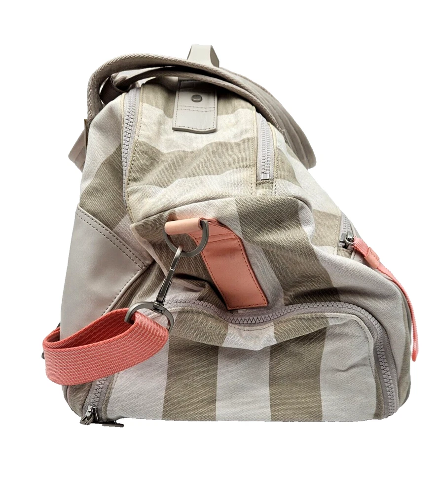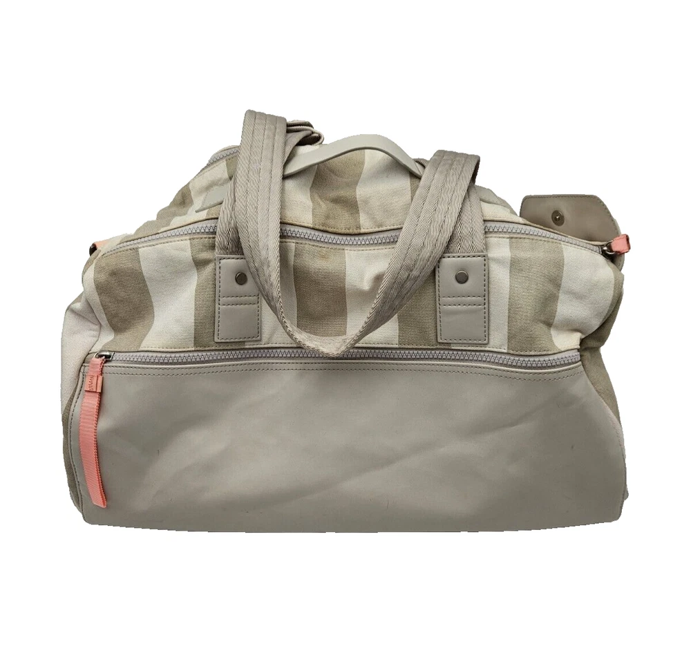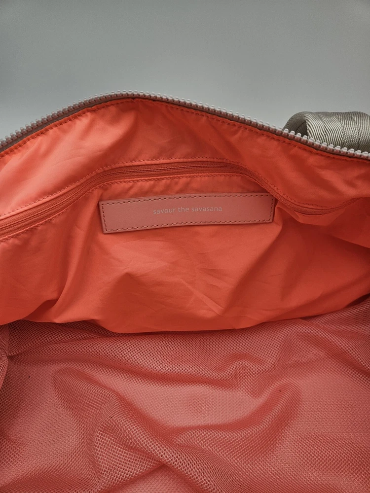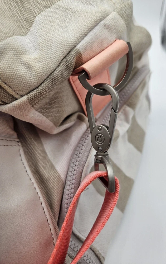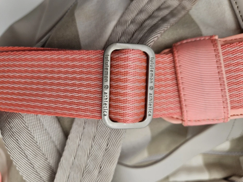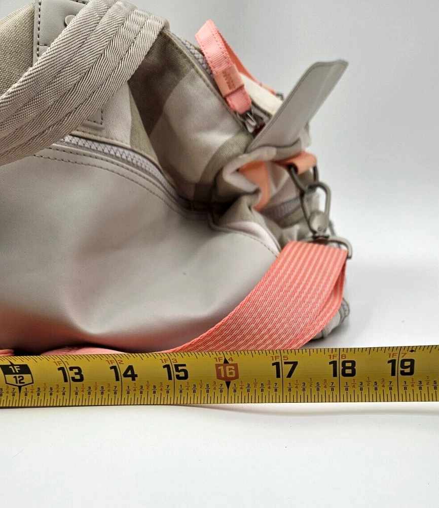 This Lululemon Bag is perfect for travel or any gym or training session. With a convenient zip closure, it's easy to store all your essentials. Has shoe storage. The bag is made of durable nylon, canvas, and leather materials, ensuring it can withstand the wear and tear of daily use. The medium-sized bag features a stylish beige and pink color combination and has a height of 11 inches, length of 18 inches, and depth of 10 inches. It's designed to cater to the needs of women and is ideal for storing gym clothes, tablets, shoes, and other accessories. Whether you're heading out for a workout or need a bag for the weekend, this Lululemon Athletic bag is the perfect choice.