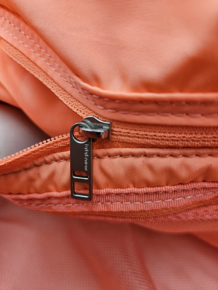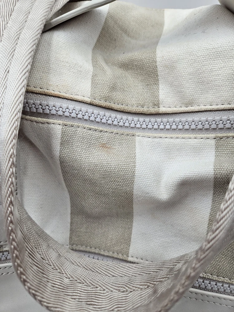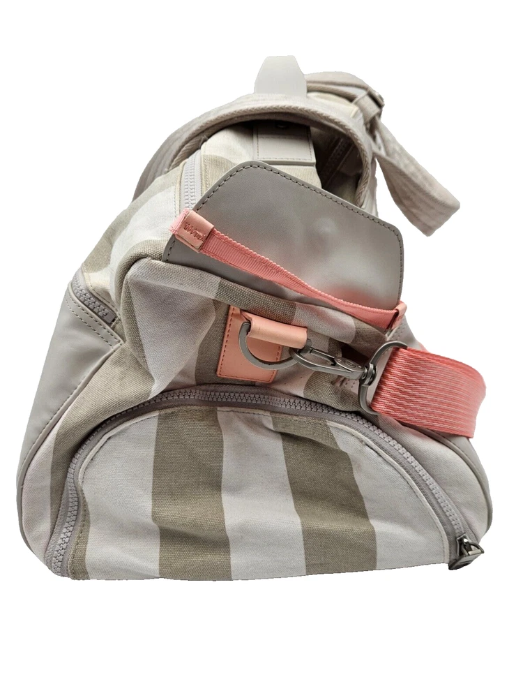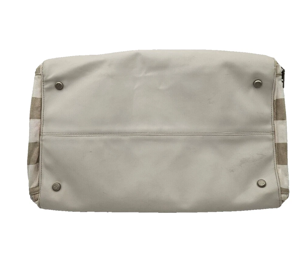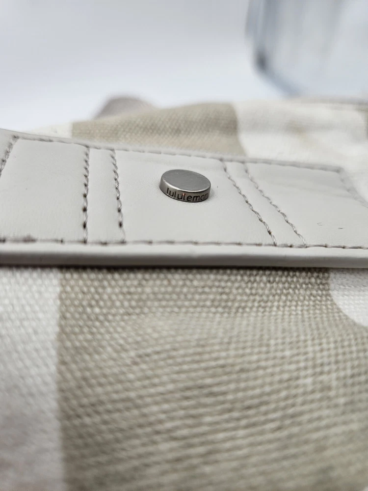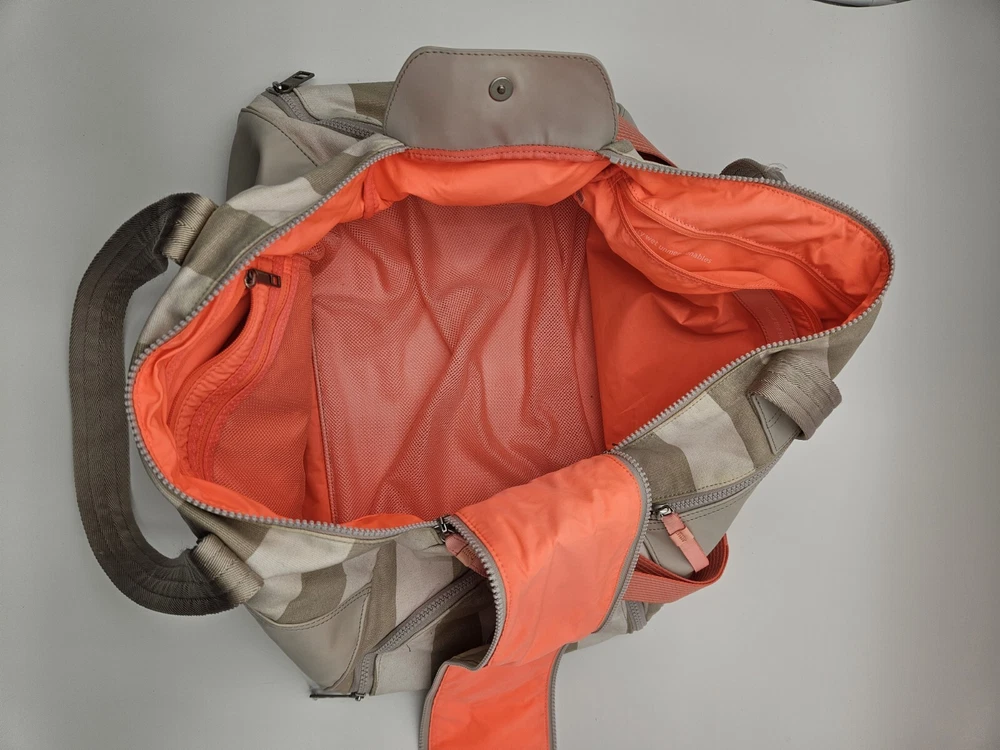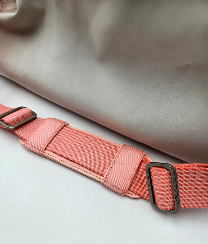 This Lululemon Bag is perfect for travel or any gym or training session. With a convenient zip closure, it's easy to store all your essentials. Has shoe storage. The bag is made of durable nylon, canvas, and leather materials, ensuring it can withstand the wear and tear of daily use. The medium-sized bag features a stylish beige and pink color combination and has a height of 11 inches, length of 18 inches, and depth of 10 inches. It's designed to cater to the needs of women and is ideal for storing gym clothes, tablets, shoes, and other accessories. Whether you're heading out for a workout or need a bag for the weekend, this Lululemon Athletic bag is the perfect choice.