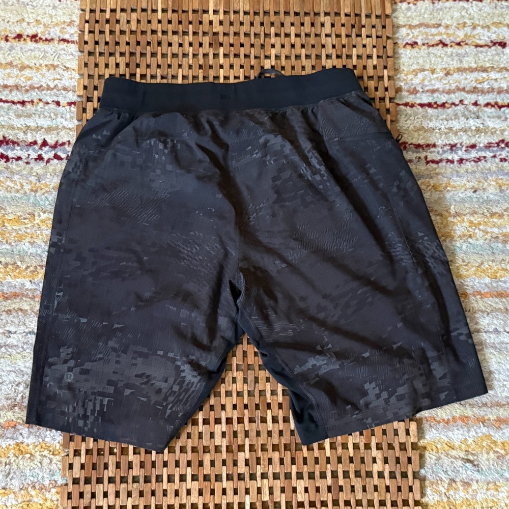 The Lululemon Camo Performance Stretch Shorts in Black, Men's Size Large, are perfect for active occasions such as gym workouts and training sessions. Made from a polyester blend fabric with a drawstring closure, these shorts offer a comfortable and stretchy fit. The camouflage pattern adds a stylish touch, while the machine washable design makes them easy to care for. Ideal for the summer and spring seasons, these athletic shorts from the trusted brand Lululemon are a great addition to any man's activewear collection.