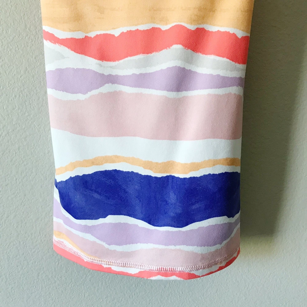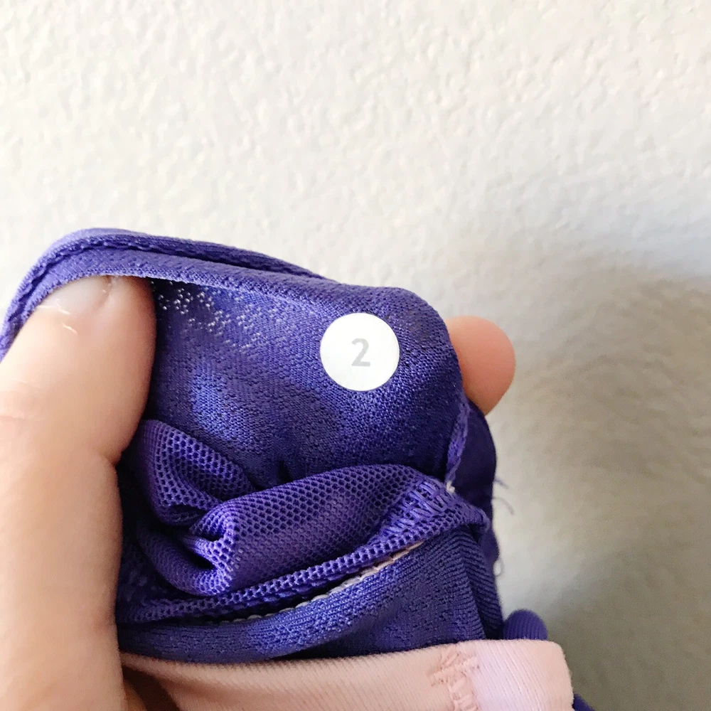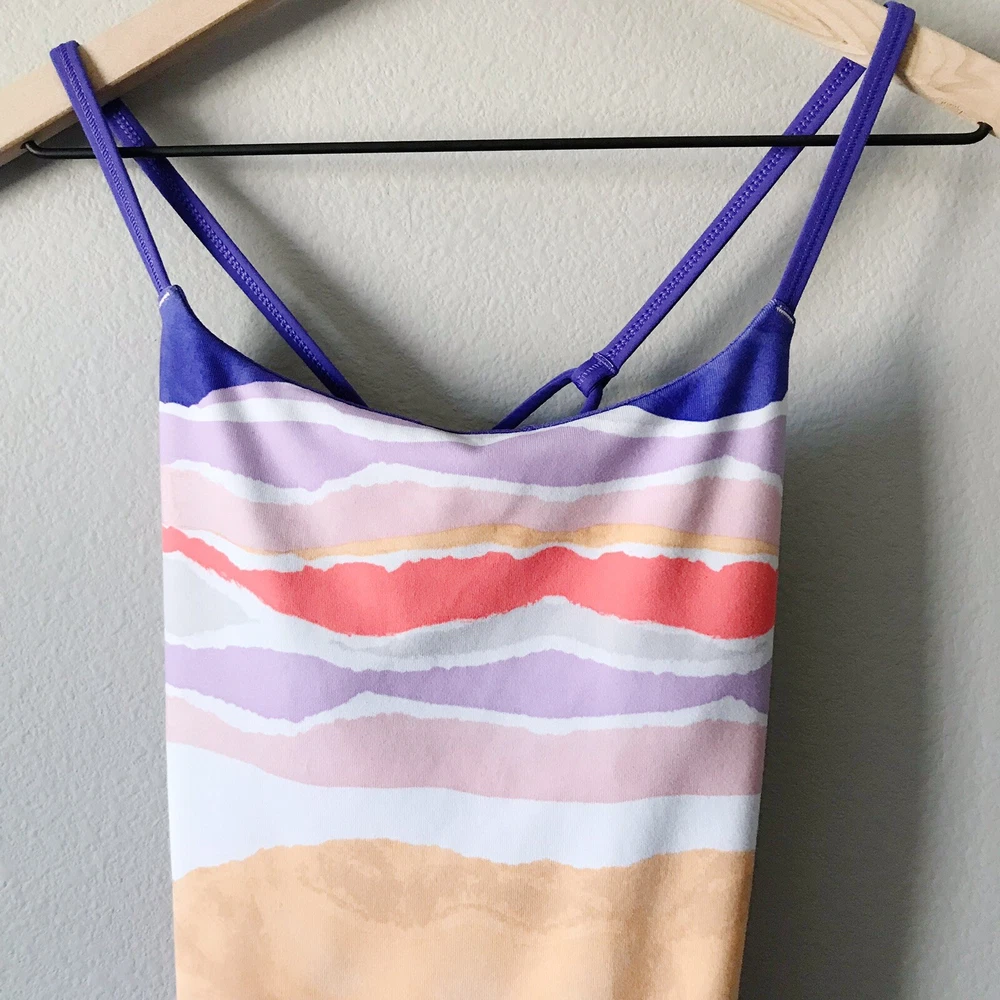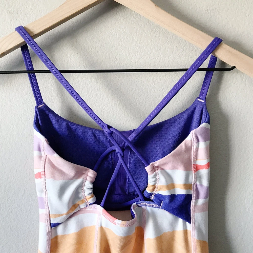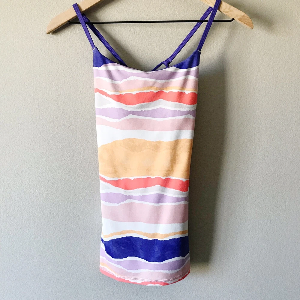 Lululemon Athletica Dancing Warrior Tank in Bleacher Stripe White Iris Flower/Iris Flower. Size 2 (see size dot). Luon fabric. Adjustable strappy back. Moisture wicking and breathable. Stretchy. Pockets for cups, but cups are not included. Retailed for $58. Pre-owned, excellent used condition.