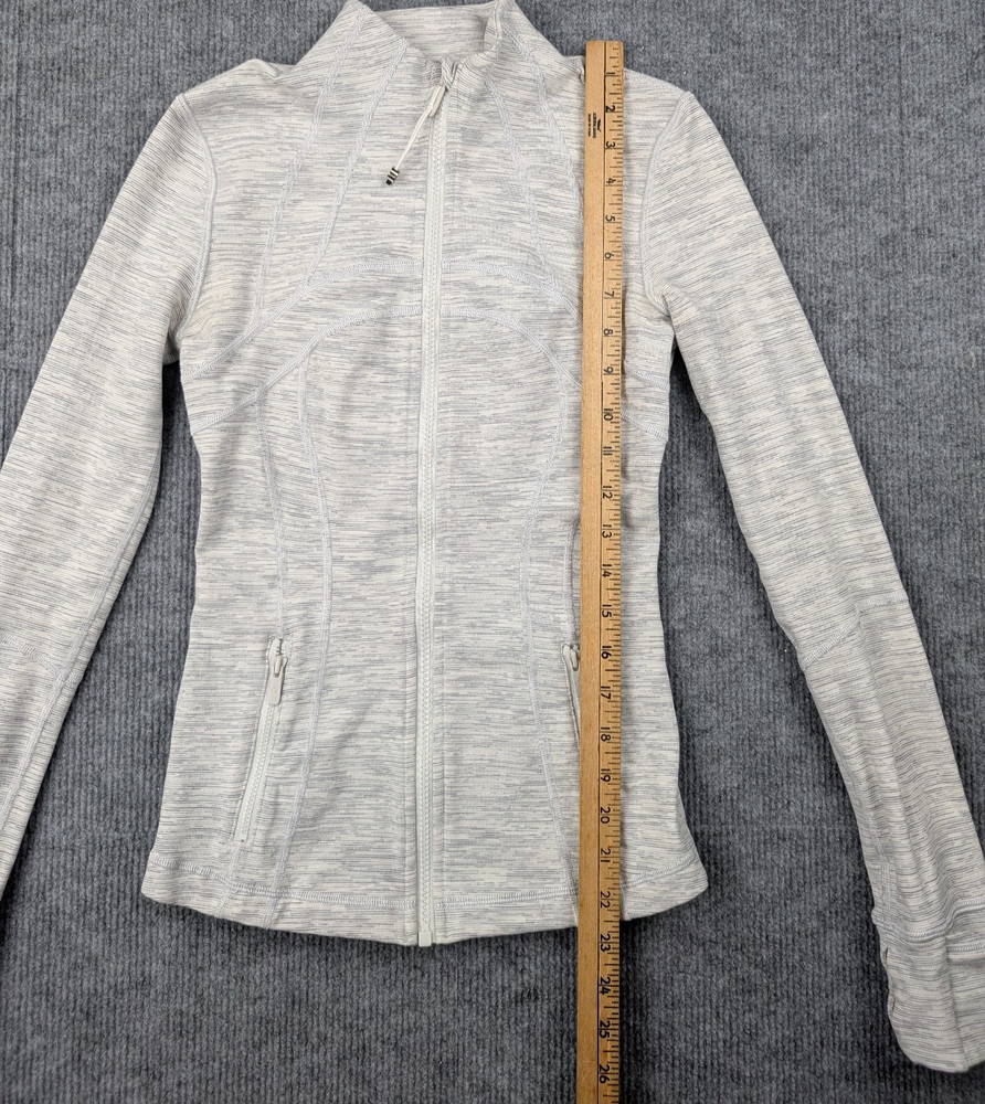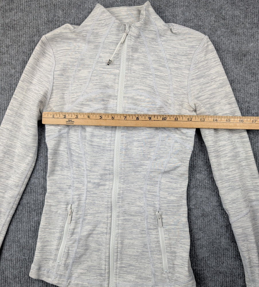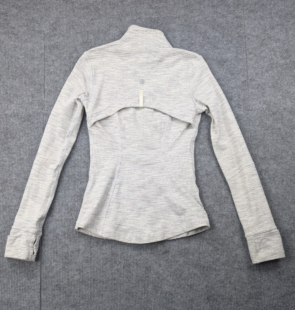Brand: Lululemon Size: 2 Size Type: Regular Department: Womens Type: Jacket Color: Gray Outer Shell Material: Polyester Blend Style: Full Zip Features: Stretch, Breathable, Thumb Holes, Lightweight Performance/Activity: Running, Yoga, Gym