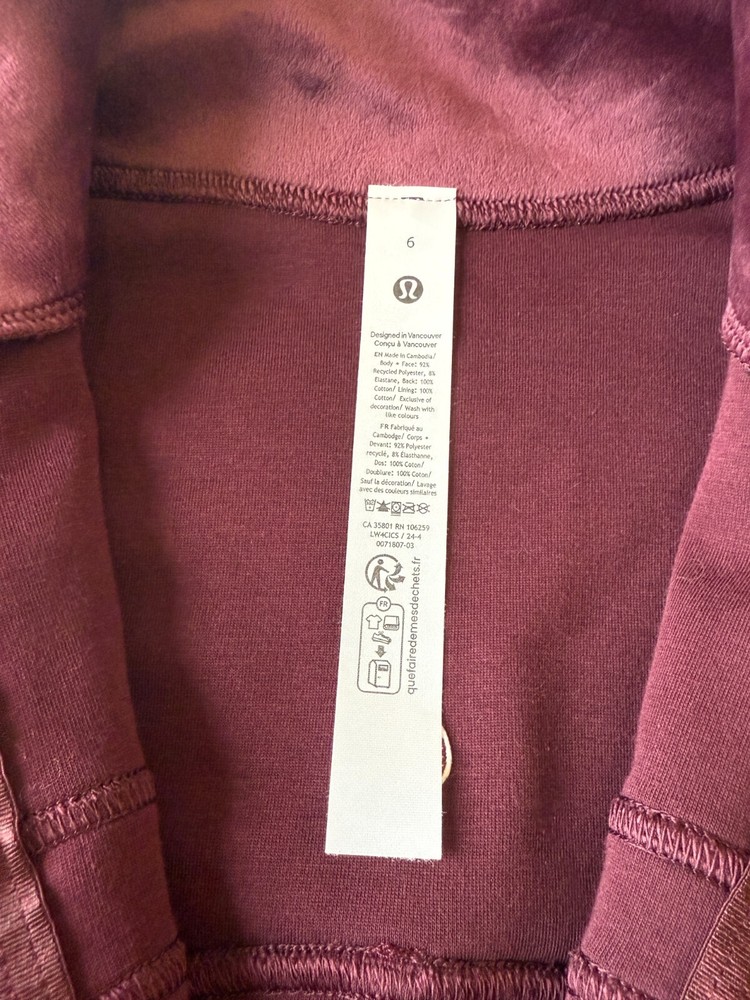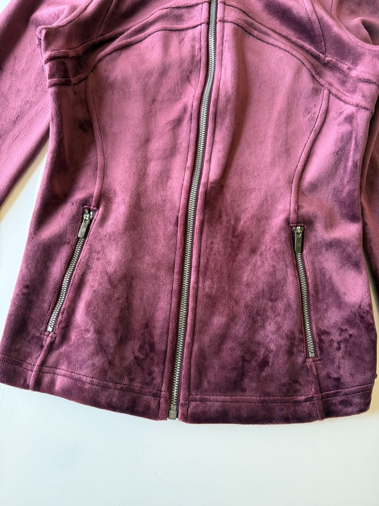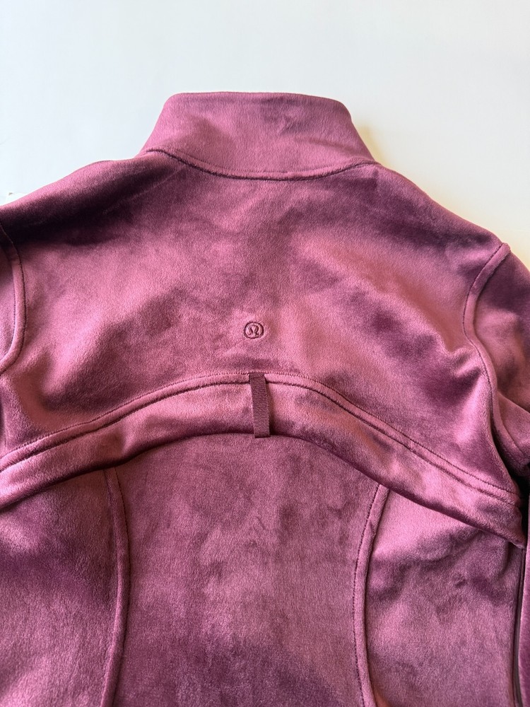 Stay cozy and stylish in this pre-owned * Lululemon Define Jacket Velvet in the beautiful Garnet color (size 6). Made from a soft cotton-blend velour fabric, this jacket features a sleek, fitted silhouette with thumbholes and zippered pockets. Details: Style: Define Jacket *Velvet Color: Garnet Size: 6 Soft velour fabric with stretch Full zip front, thumbholes, zippered pockets Gently pre-owned – shows light wear typical of velour (see photos), no holes or major flaws Returns not accepted – please review photos and sizing before purchase.