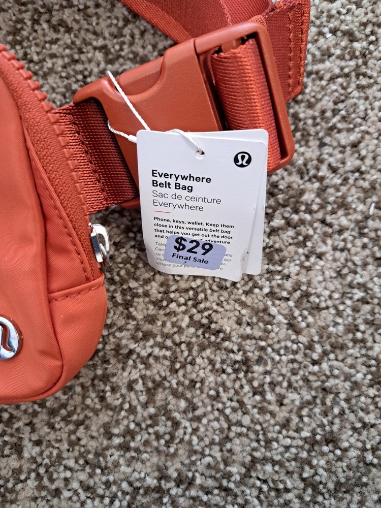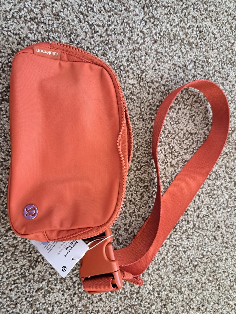 The Lululemon Everywhere Belt Bag is a small rectangular bag with a zip closure and a black crossbody strap. Made of fleece fabric with a matte finish, this belt bag is designed for everyday use with a classic solid pattern. The exterior is in a burnt orange color with silver hardware accents, while the interior features a nylon strap, adjustable strap drop, and multiple pockets for organization. Perfect for hands-free convenience and on-the-go style, this Lululemon Everywhere Belt Bag is a versatile accessory for women on the move.