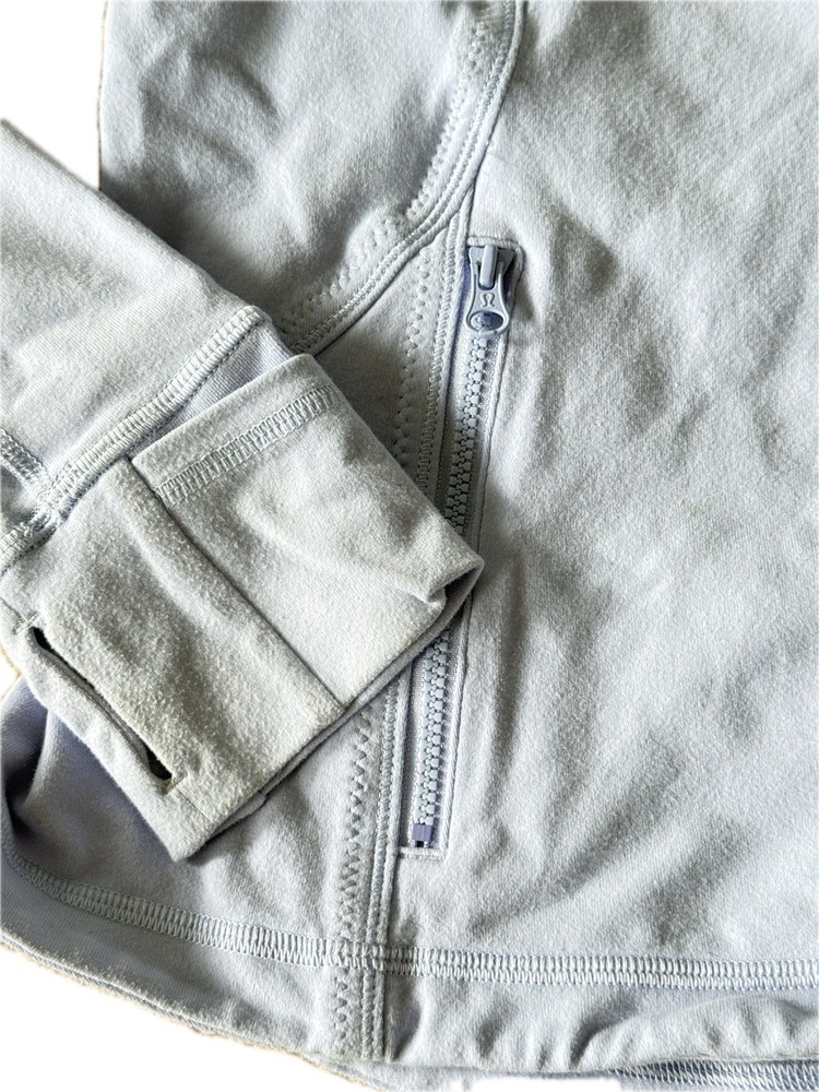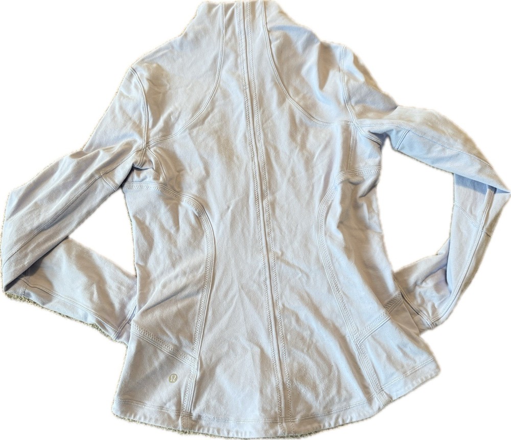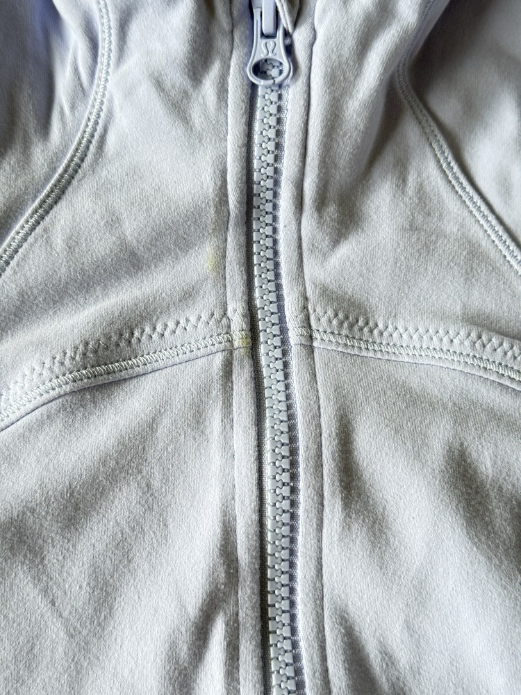 Lululemon Forme Jacket Cool Breeze (light purple/blue) Size 10 Style #W4B27S *Has some stains on front and cuffs as shown in photos. I have not tried to remove the stains yet. Why we made this When we're heading to class, we want a cozy mid-layer that can stand on its own. We designed this stretchy luon fabric jacket with zipper pockets to hold our gear for us while we grab a tea with friends before we head in to the studio. Key features secure zipper pockets for your phone, keys and cash thumbholes keep your sleeves in place and make layering easy moisture-wicking fabric helps pull sweat away from post-practice skin park that zip in the zipper garage before it scratches your chin mesh venting in the armpits helps you let off steam dropped hem for more coverage in the rear Tech specs designed for: yoga, run fabric(s): luon® properties: four-way stretch, moisture-wicking, preshrunk, chafe-resistant, breathable fit: fitted length: mid-hip