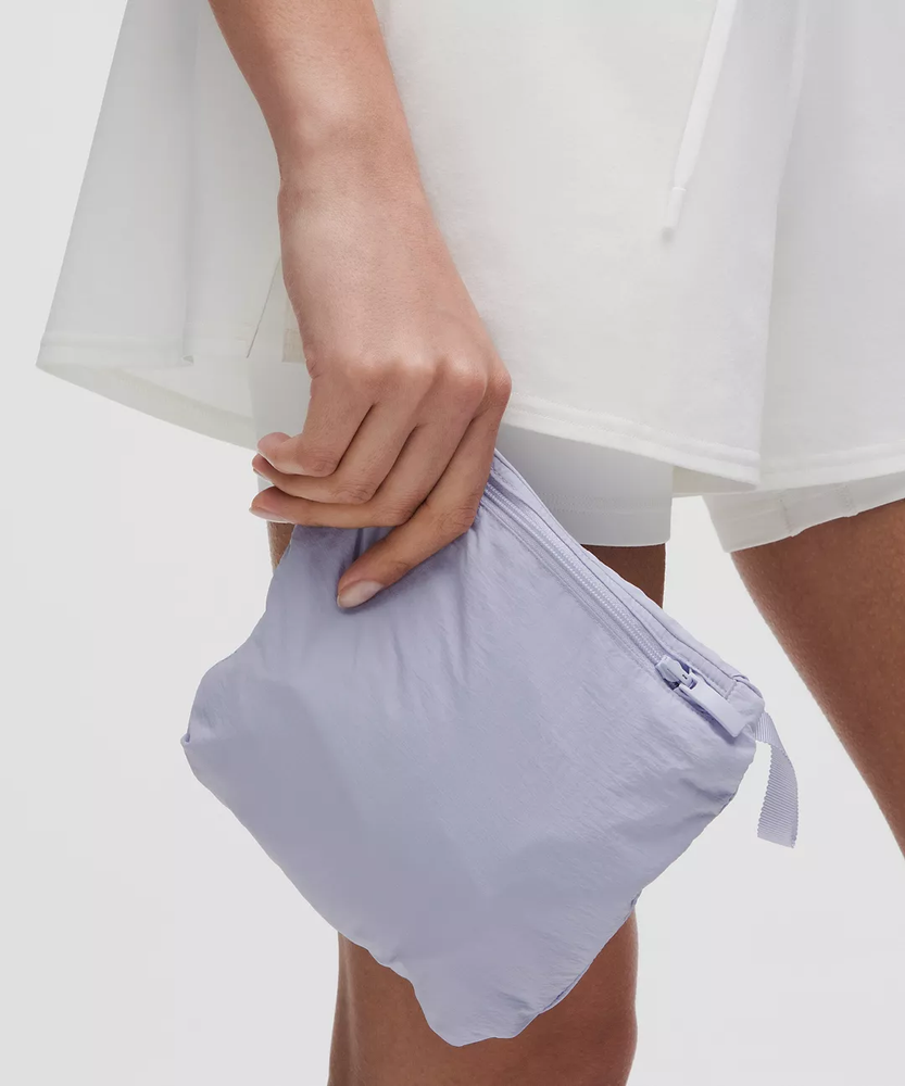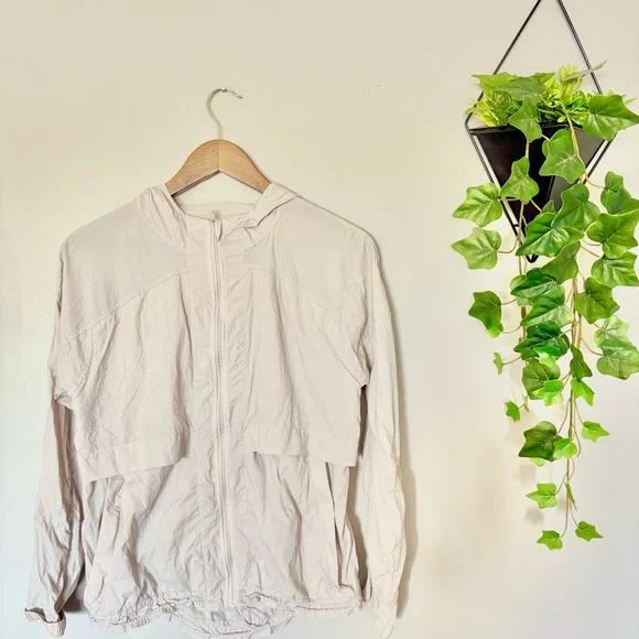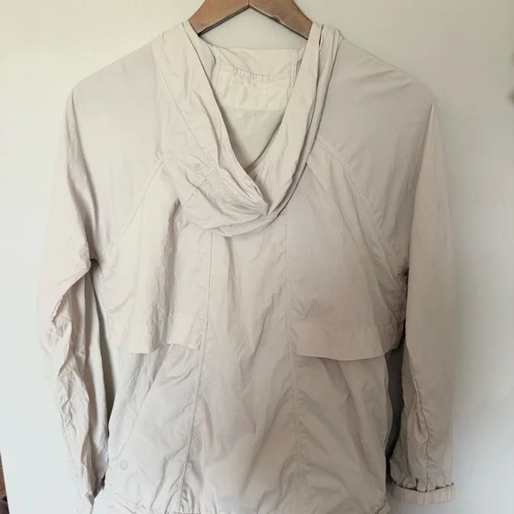 LULULEMON Hood Lite relaxed-fit jacket in colour "Chrome" size 6. Previously loved but in excellent condition. This jacket is unlined and is water and wind repellent. It zips into a convenient bag for easy carrying, as shown in the photo (this photo is not the actual colour and is only shown for an example). Waist length, cinchable hem, and pockets on both side.