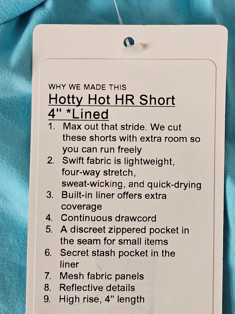 Style: Athletic Department: Women Closure: Drawstring Fit: Athletic Performance/Activity: Baseball, Basketball, Beach, CrossFit, Cross Training, Dance, Driving, Football, Golf, Gym & Training, Hiking, Hockey, Hunting, Lacrosse, Pilates, Rugby, Running & Jogging, School, Soccer, Squash, Tennis, Track & Field, Volleyball, Walking, Weightlifting, Yoga Size Type: Regular Inseam: 4 in Color: Blue Pattern: Solid Product Line: Lululemon Hotty Hot Brand: Lululemon Occasion: Activewear, Casual Size: 8 Features: Lightweight, Lined, Pockets, Swift Fabric, Quick-Drying, Four-Way Stretch, Sweat-Wicking, Reflective Details, Secret Stash Pocket, Zip Pocket