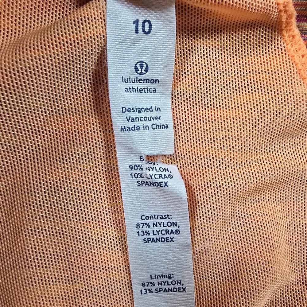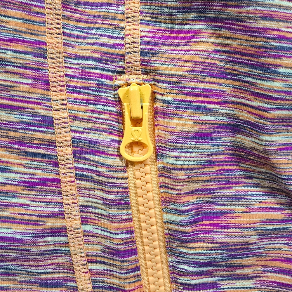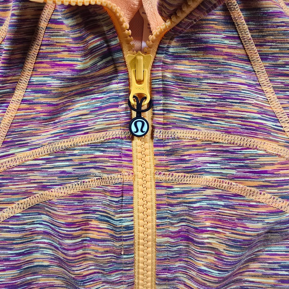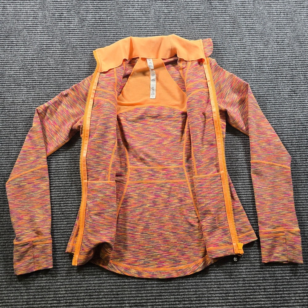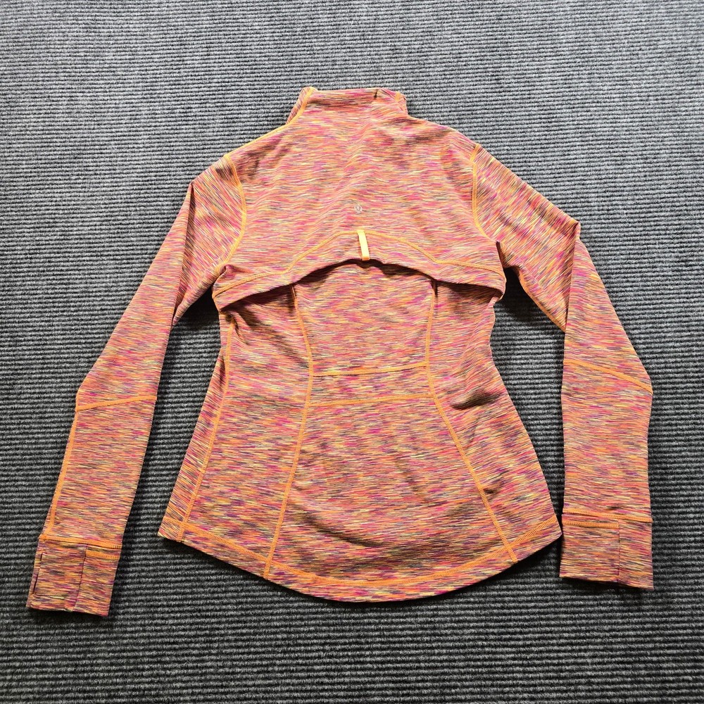 Bright and functional lululemon Run: Inspire athletic jacket with a full-zip front and high collar. Multicolor heathered orange and pink fabric with contrast stitching, zippered hand pockets, and a signature back vent panel for breathability during runs. Great for running, training, or layering on cooler days. Color may vary slightly from photos due to lighting and monitor settings. Details: Brand/Model: lululemon athletica Run: Inspire Style: Full Zip Running Jacket Color/Wash: Orange / Pink Multicolor Heather Size: Tag size 10 Fabric: Body: 90% Nylon / 10% Lycra® Spandex Contrast: 87% Nylon / 13% Lycra® Spandex Lining: 87% Nylon / 13% Spandex Condition: Pre-owned, good condition; no holes or stains noted Key Note: Back vent detail, zip pockets, breathable mesh lining