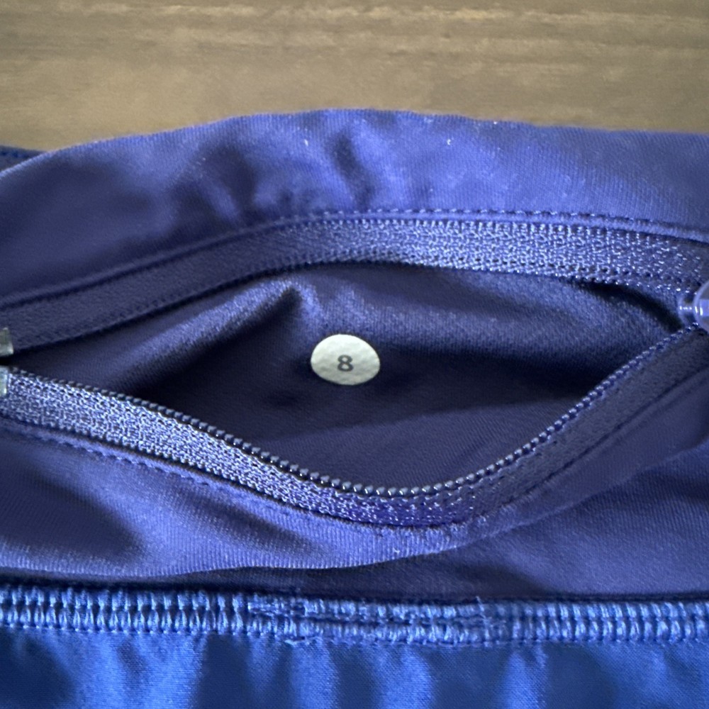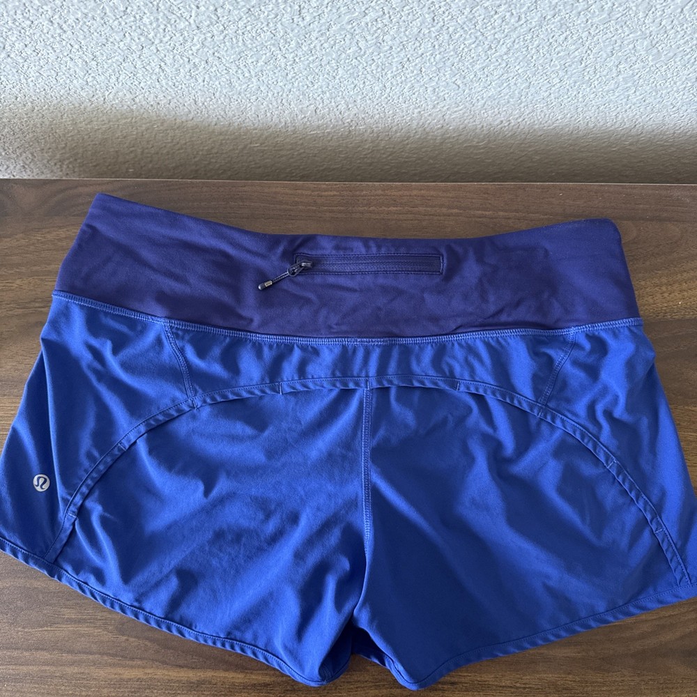 The product is a pair of Lululemon shorts for women in size 8, designed for athletic activities such as running, gym training, and cross training. The shorts are a solid blue color, featuring a 4-inch inseam and the brand's logo as a theme. Made for outdoor sports, the shorts are versatile and suitable for various physical activities, making them a practical and stylish choice for active women on the go.