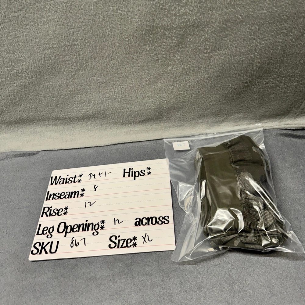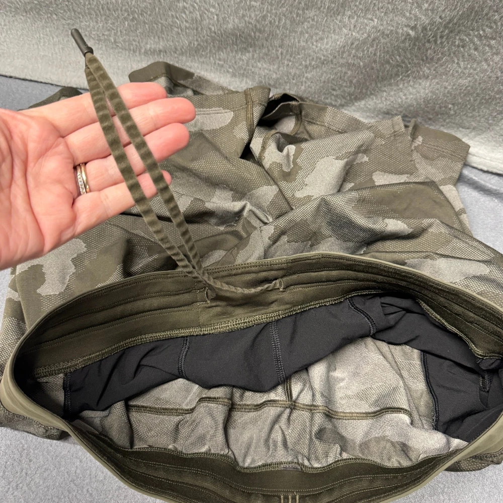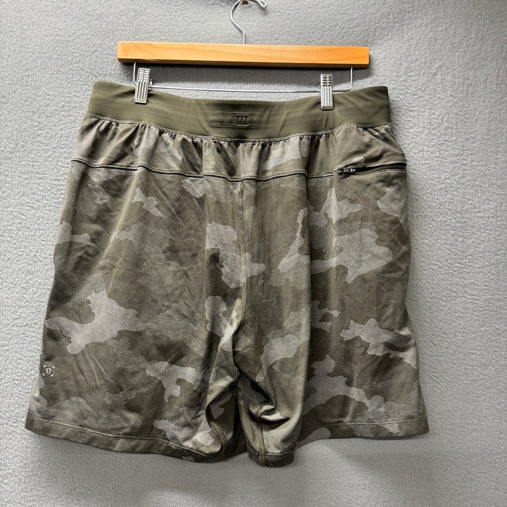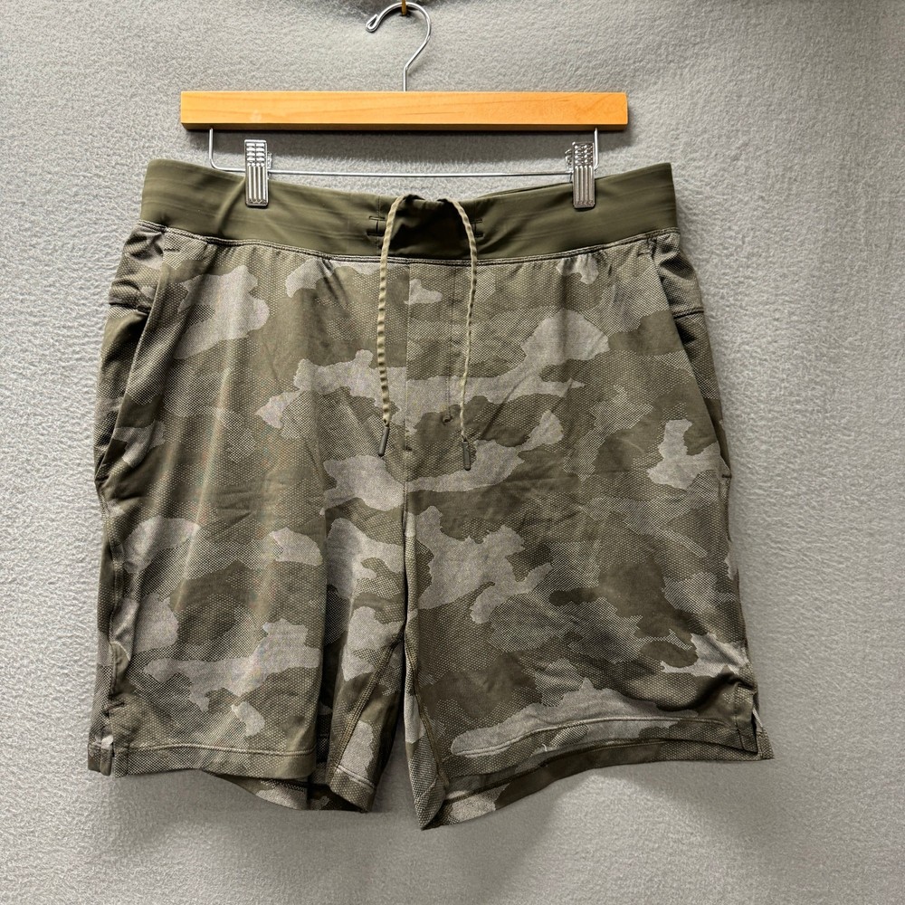 Lululemon Shorts Mens XL Green Gray Camo Athletic + Pockets Linerless Activewear Very good condition, see all pictures for views. •Waist: 34" Not stretched or cinched •Inseam: 8" •Rise: 12" Ships out same day or next open postal day. Thank you for your purchase, we appreciate you!
