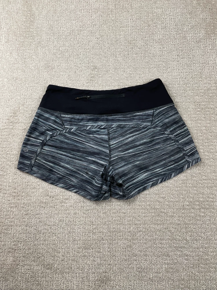 The product is a pair of Lululemon women's black athletic shorts in size 4. They feature a solid pattern with a stripe design, a 4-inch inseam, and are made from a blended fabric with stretch and lining for comfort. Ideal for running and jogging in the summer and spring seasons, these shorts offer a tight athletic fit and are machine washable for easy care. Perfect for active women looking for high-performance activewear that combines style and functionality.