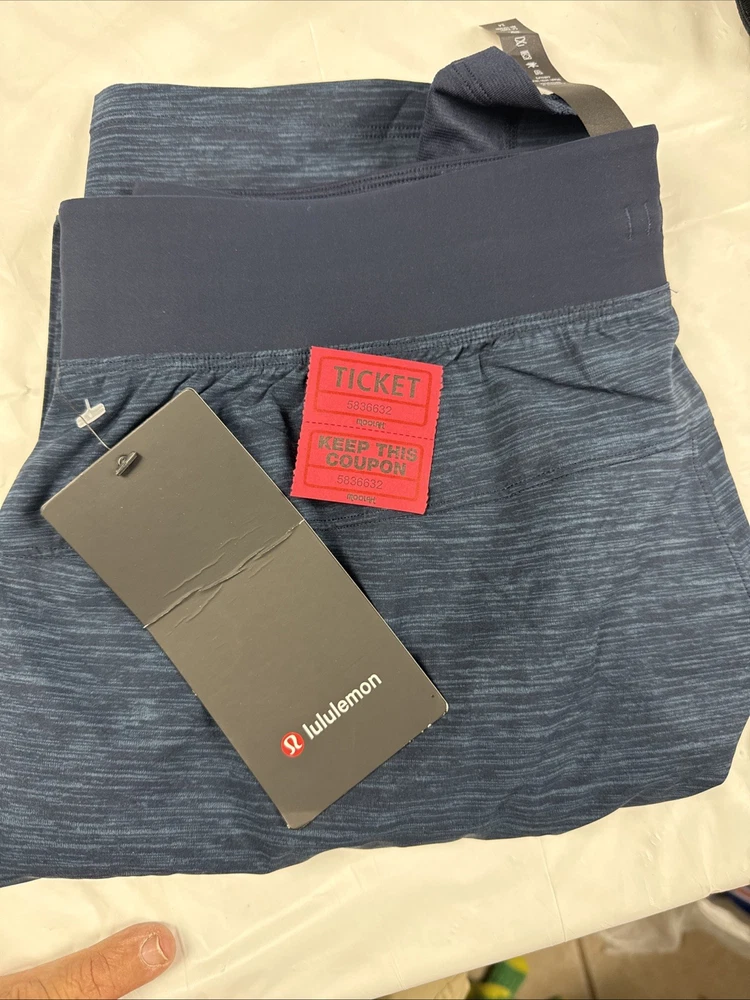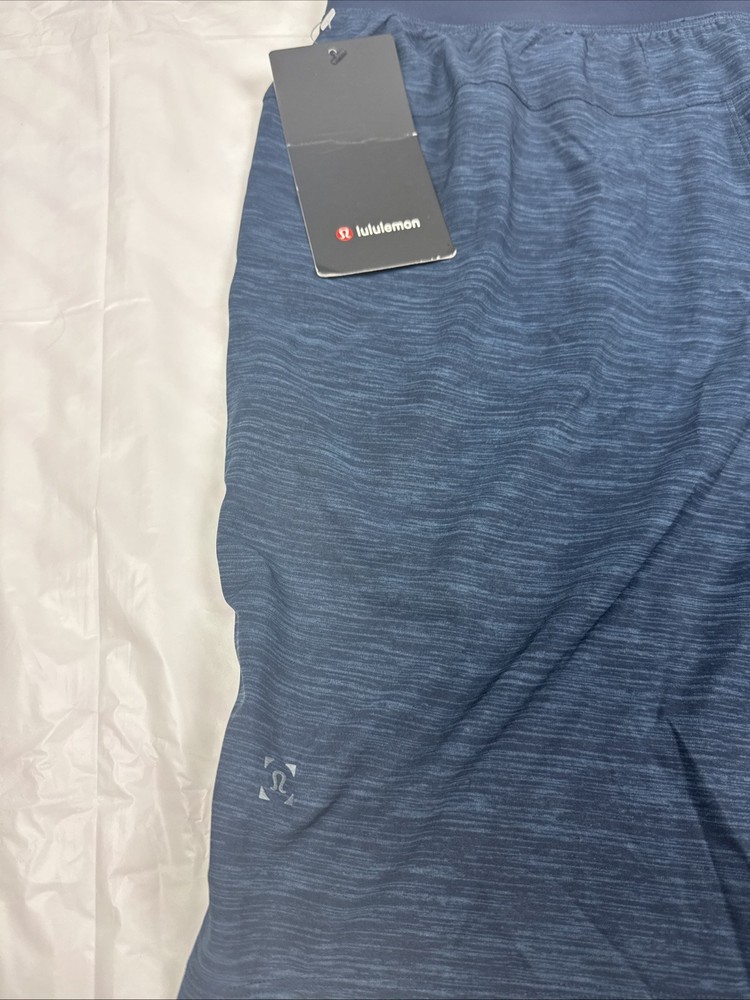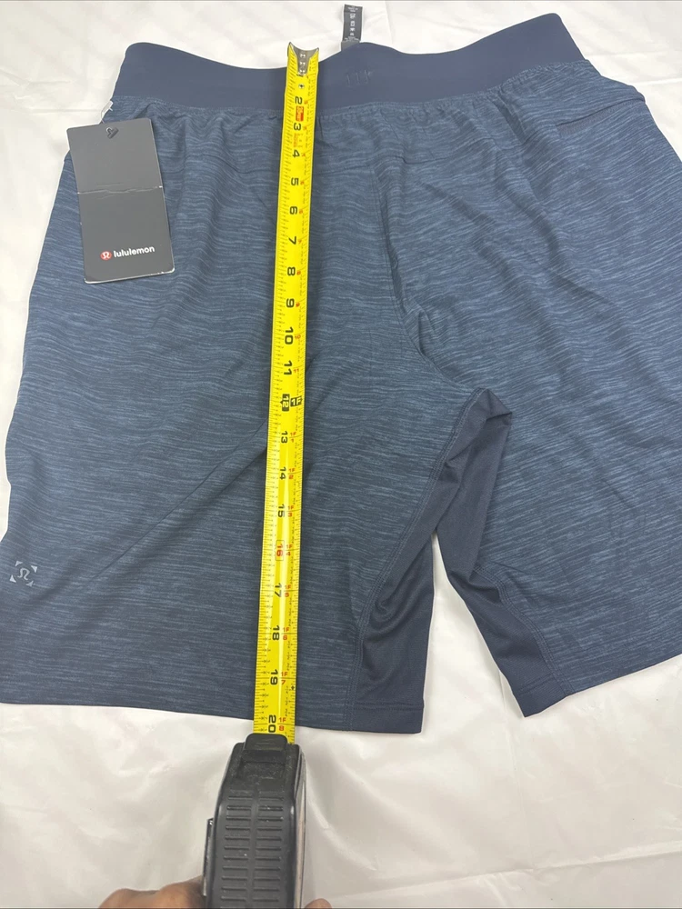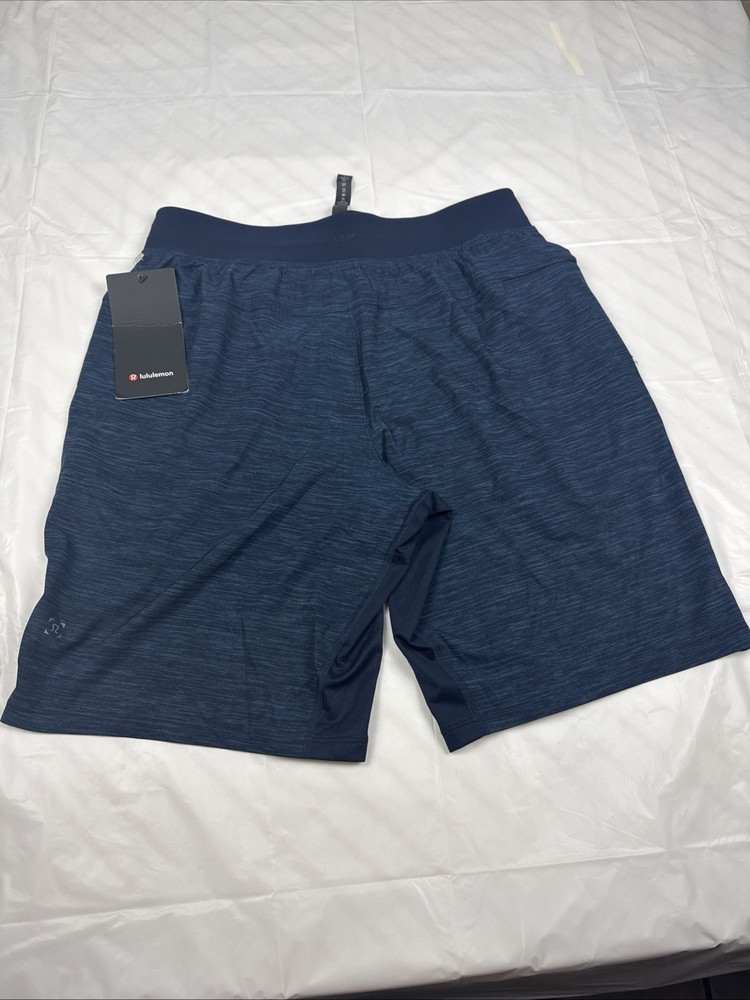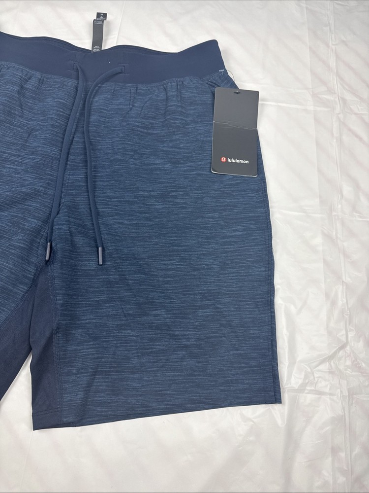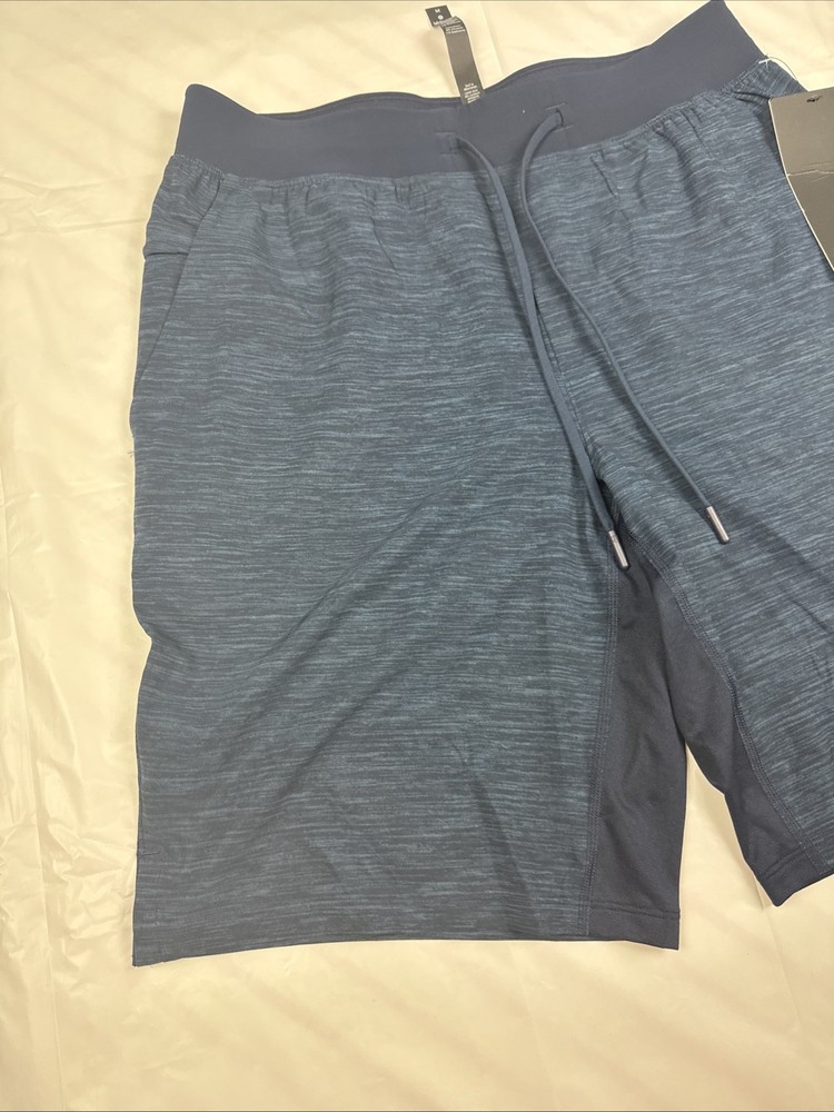 The Lululemon T.H.E. Shorts in navy blue are designed for men with a medium size and a 9" inseam. These athletic performance shorts are lined for added comfort and feature an elastic waist with a drawstring closure for a secure fit. Made from a blend of polyester and elastane, these lightweight and stretchy shorts are quick-drying and moisture-wicking, making them ideal for activities like gym training, running, basketball, and cross training. With pockets and a modern design, these shorts are perfect for outdoor workouts in the summer, fall, and spring seasons.
